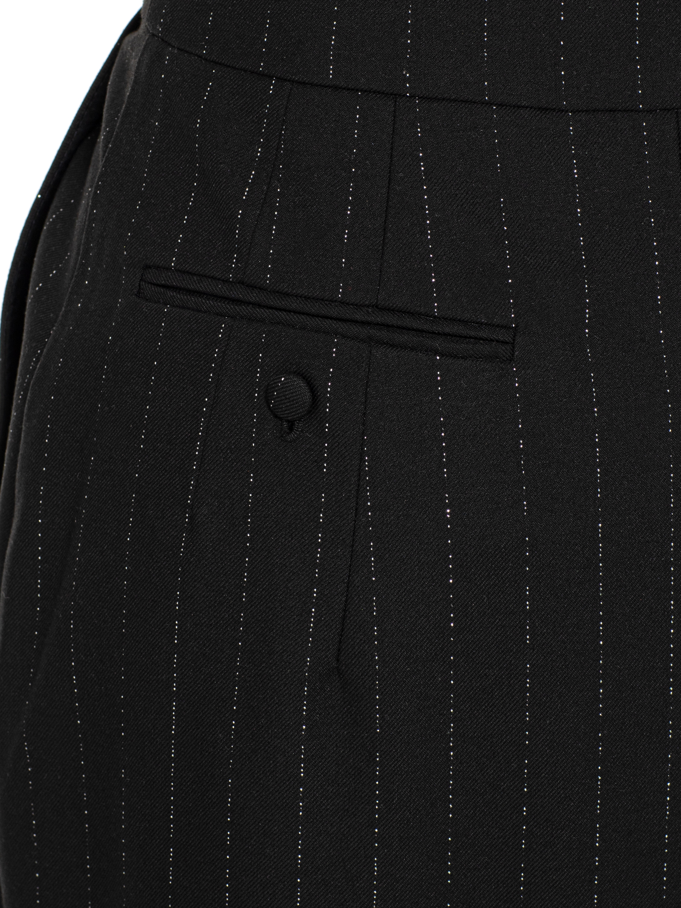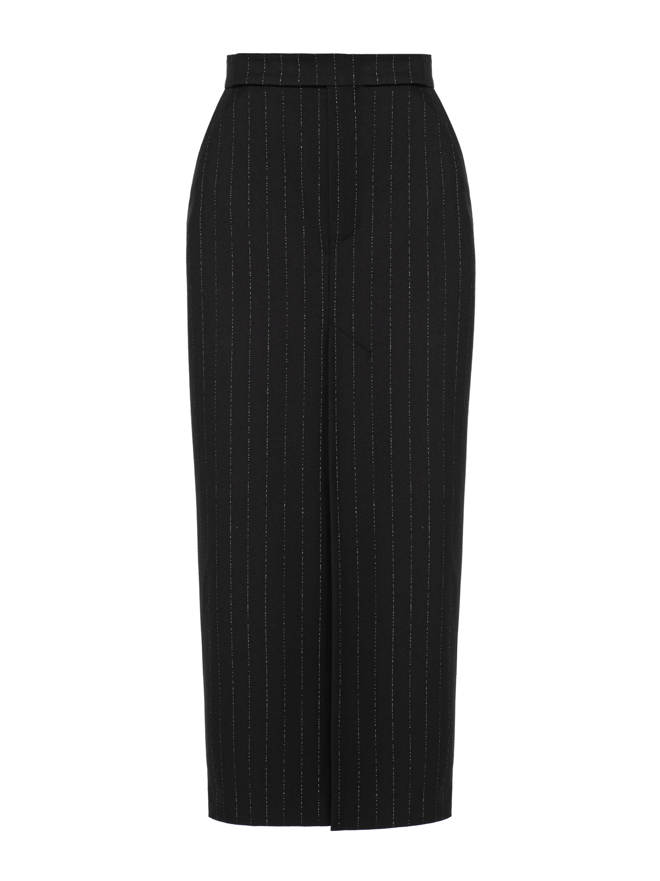The classic black maxi skirt is made of suiting fabric with a vertical stripe. The refined piece is complemented by a practical front slit for ease of movement. Length from waistband to hem is 94.5 cm.