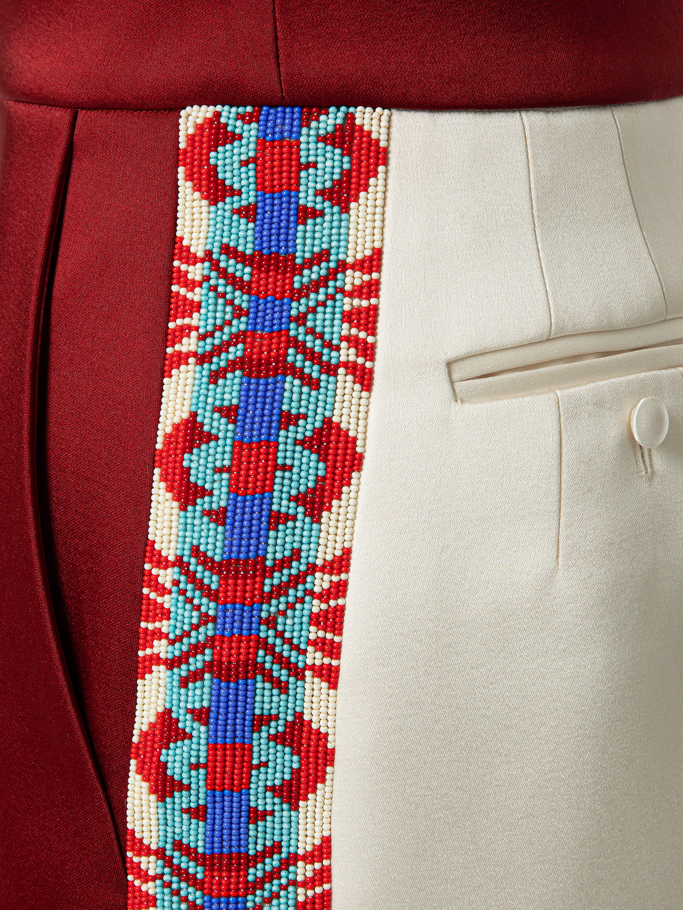 A two‑tone midi skirt with pockets, made of burgundy and milk‑coloured viscose‑based fabric. The model is decorated with bead embroidery featuring ethnic motifs along the side stripes (lambrequins).