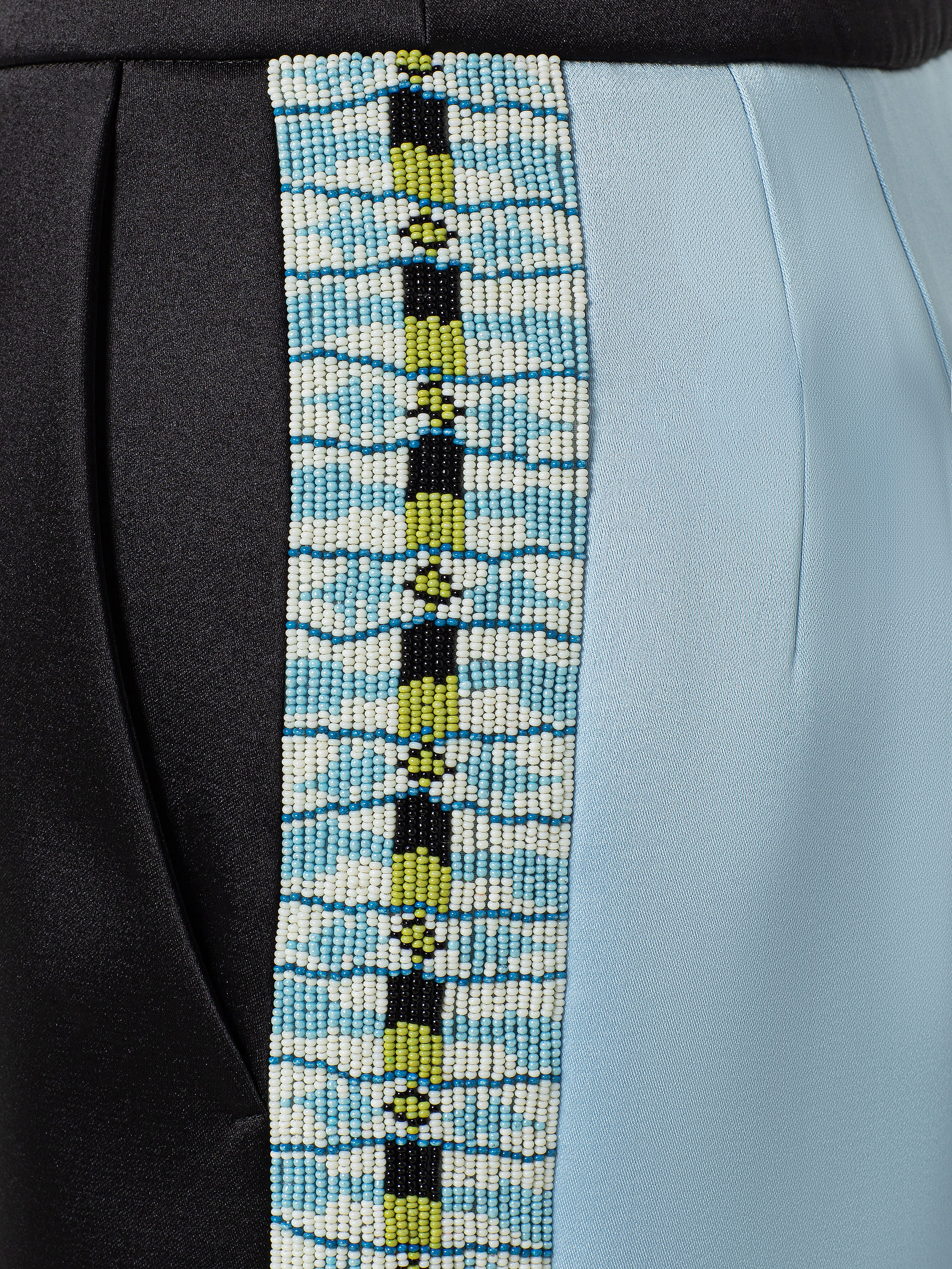 A two‑tone midi skirt with pockets, made of black and light blue viscose‑based fabric. The model is decorated with hand‑beaded embroidery featuring ethnic motifs along the stripes (lambrequins).