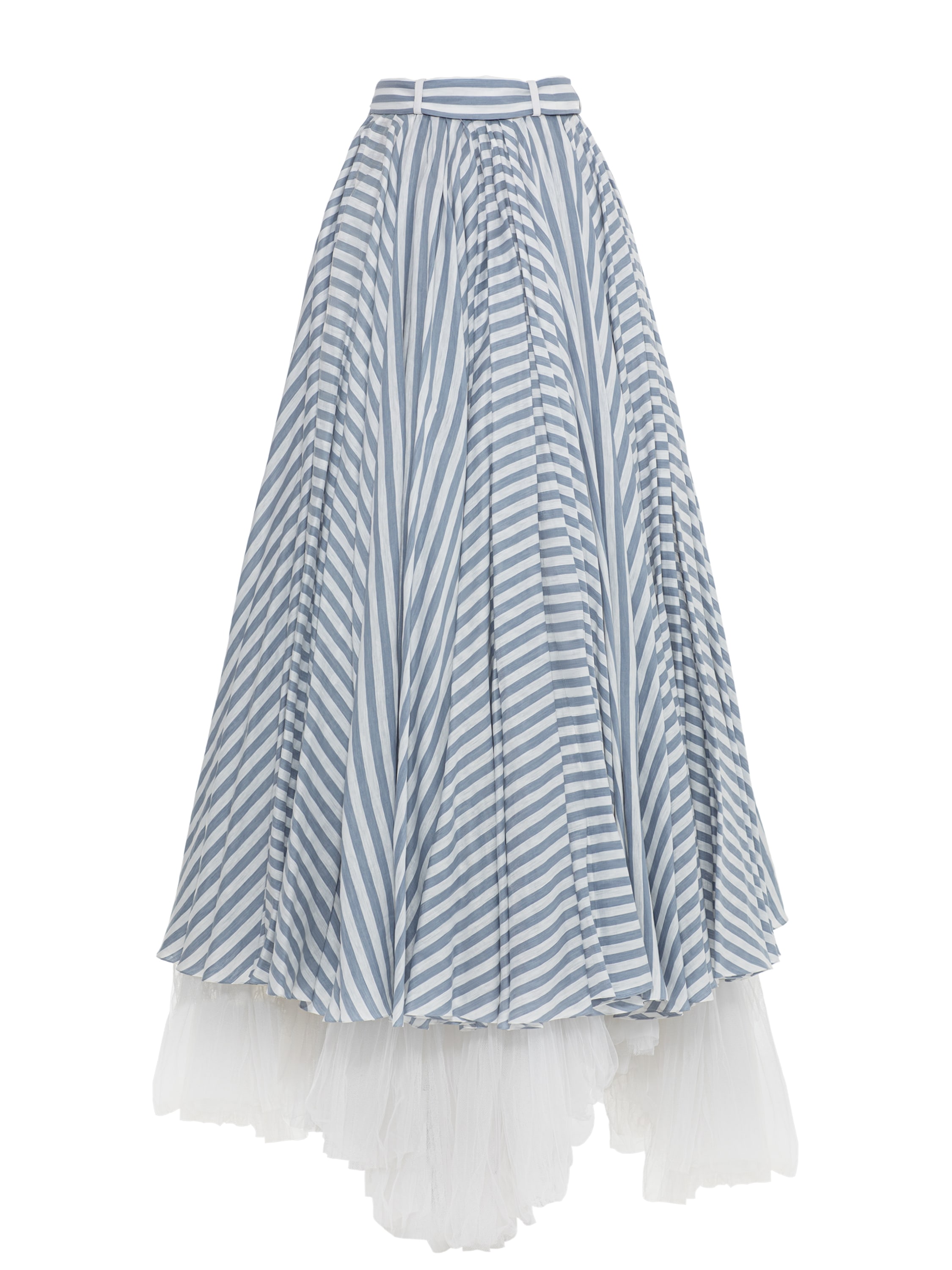 A white double-layered striped maxi skirt in blue is made of cotton fabric. The high-waisted model draws attention to the waistline.