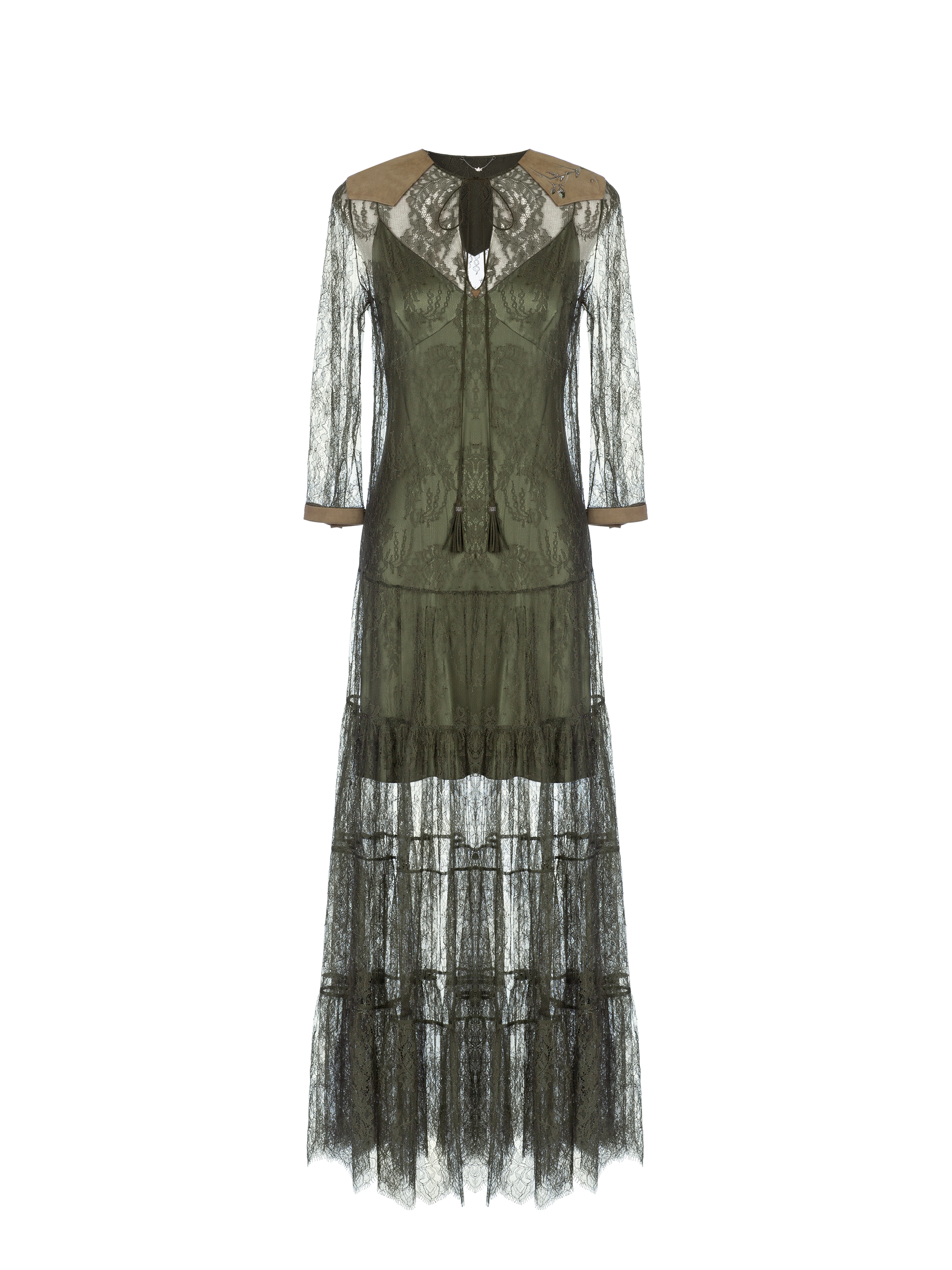The green midi dress with 3/4 sleeves is made of semi-sheer lace. The model is complemented by brown genuine suede inserts on the shoulders and sleeves, bead embroidery, and tasseled ties at the chest. The dress comes with a matching silk slip.