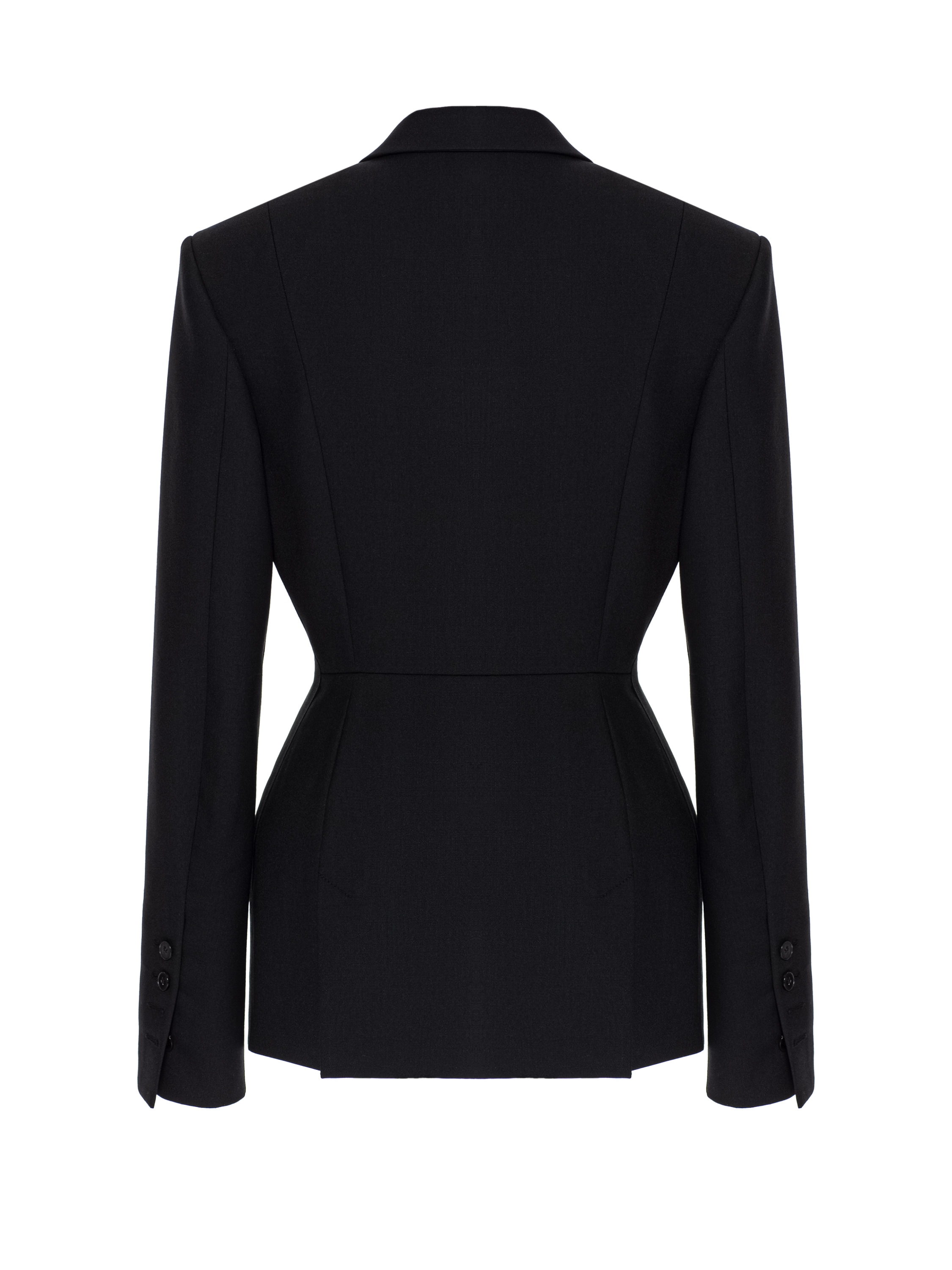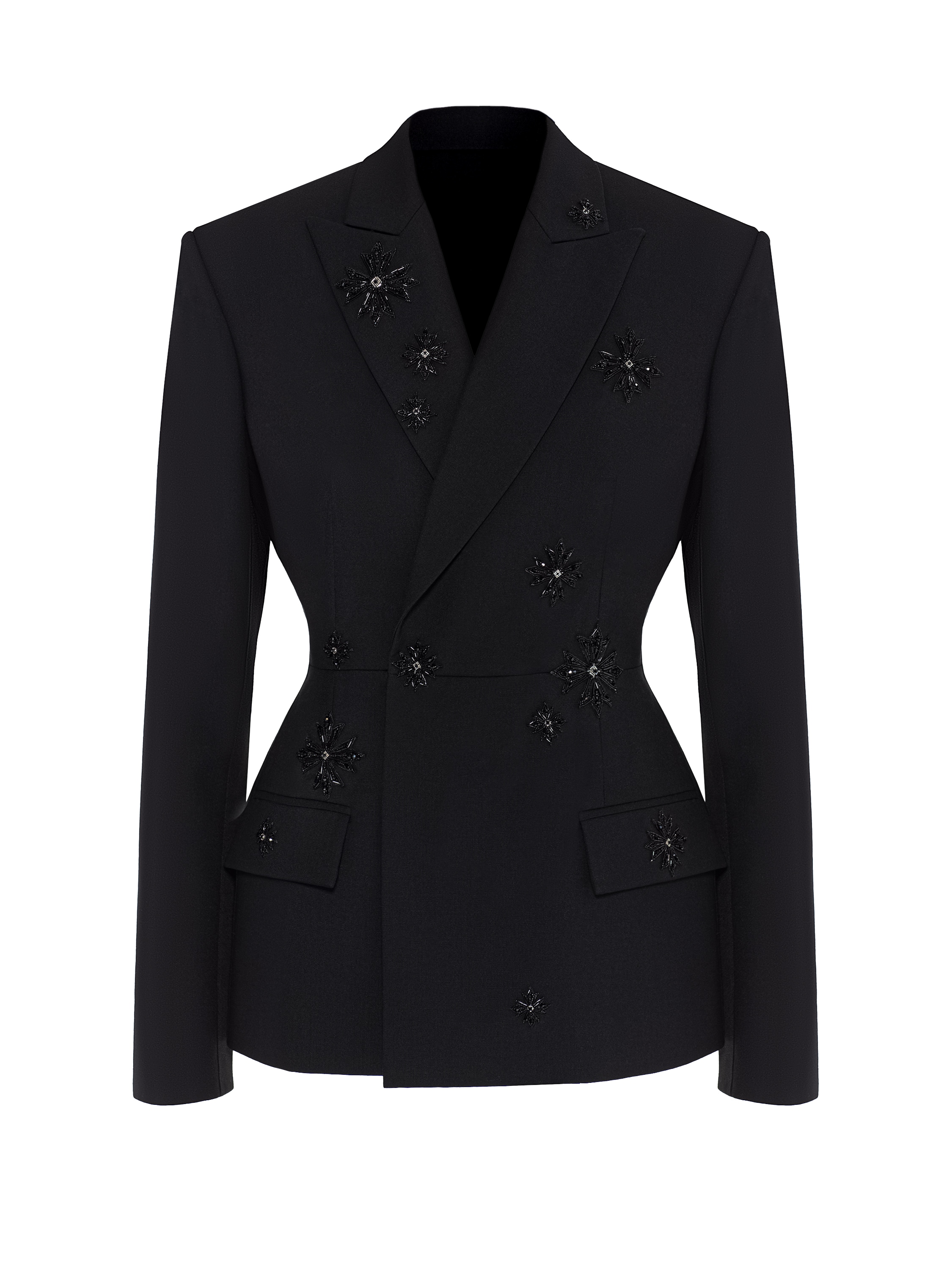 An elegant fitted jacket is made of black wool suiting fabric. The double-breasted model with shaped lapels is complemented by a bustle and flap pockets. The decoration of the item (embroidery with beads, bugle beads, bicone beads) took the craftsmen of the YANA Fashion House 58 hours of handwork.