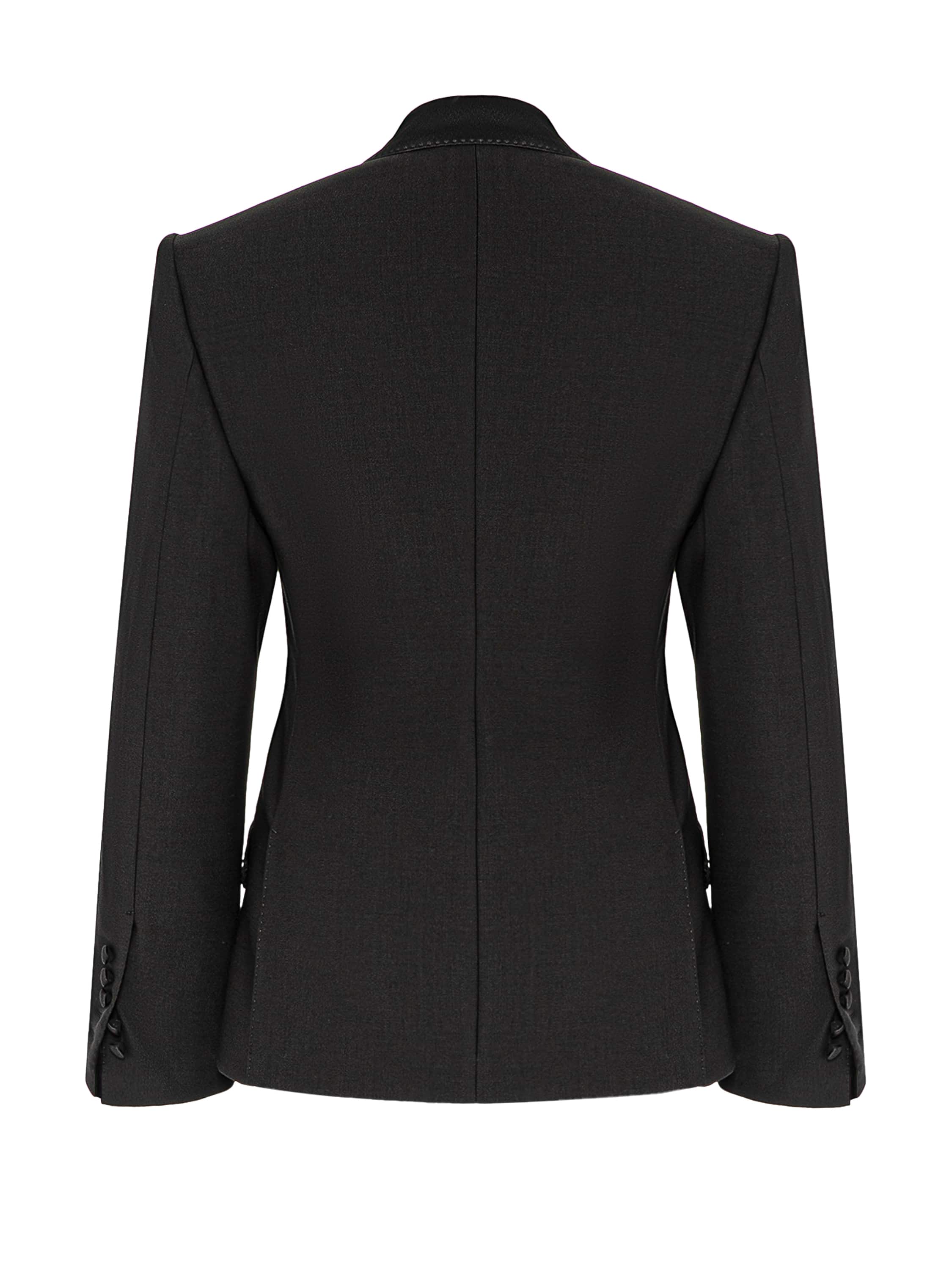 The double-breasted blazer made of black suiting fabric is an elegant classic with expressive accents: figured satin lapels, flaps and covered buttons. 12 hours of painstaking handwork — this is how long the masters of the Yana Fashion House spent on puffing-technique finishing.