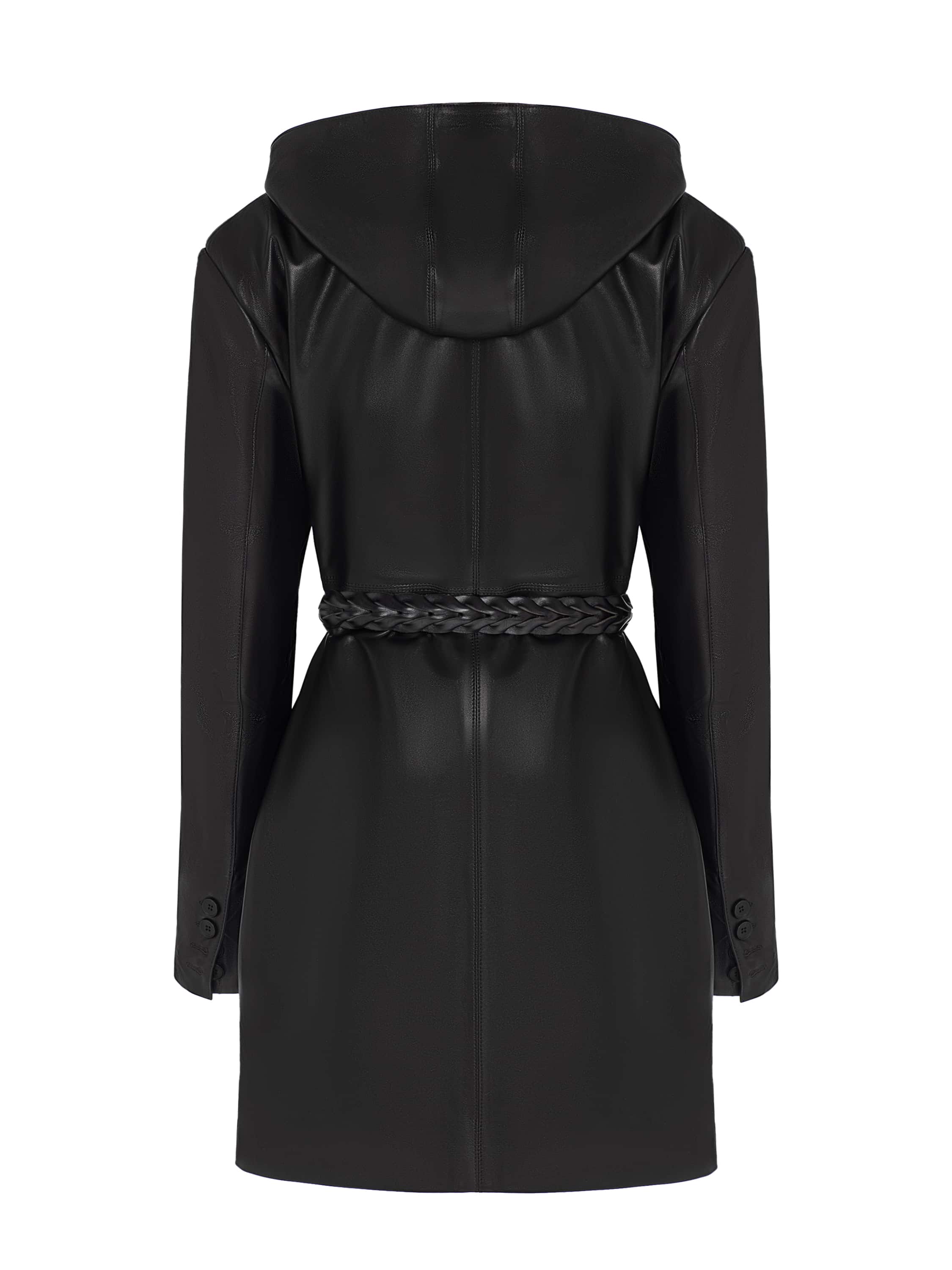 The double-breasted elongated blazer is sewn from genuine leather in a black shade. The piece is complemented by a hood. A braided belt comes with the blazer. Flap pockets on the sides.