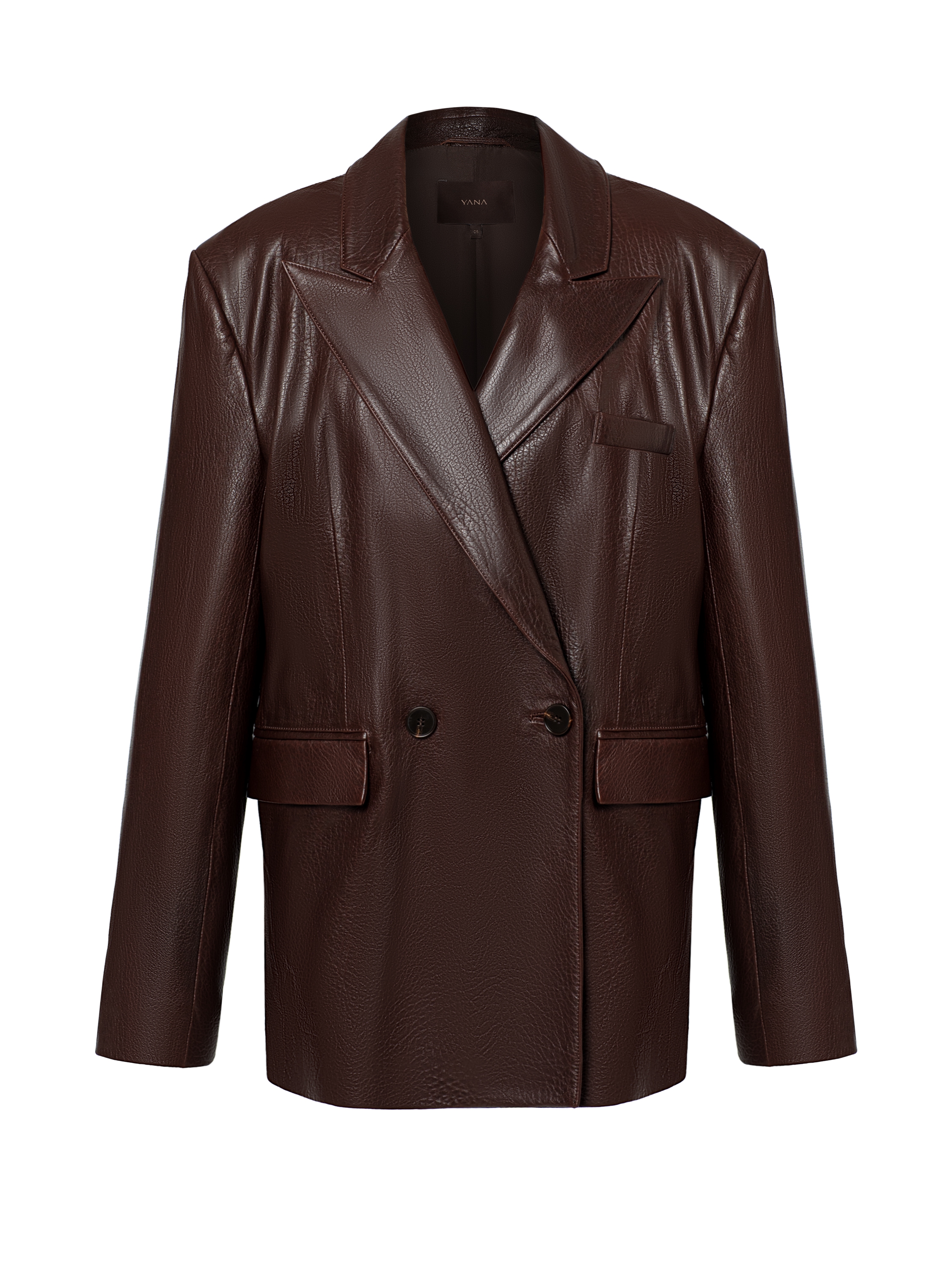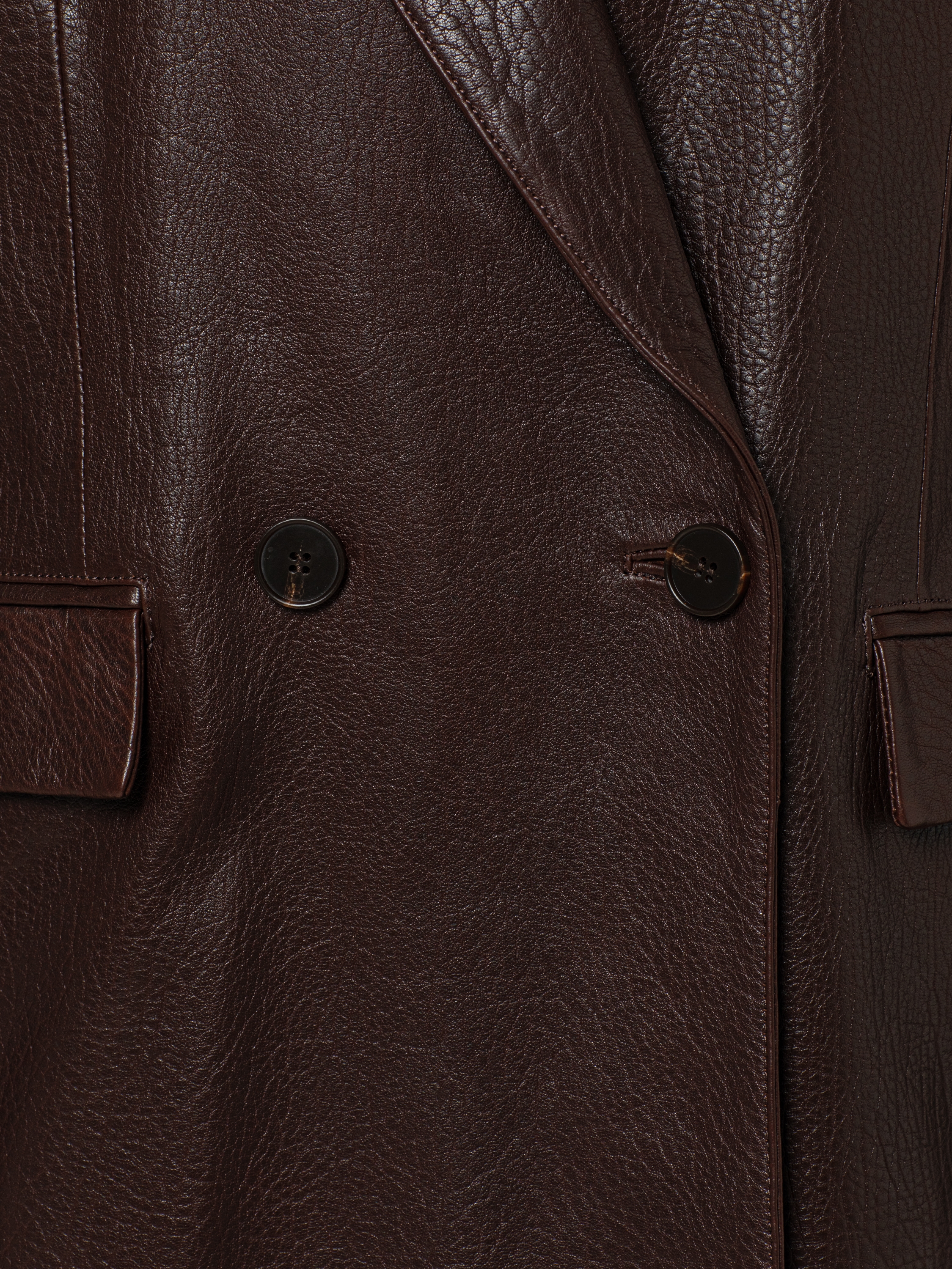 The double-breasted brown leather jacket with broad shoulders gives the look a striking graphic quality. The model with two vents is complemented by flaps and shaped lapels.