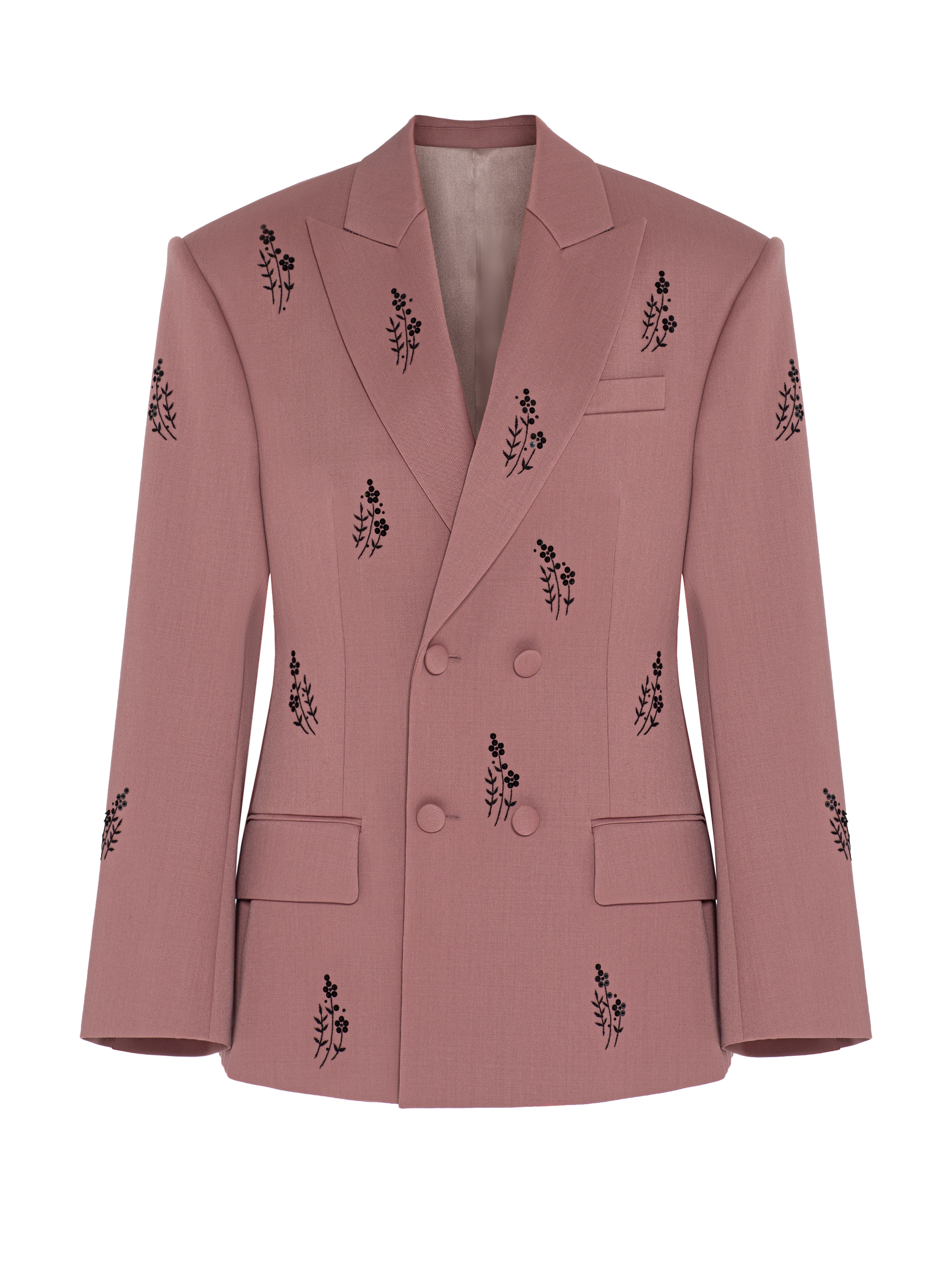 A double-breasted blazer made of suiting fabric in an antique rose color is the perfect way to emphasize your natural beauty. Its delicate shade surprisingly matches any skin tone, creating the effect of a soft, healthy blush. The blazer is decorated with exquisite floral embroidery with mouline threads, sequins and beads, which took the craftsmen of the Yana fashion house 42 hours of handwork.