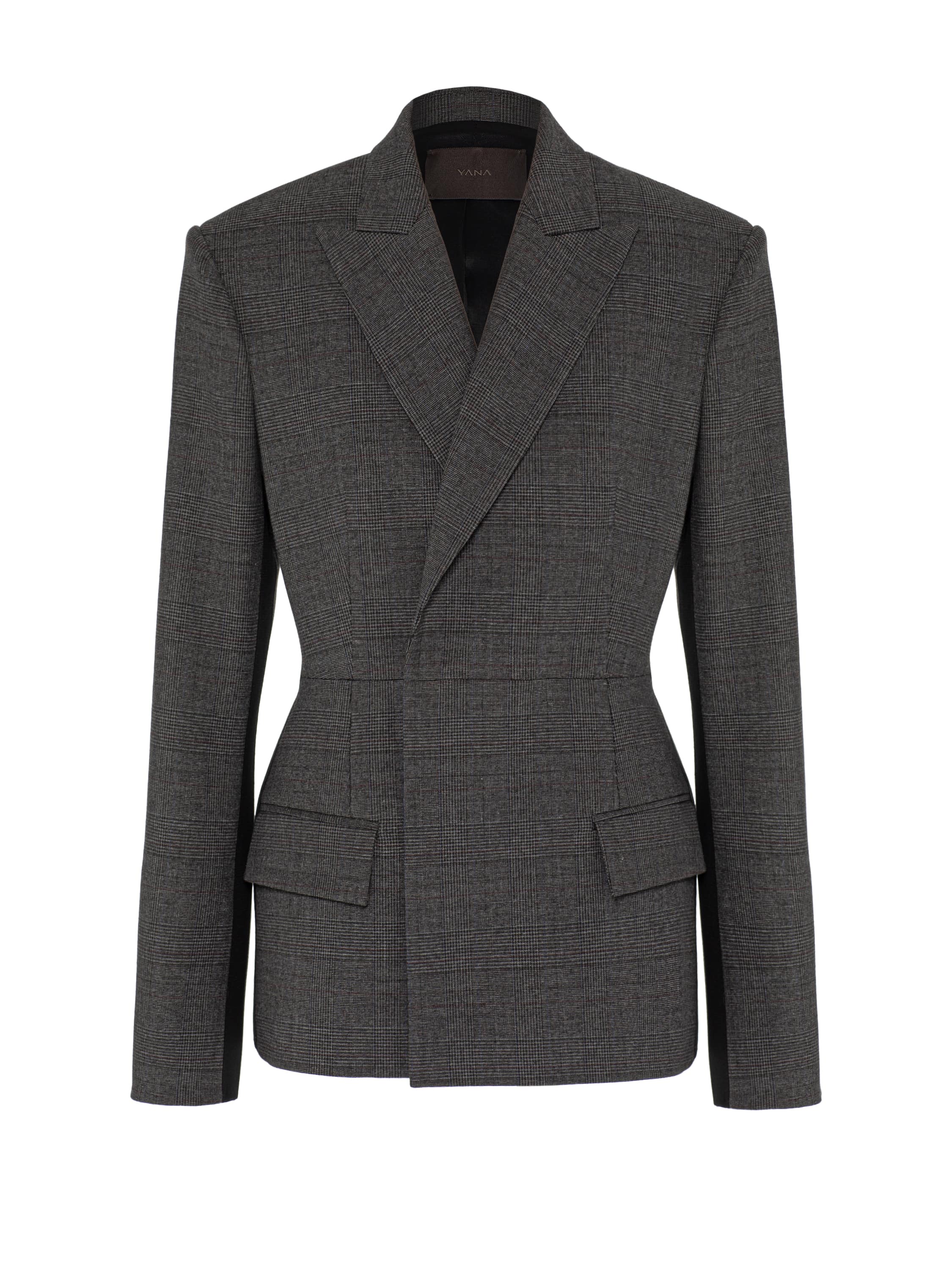 The double-breasted blazer with statement shoulders is a unique model in which minimalism, embodied in the strict geometry of the silhouette, becomes an expression of inner strength and captivating femininity. The item is made of suiting fabric in a noble grey shade with a subdued check pattern. A classic pencil skirt from the new Yana collection will be the perfect complement to the look.