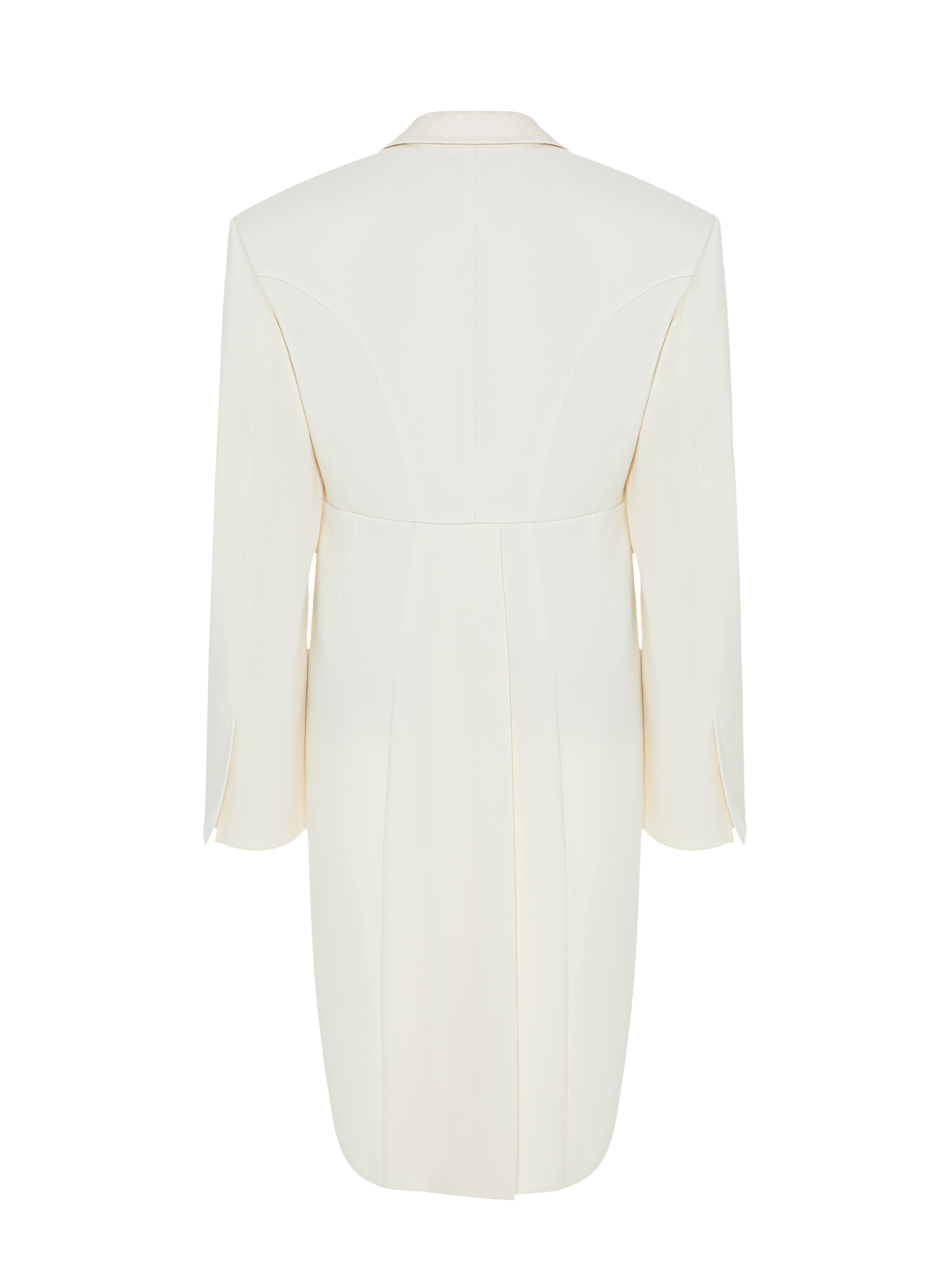 The off‑white tailcoat jacket with shaped satin lapels will become a striking element of the look. The piece is made of premium-quality suiting wool fabric.