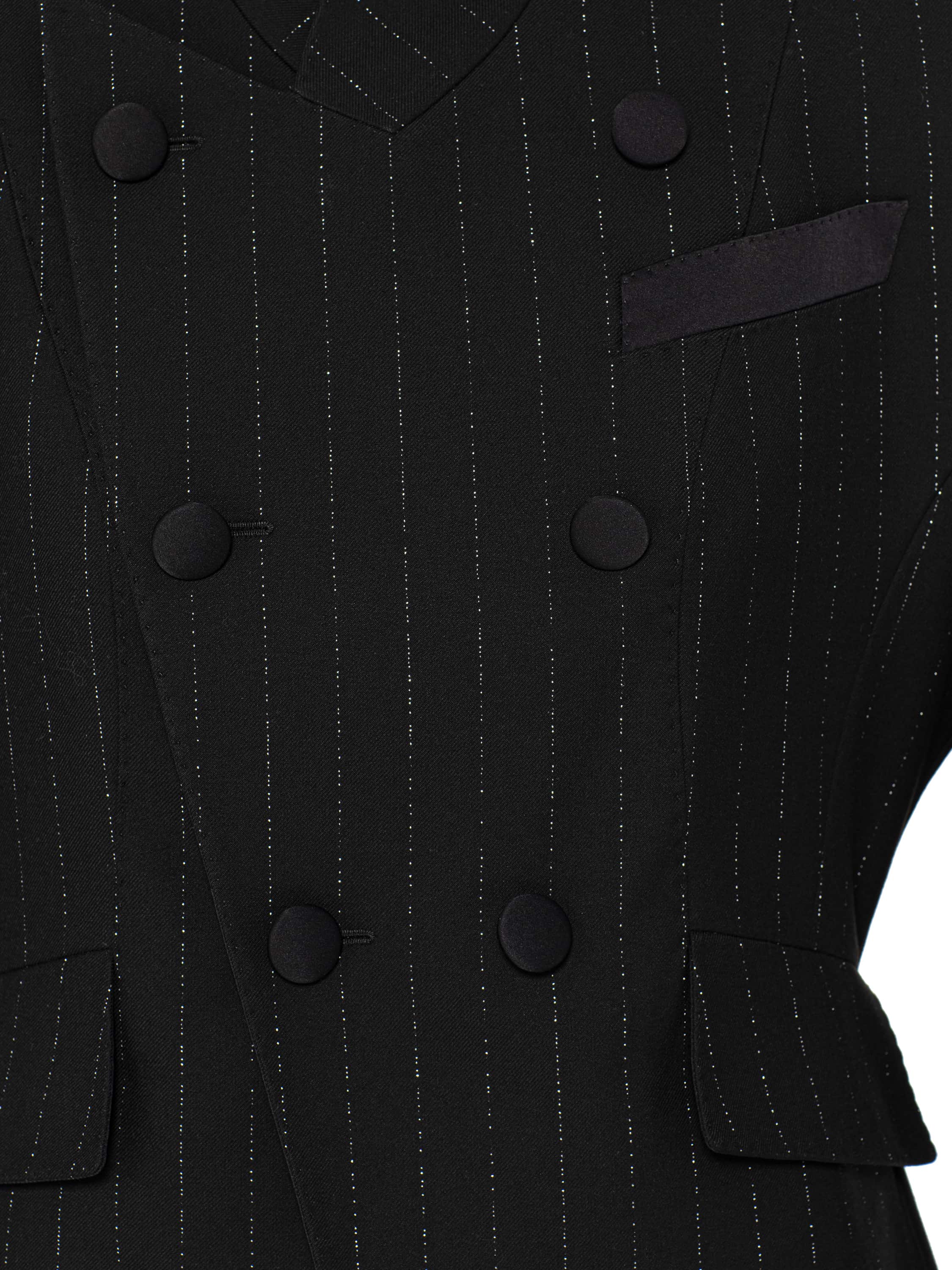 A cropped double-breasted jacket made of black pinstripe suiting fabric. The model with a stand-up collar is complemented by flaps, a welt pocket and fabric-covered buttons.