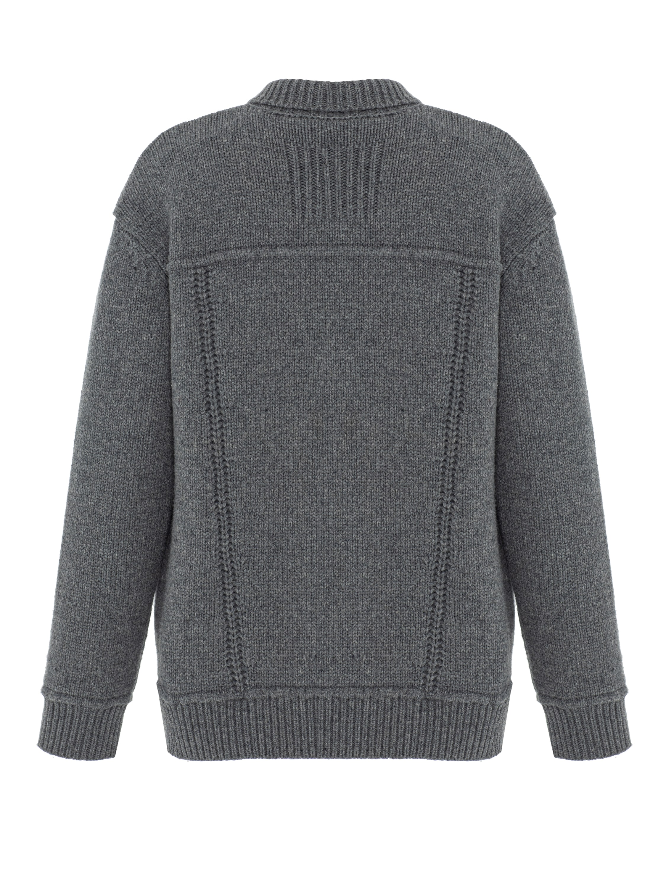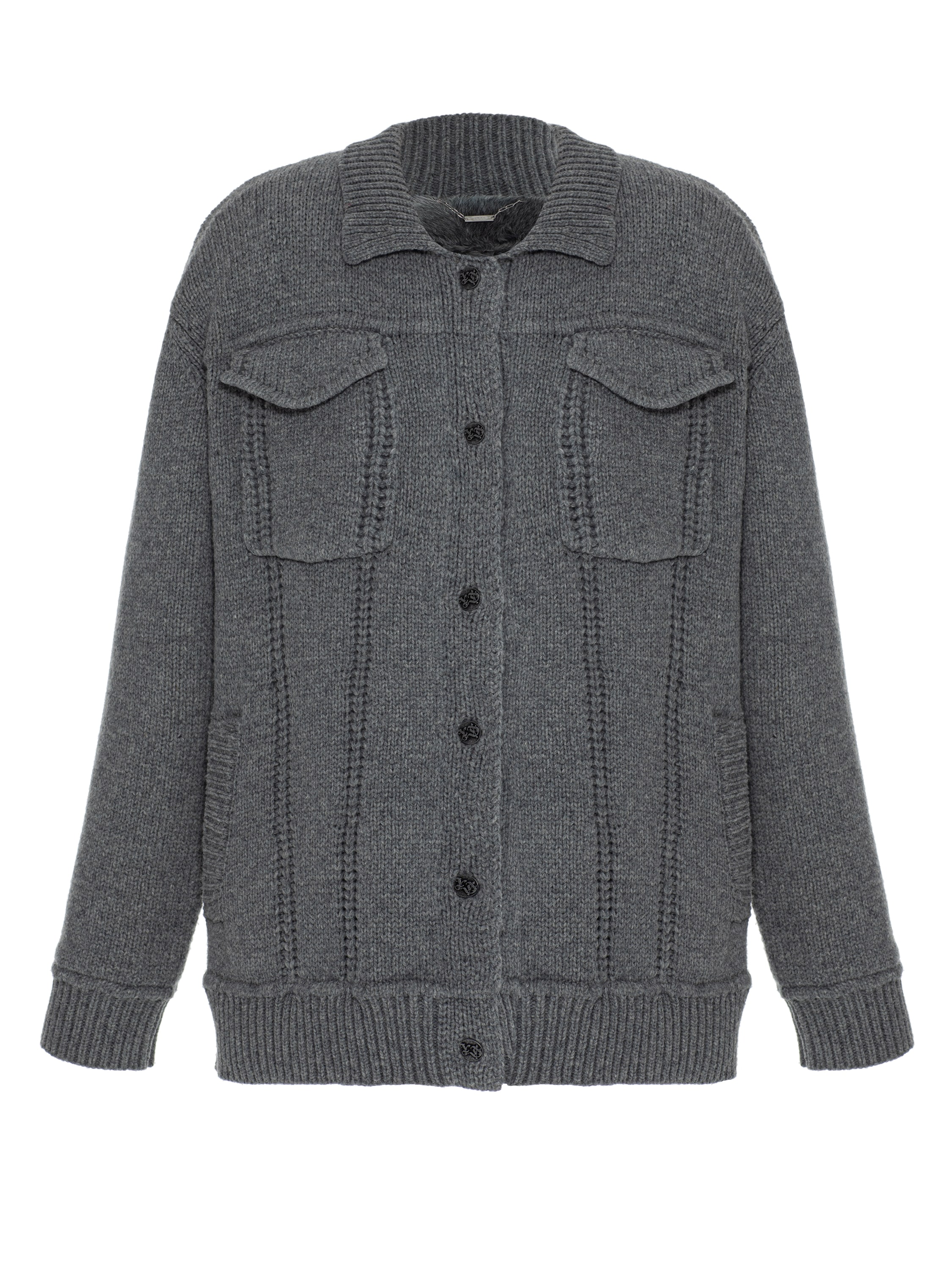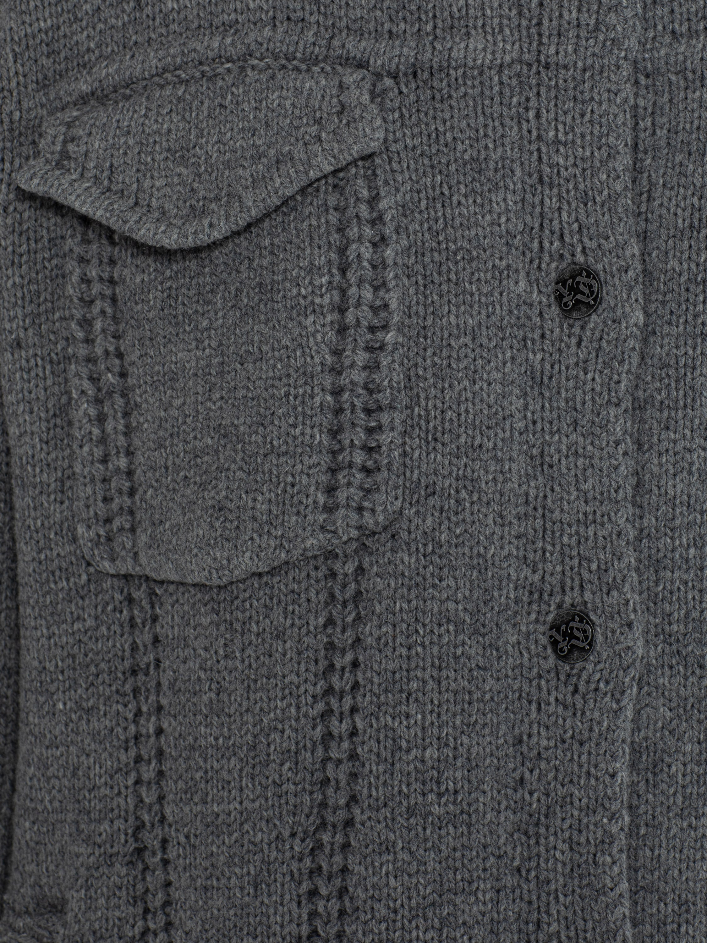 The men’s gray knitted cardigan is made of premium-quality natural wool yarn. The model is complemented by a karakul fur lining. Fastens with branded logo buttons.