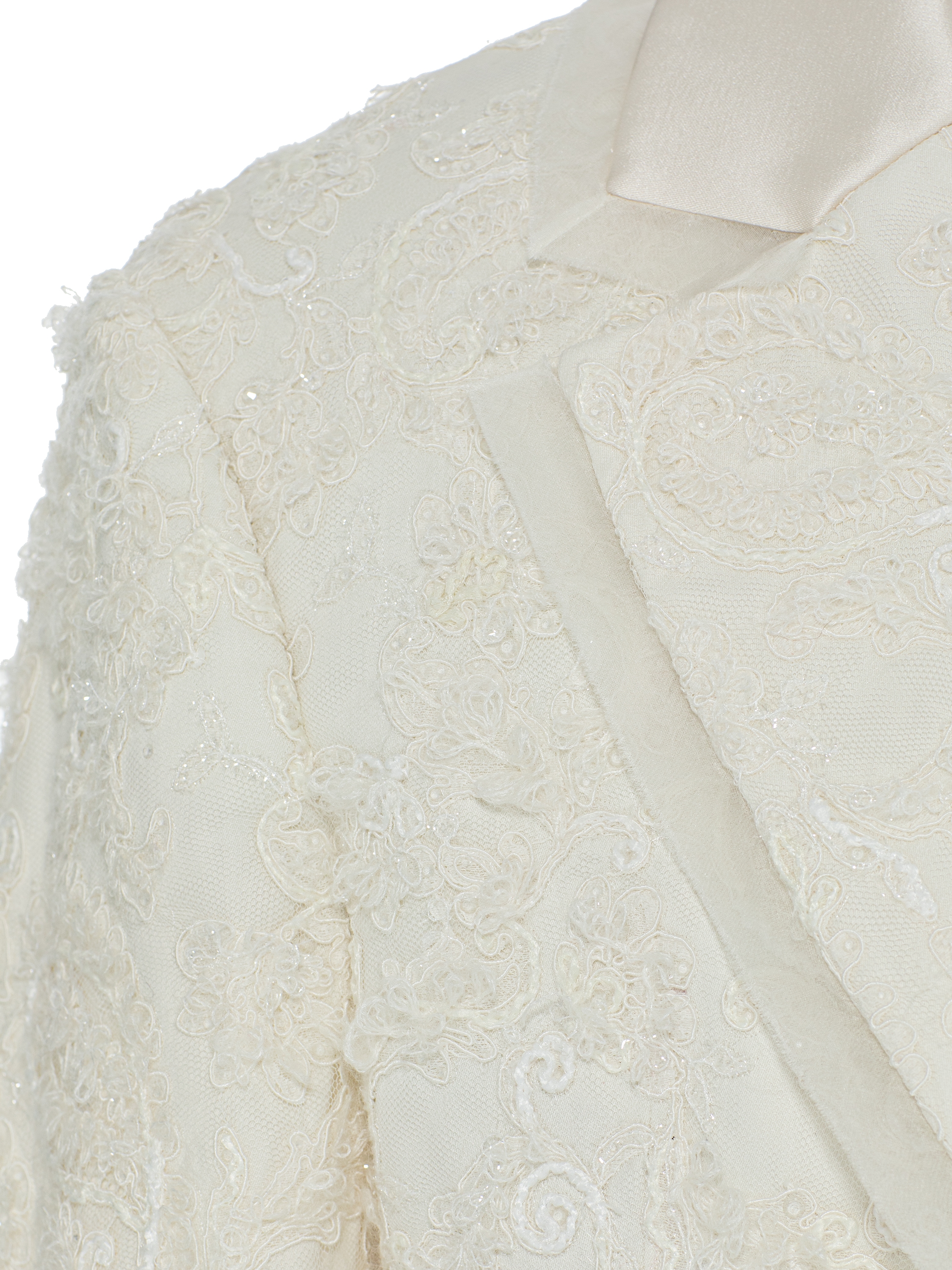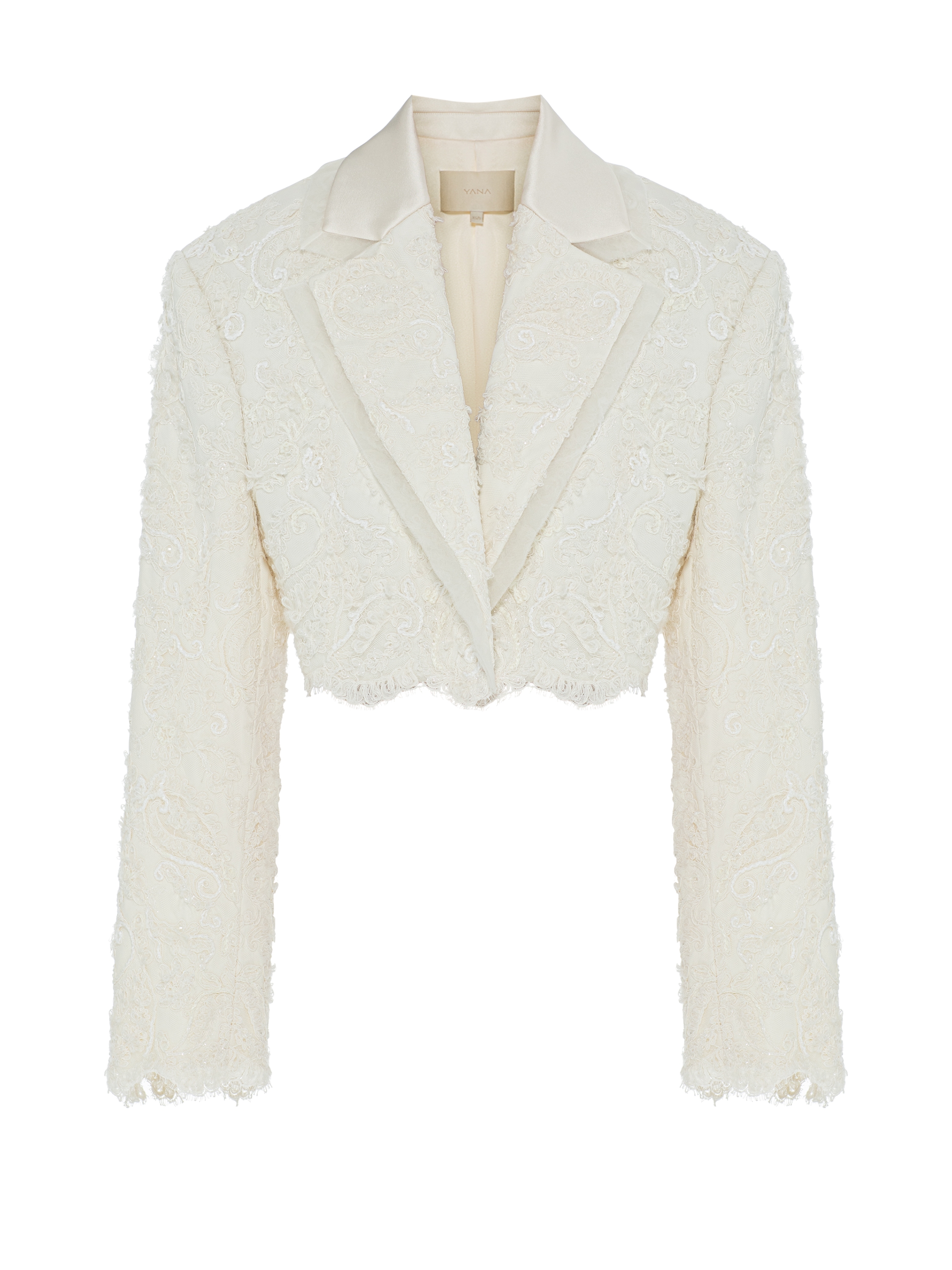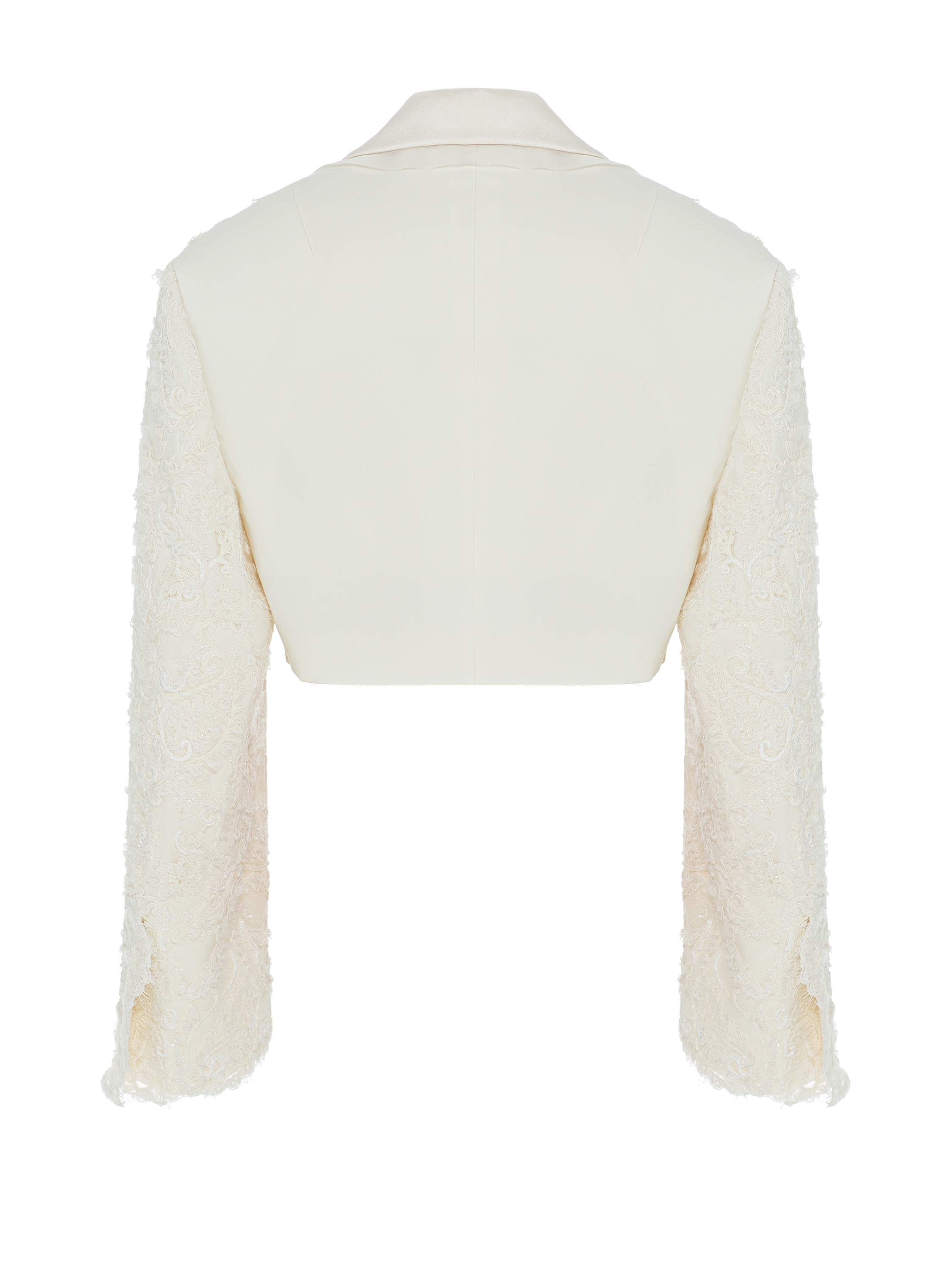 The cropped, broad-shouldered jacket is made of ivory wool suiting fabric. The style is adorned with exquisite embroidery featuring textured organza elements.