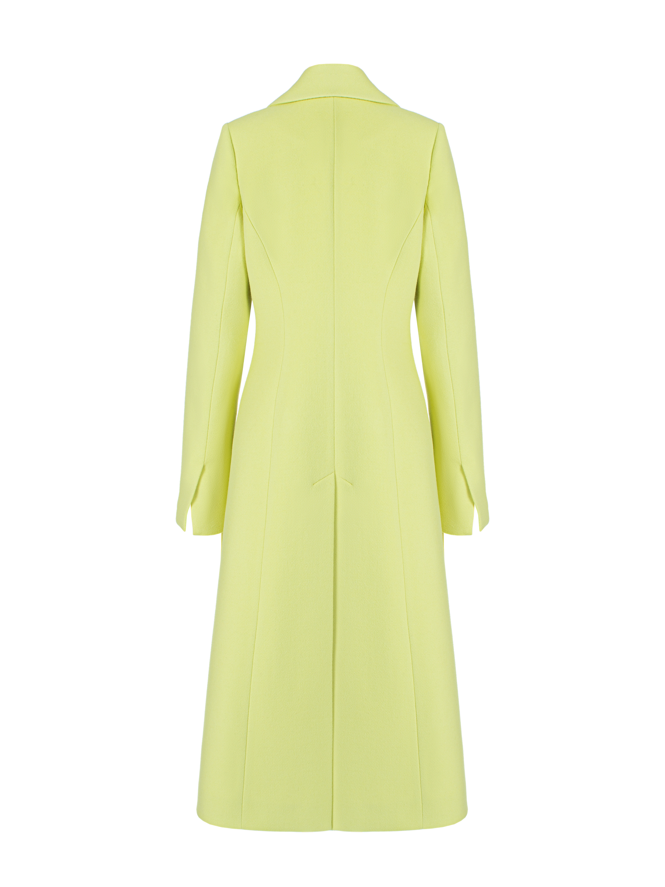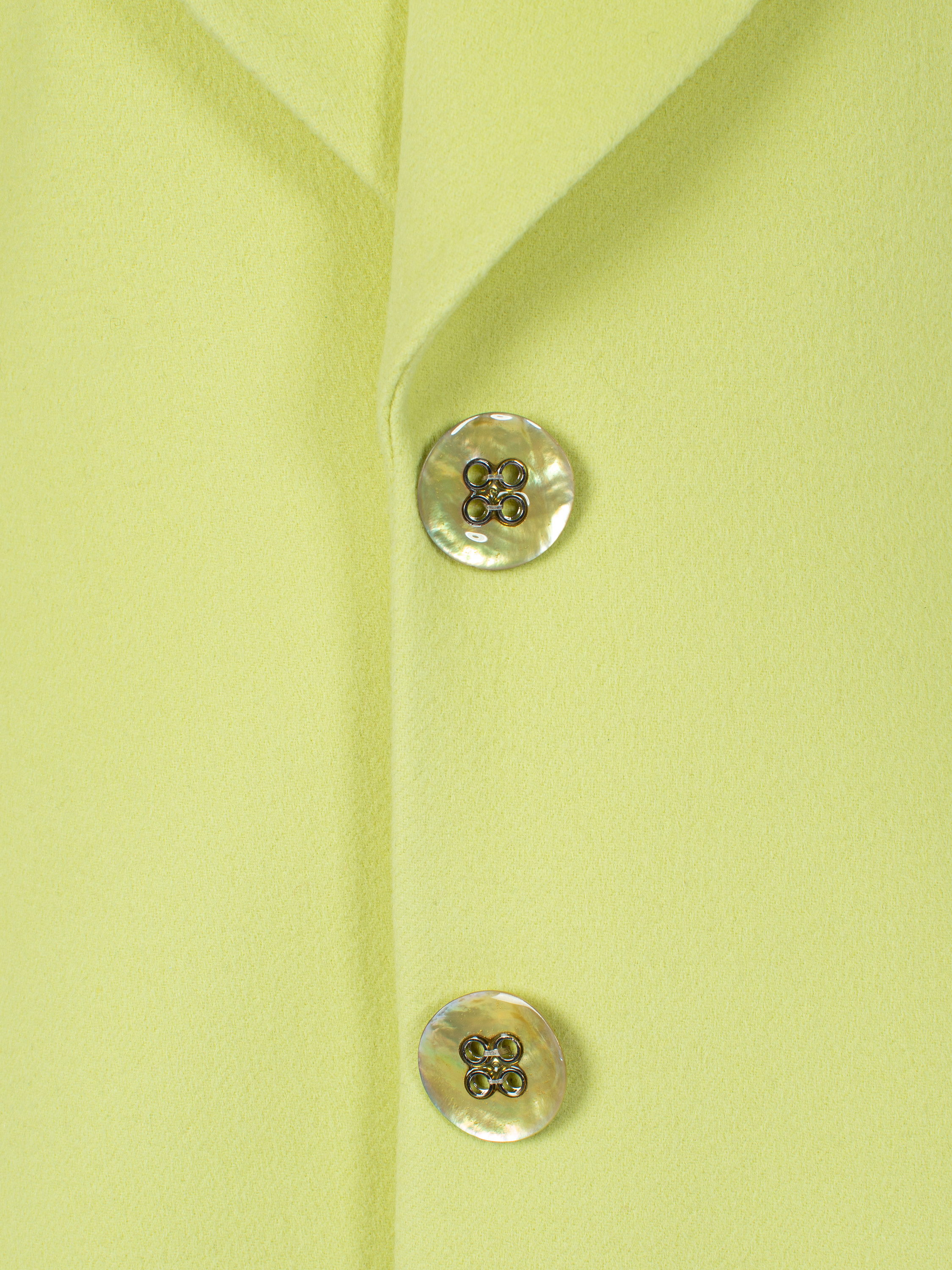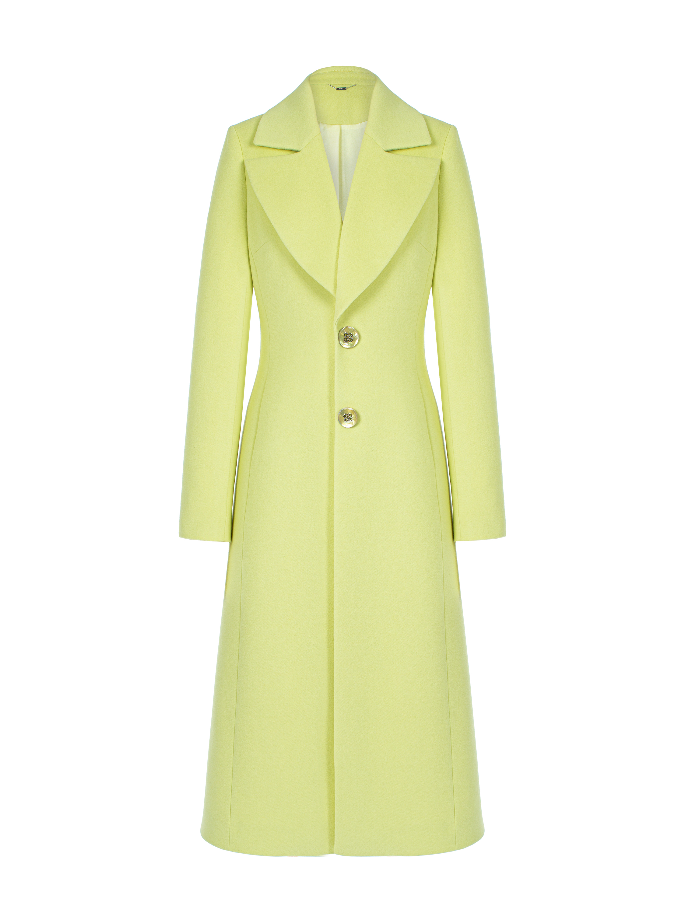 The yellow single-breasted fitted coat turned out to be exceptionally comfortable. Soft yet dense wool was used for the tailoring, which blocks the wind and keeps warmth inside. The style is finished with wide shaped lapels and slits on the long sleeves. It fastens at the front with mother-of-pearl buttons.