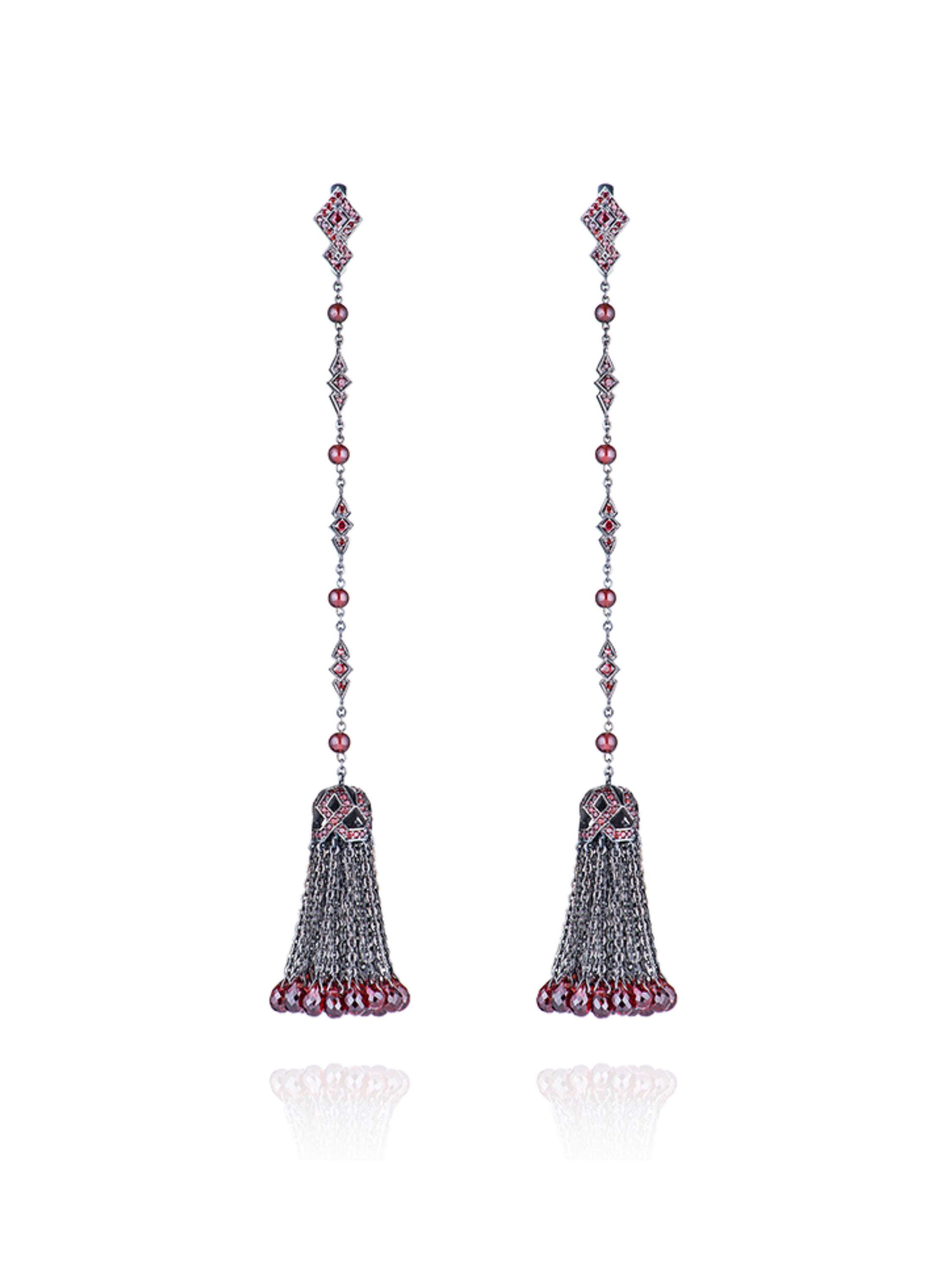 Tassel earrings made of blackened gold with 50 briolette-cut garnets weighing 18.42 ct, 206 round garnets weighing 1.98 ct, and 8 garnet beads weighing 0.43 ct. Item length: 12 cm.