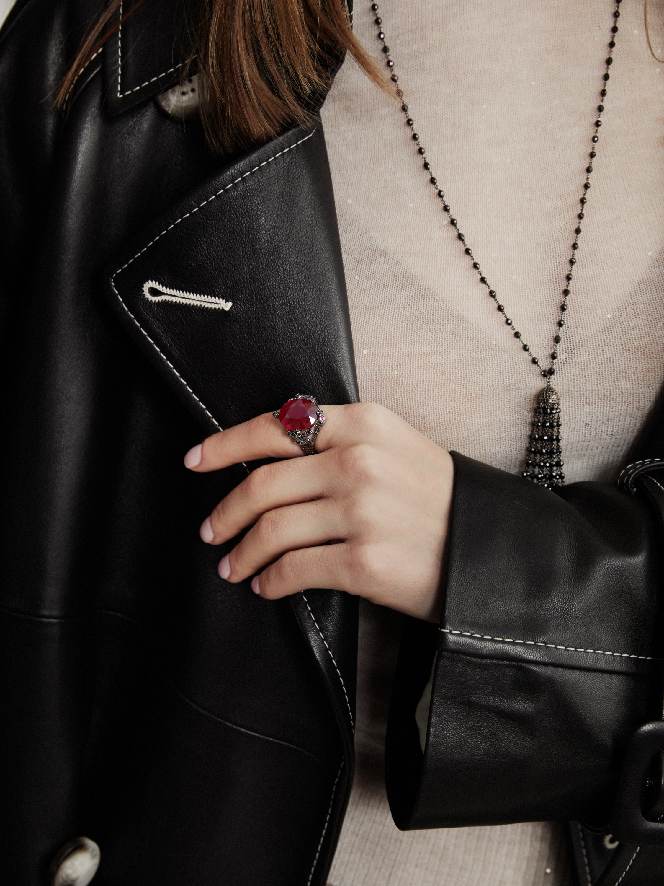 A ring made of blackened gold, inlaid with an oval ruby weighing 12.74 ct, 3 princess-cut rubies with a total weight of 0.26 ct, and 400 black diamonds with a total weight of 1.95 ct.