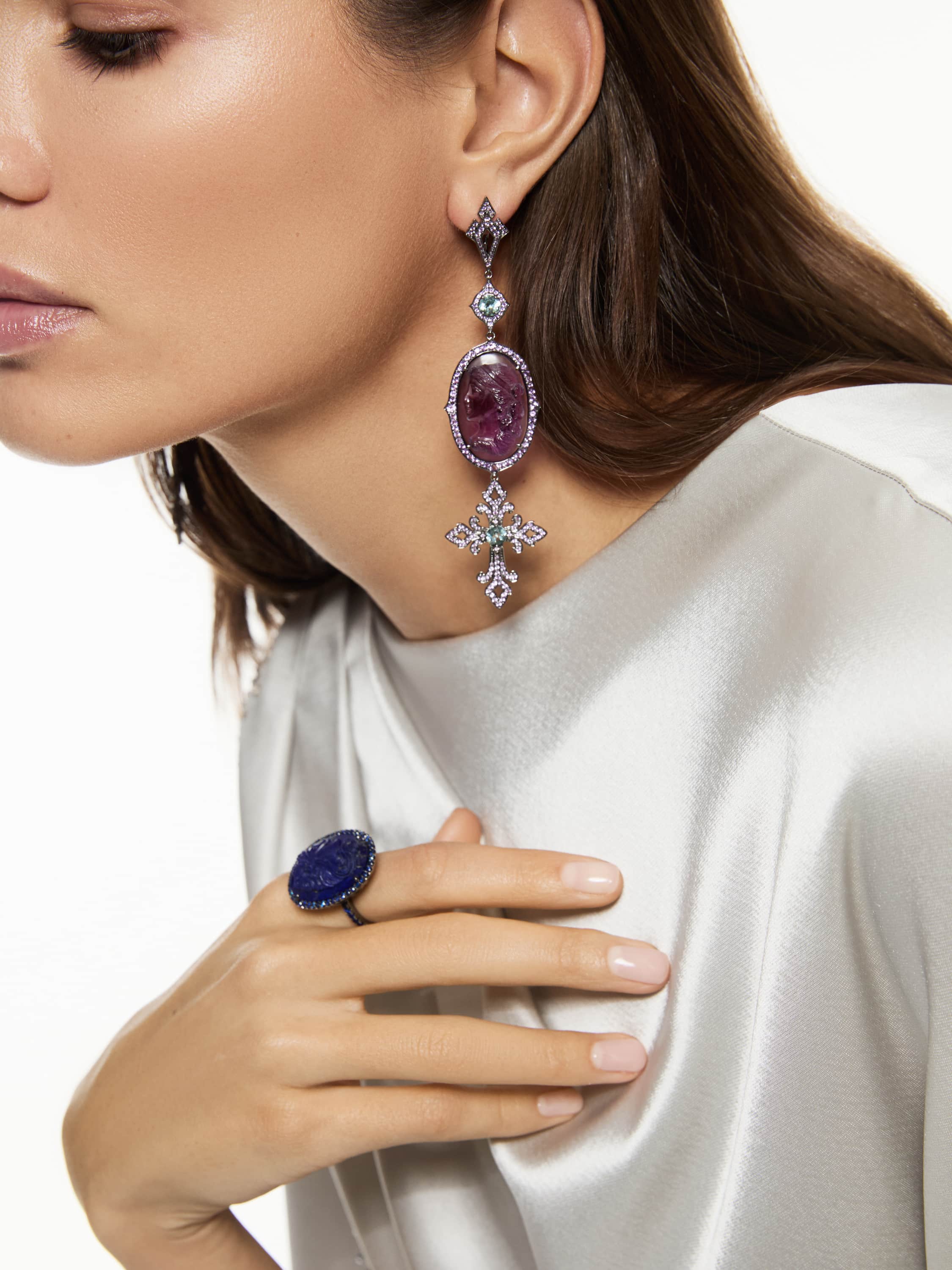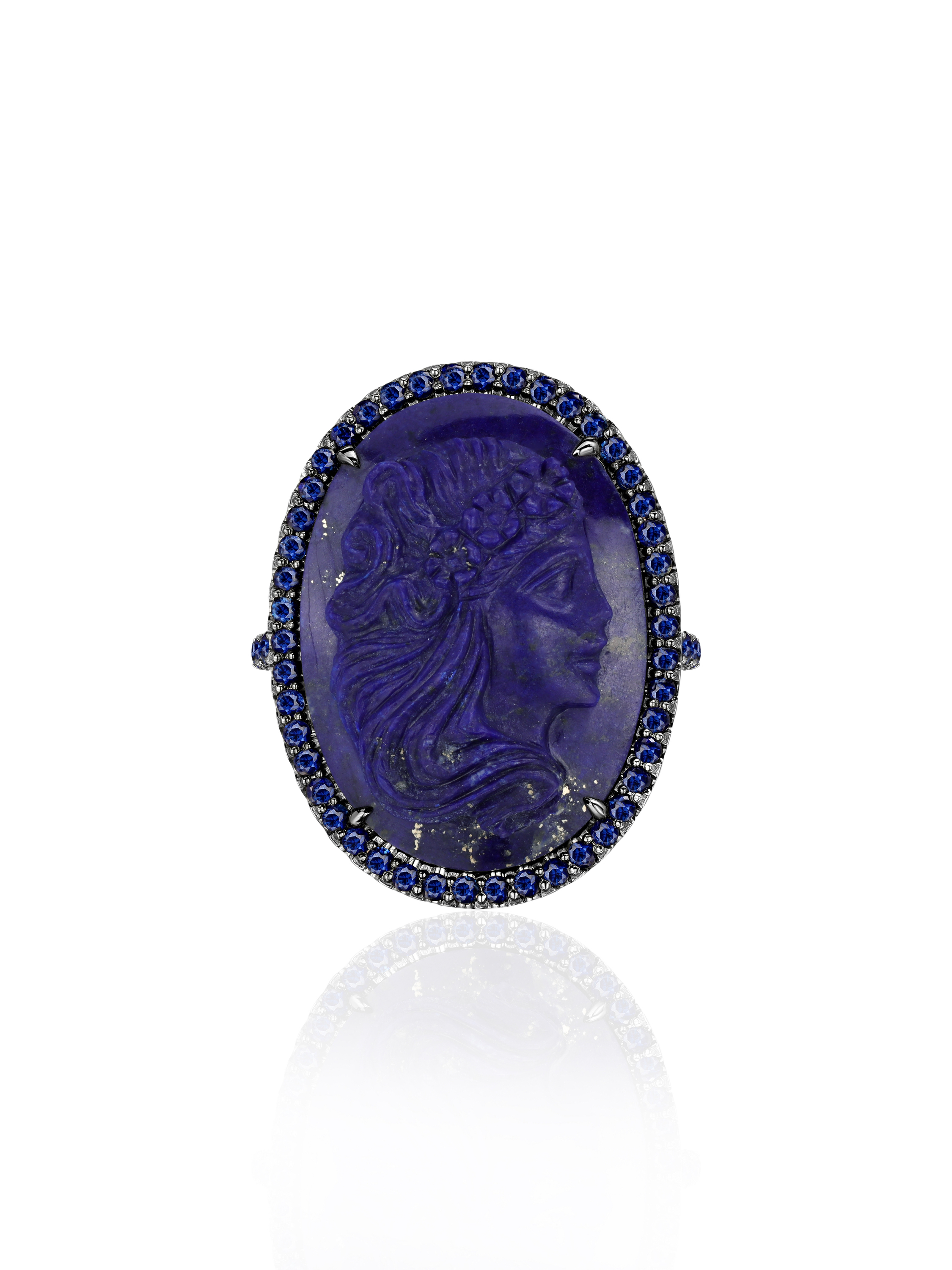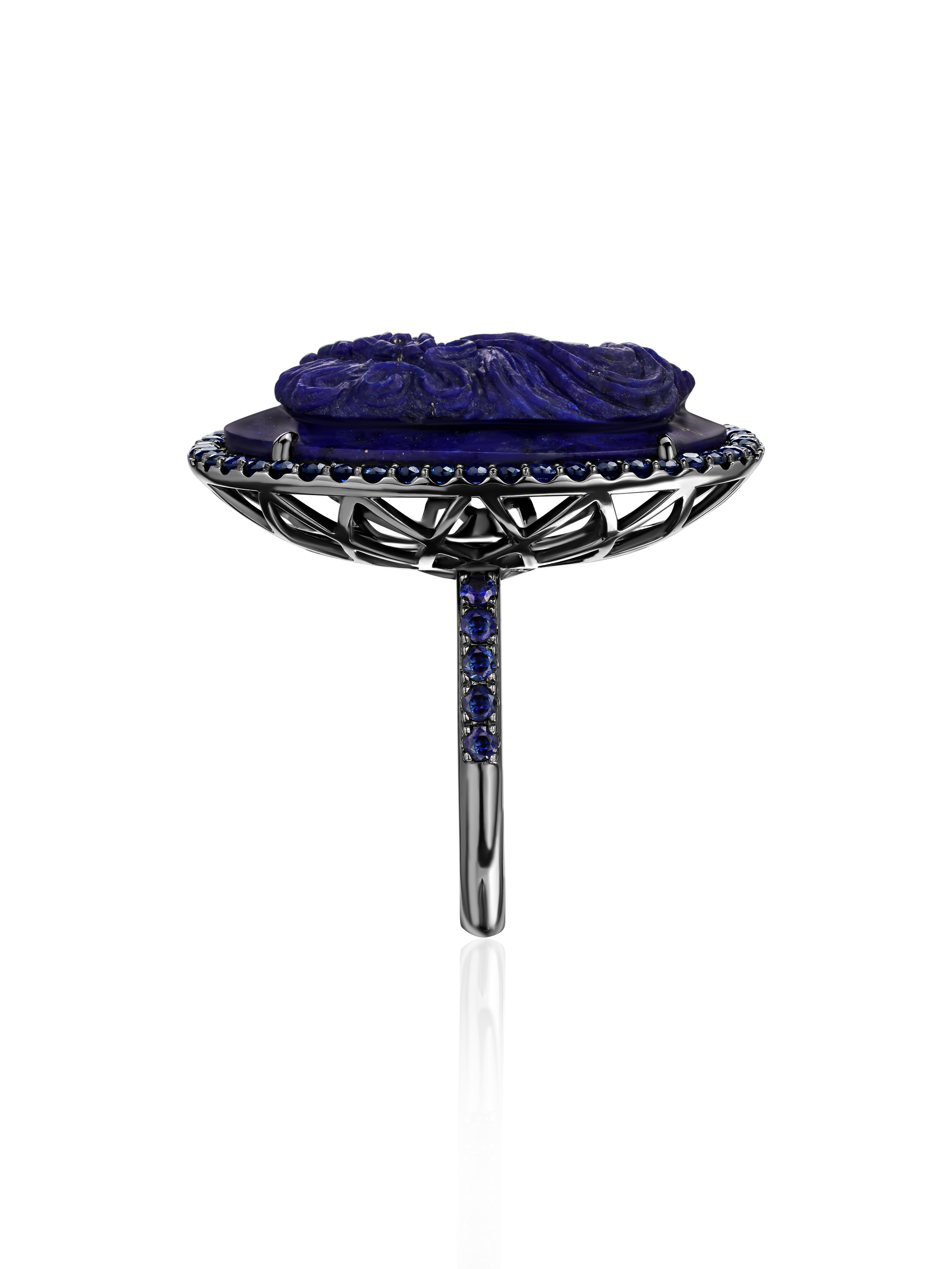 Ring in blackened gold with a cameo on lapis lazuli weighing 19.79 ct and 56 sapphires with a total weight of 1.19 ct.