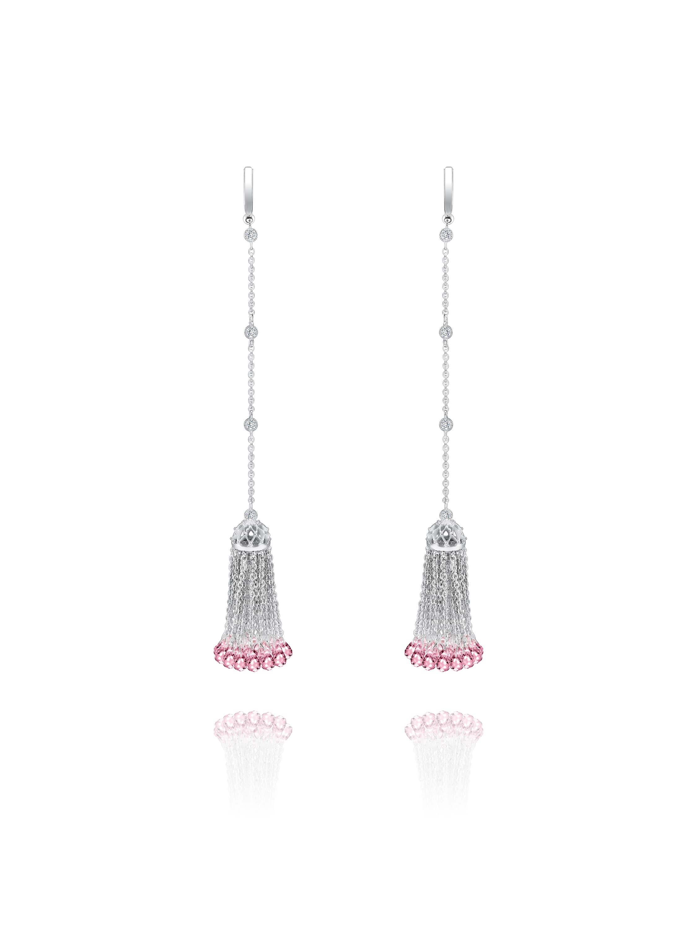 Short tassel earrings in white gold with 50 rose quartzes of briolette cut with a total weight of 15.02 ct, and 8 colorless topazes with a total weight of 0.3 ct. Item length – 10 cm.