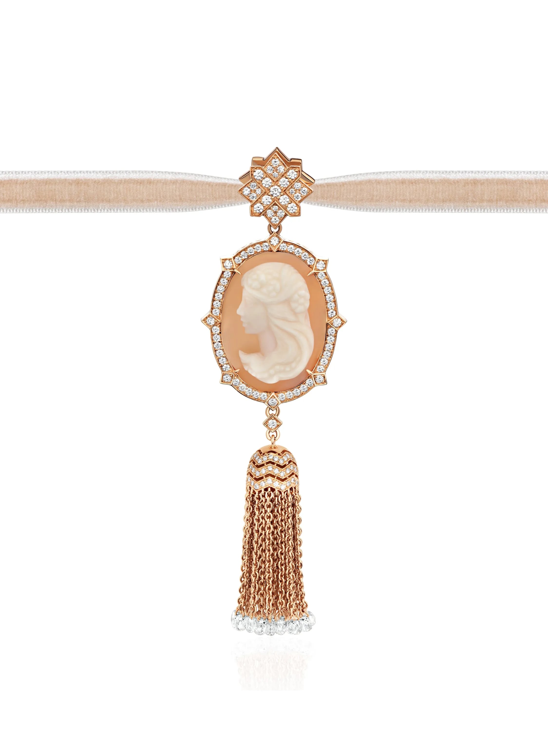 Tassel pendant in rose gold, encrusted with a shell cameo weighing 1.77 g, 29 briolette-cut diamonds with a total weight of 2.76 ct, and 150 round-cut diamonds with a total weight of 0.95 ct.