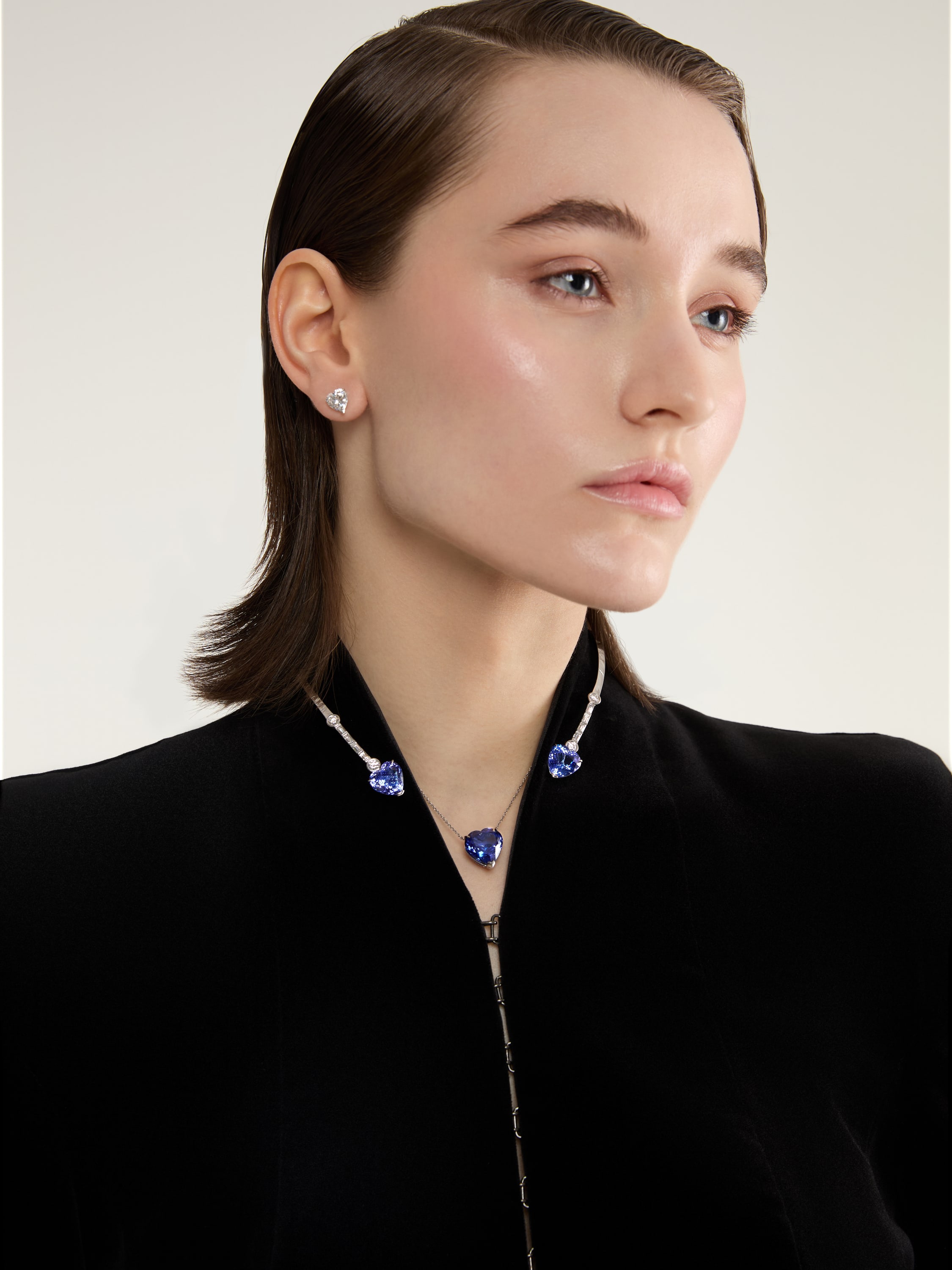 Necklace in white gold with a heart-cut tanzanite pendant weighing 8.6 ct, 140 round diamonds with a total weight of 1.03 ct, and 1 briolette-cut diamond weighing 0.09 ct.