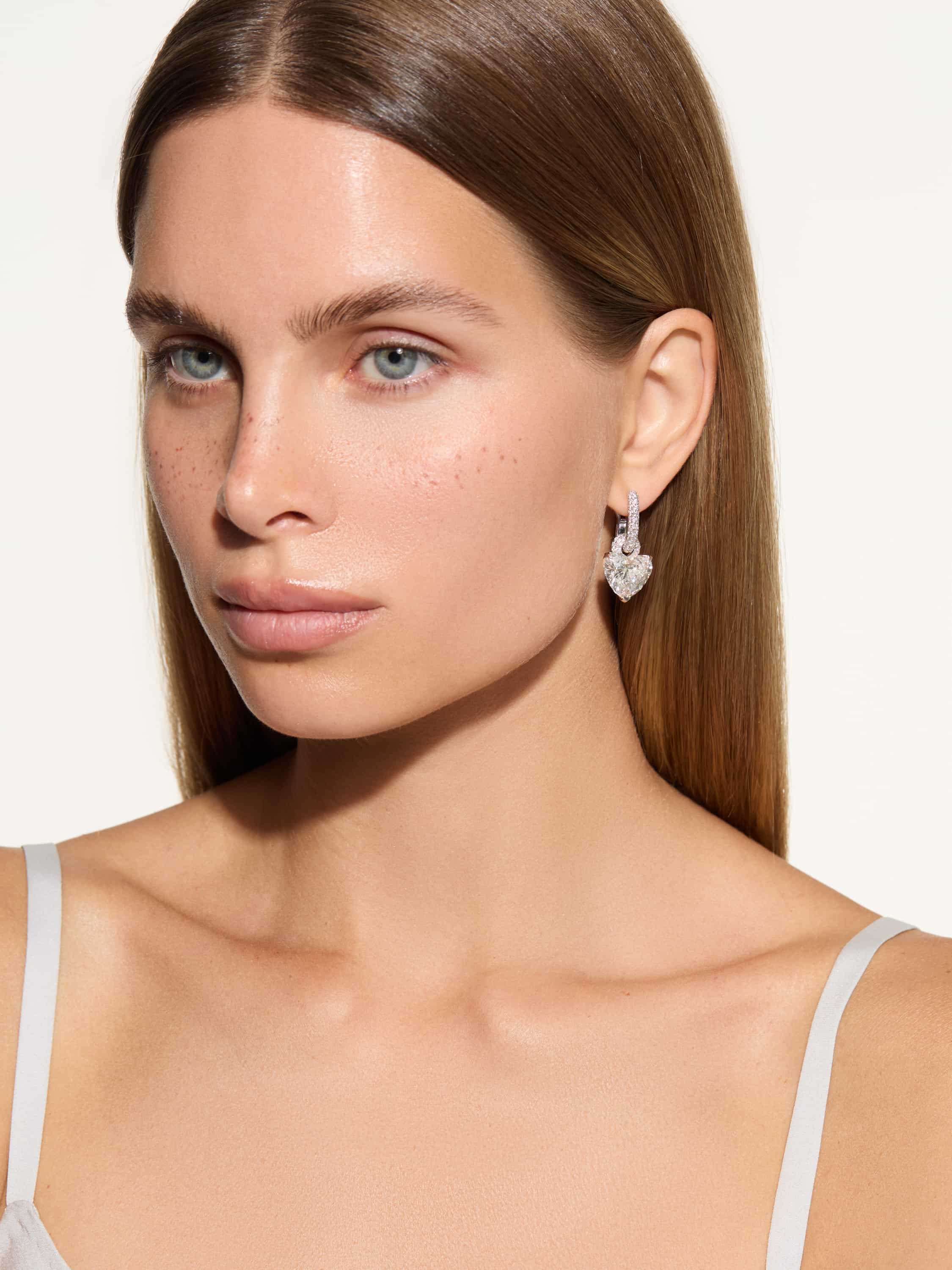 White earrings with LG diamonds in a heart cut
