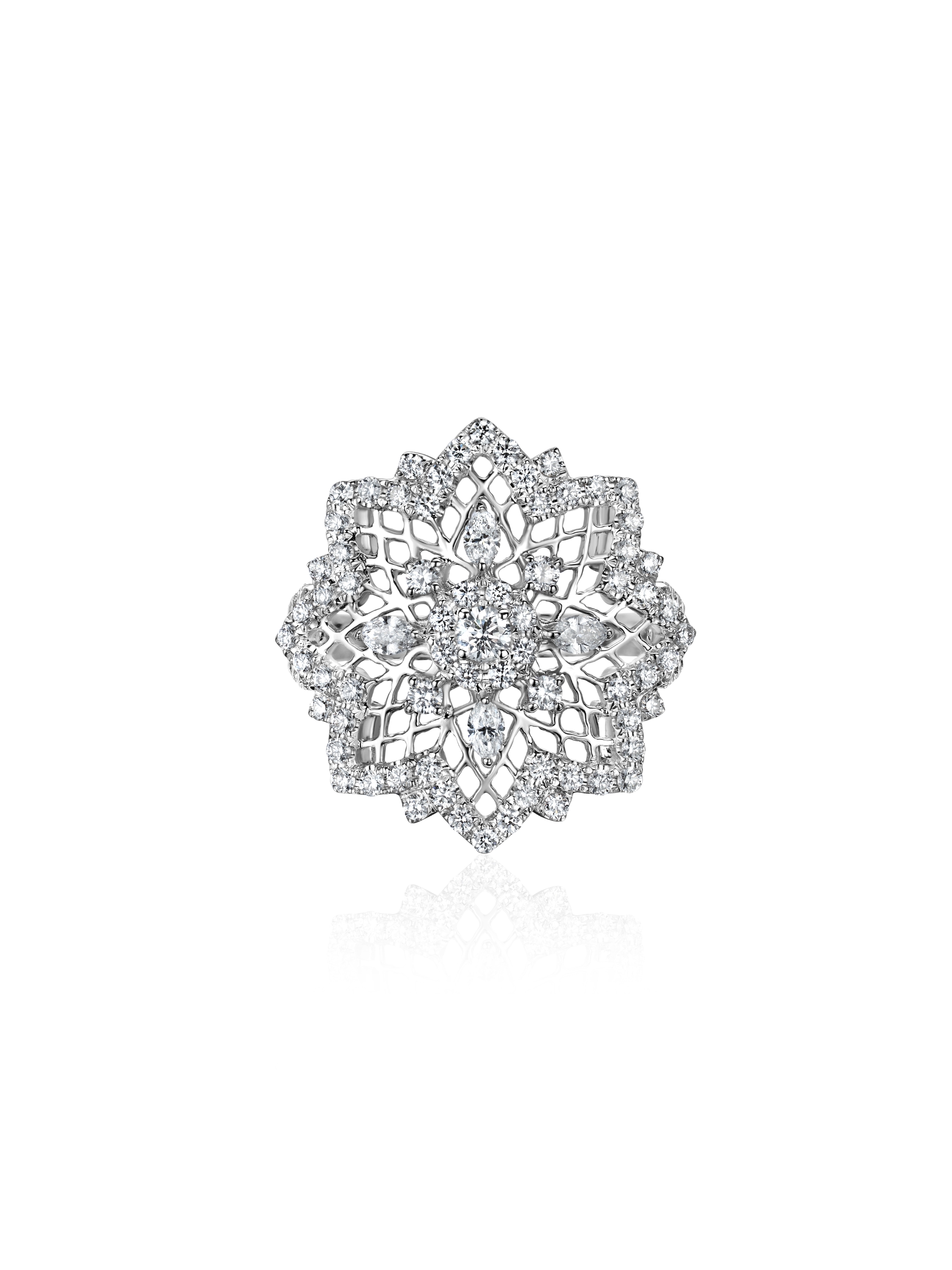 White gold ring with 4 marquise-cut diamonds 0.19 ct and 89 round diamonds.