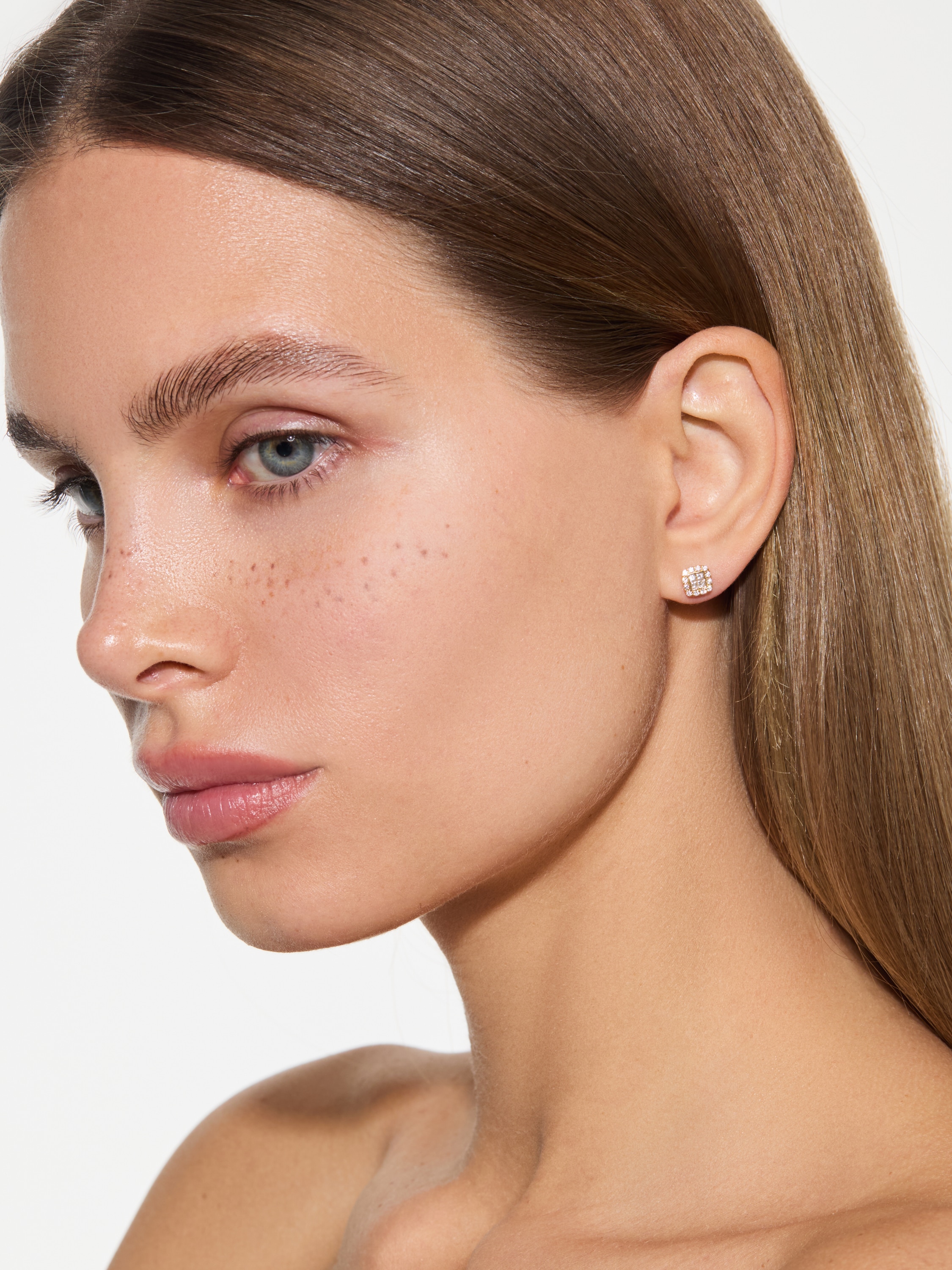 Stud earrings in 18K pink gold with 8 princess-cut diamonds 0.23 ct and 24 round-cut diamonds 0.18 ct.