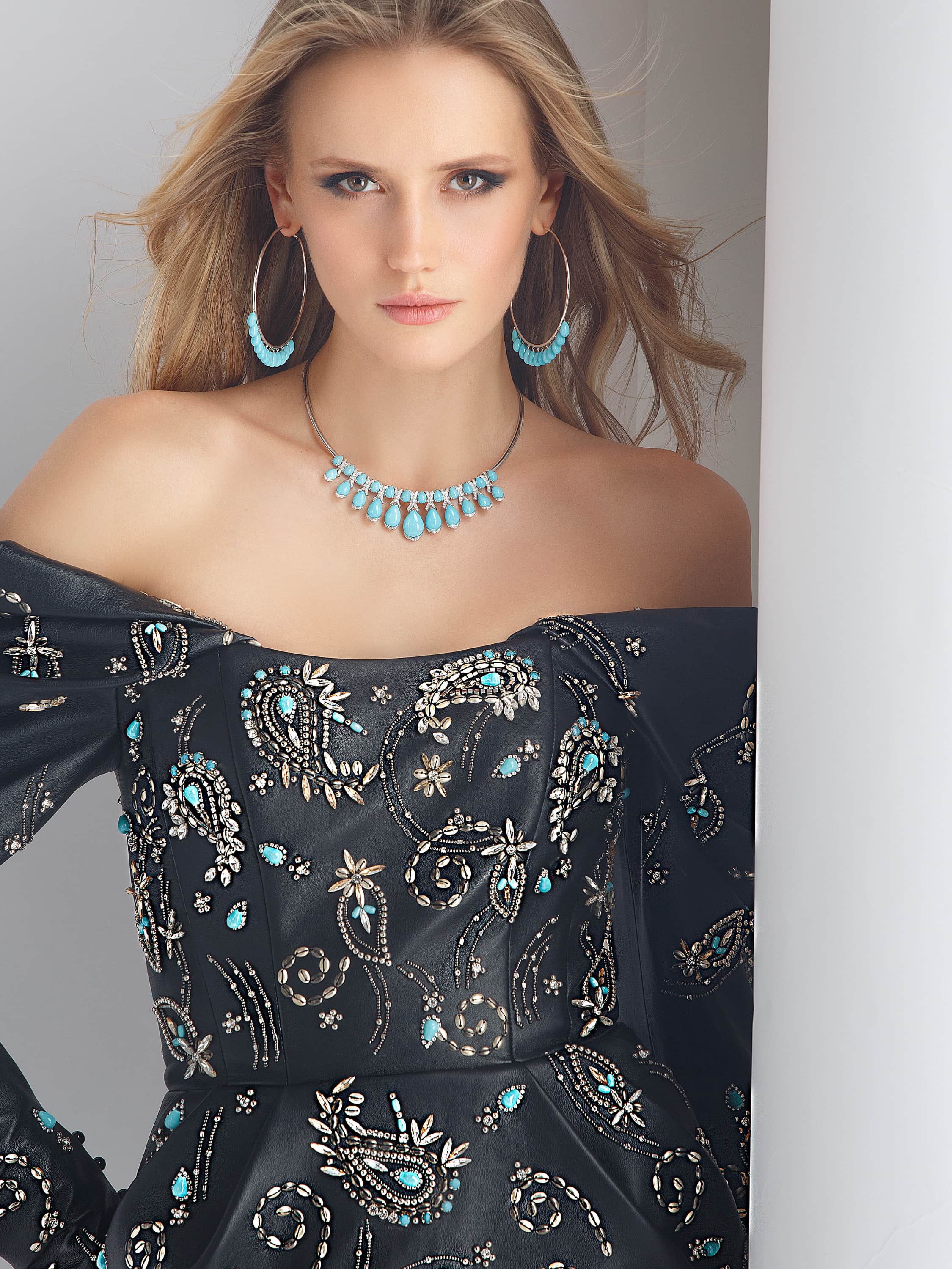 White gold necklace with 23 turquoise cabochons weighing 5.16 g, 256 round diamonds weighing 1.73 ct and 50 round diamonds weighing 0.60 ct.