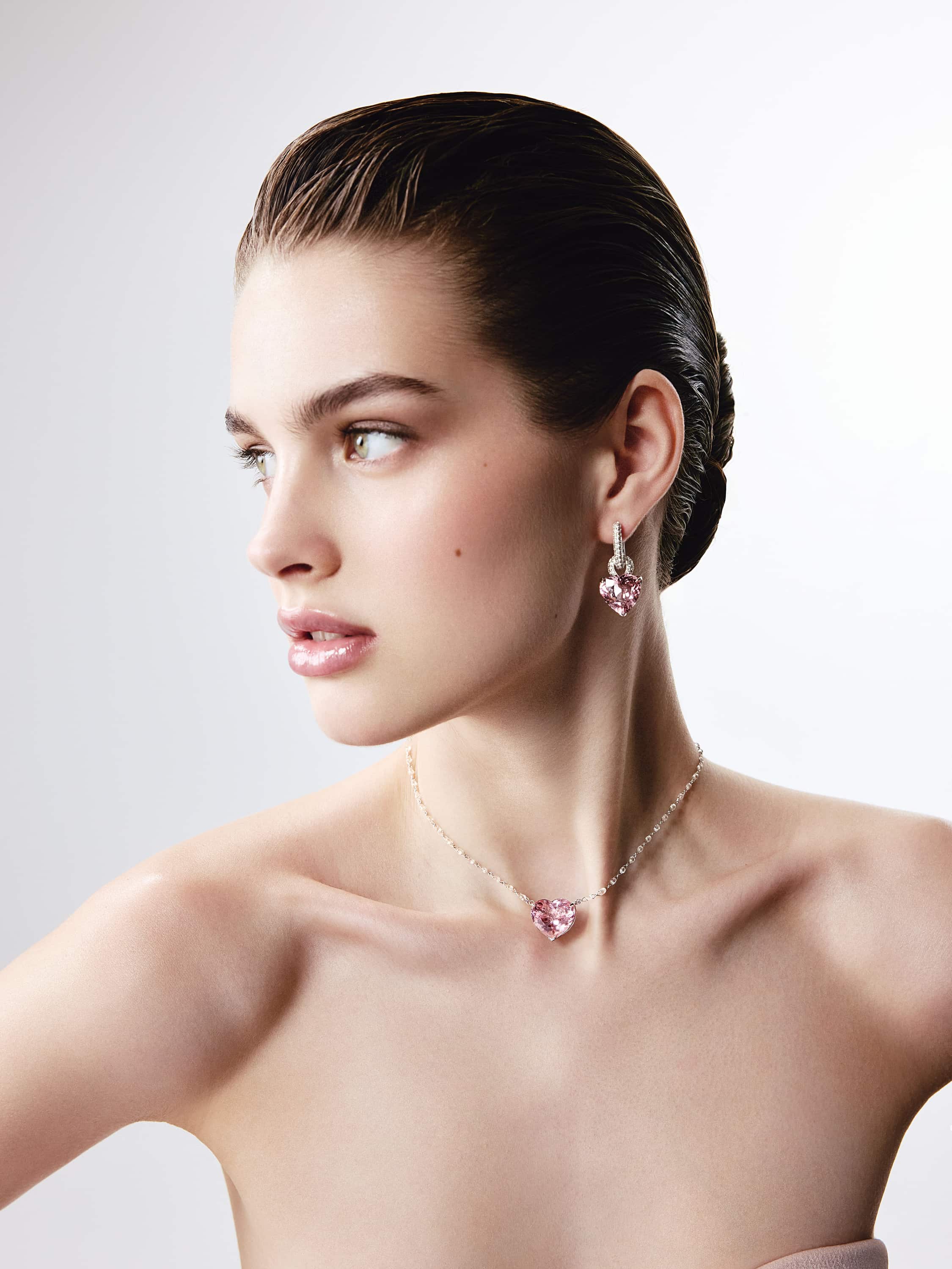 White gold necklace set with a heart-cut morganite weighing 14.64 ct, 169 round brilliant-cut diamonds with a total weight of 0.84 ct, and 60 briolette-cut diamonds with a total weight of 5.66 ct.