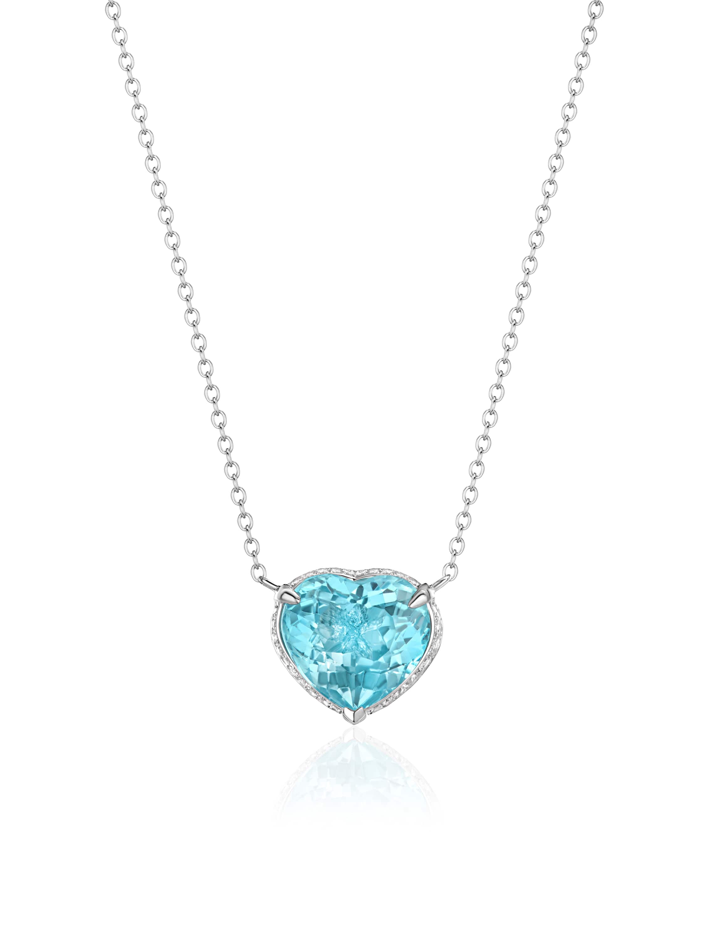 Necklace in white gold with a heart-cut apatite, 127 round diamonds totaling 0.52 ct and 1 briolette-cut diamond of 0.13 ct.