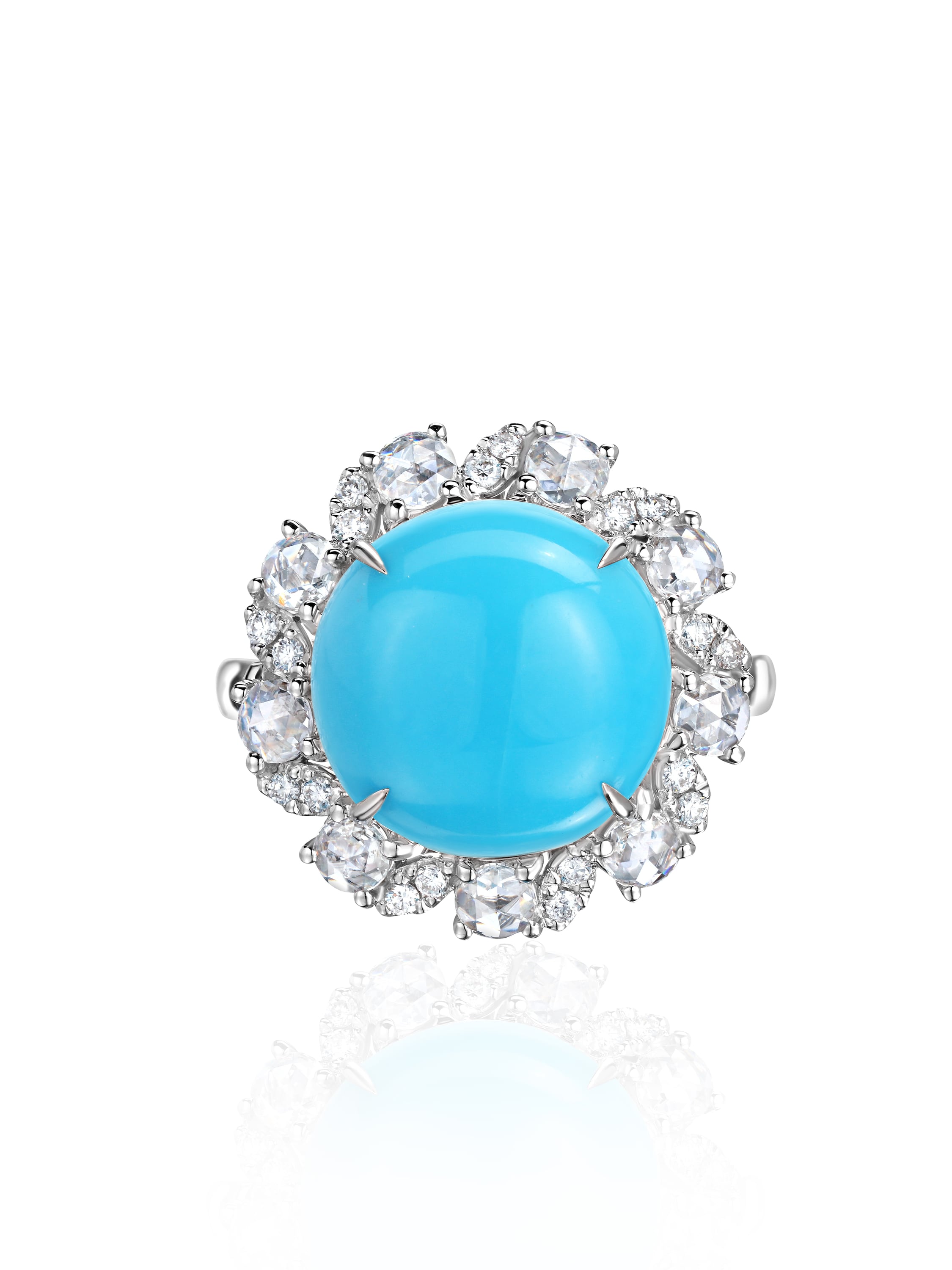 White gold ring with turquoise, 9 rose-cut diamonds weighing 0.56 ct and 18 round diamonds weighing 0.16 ct.