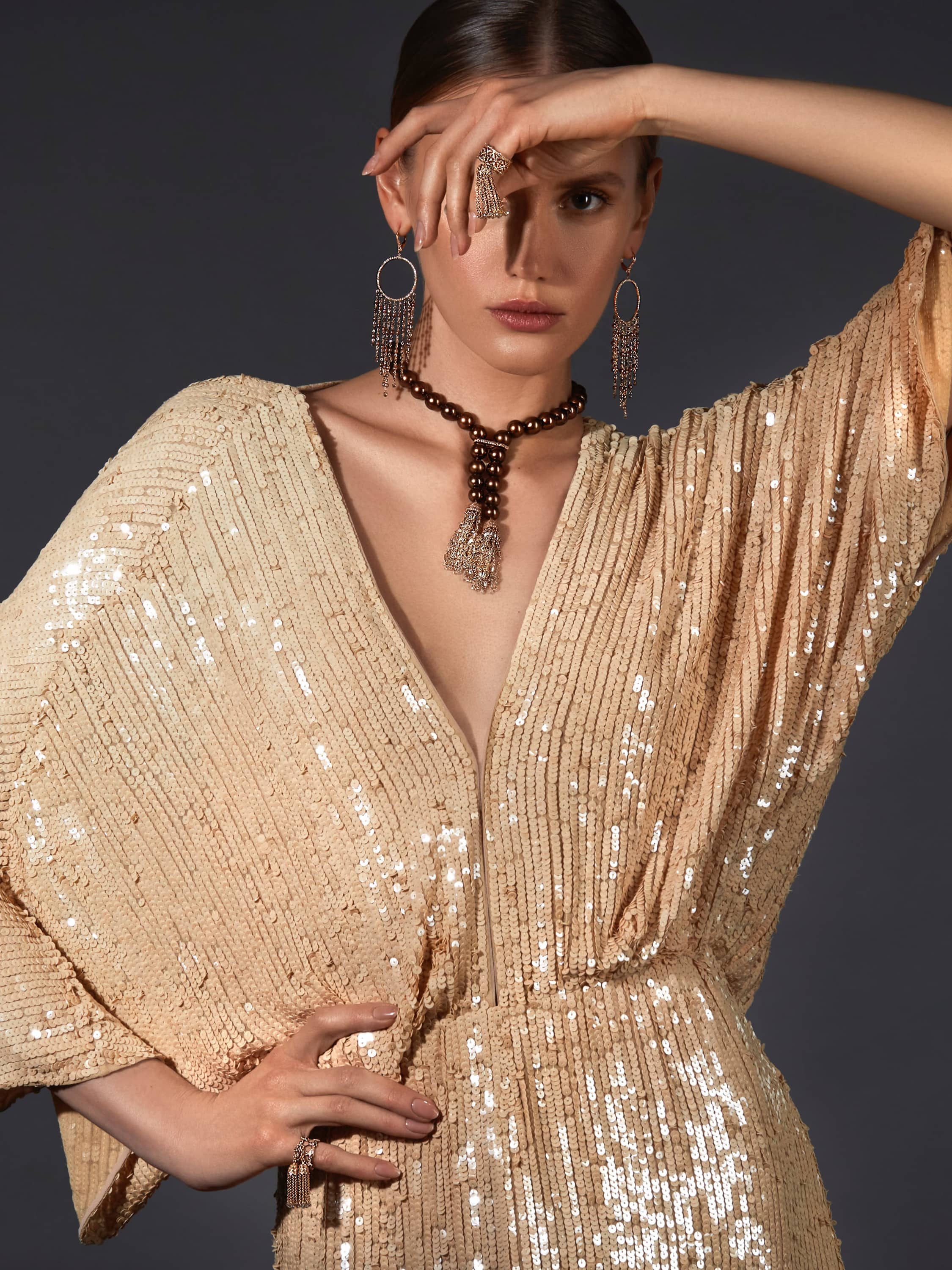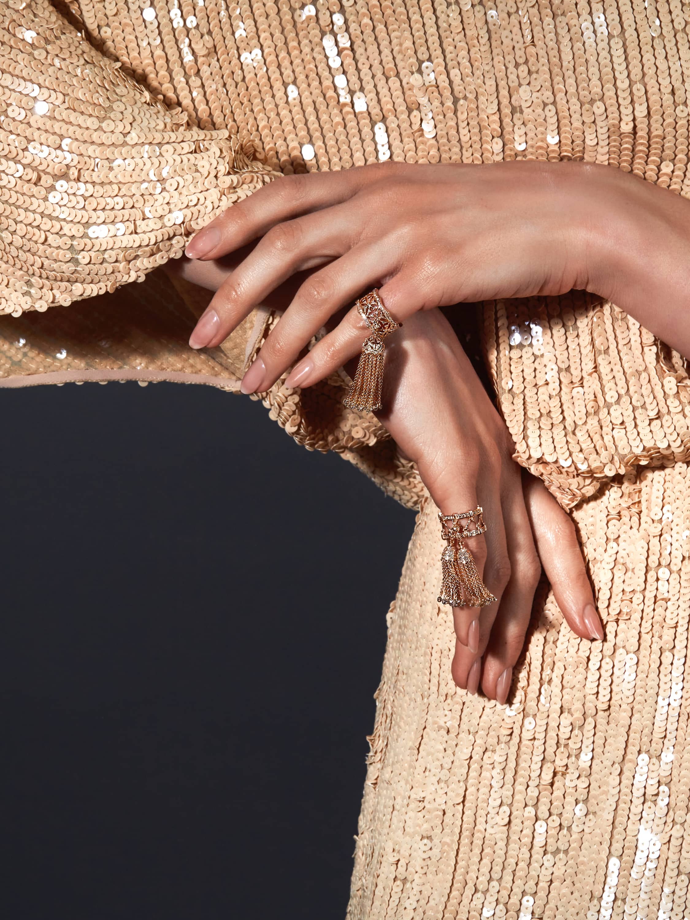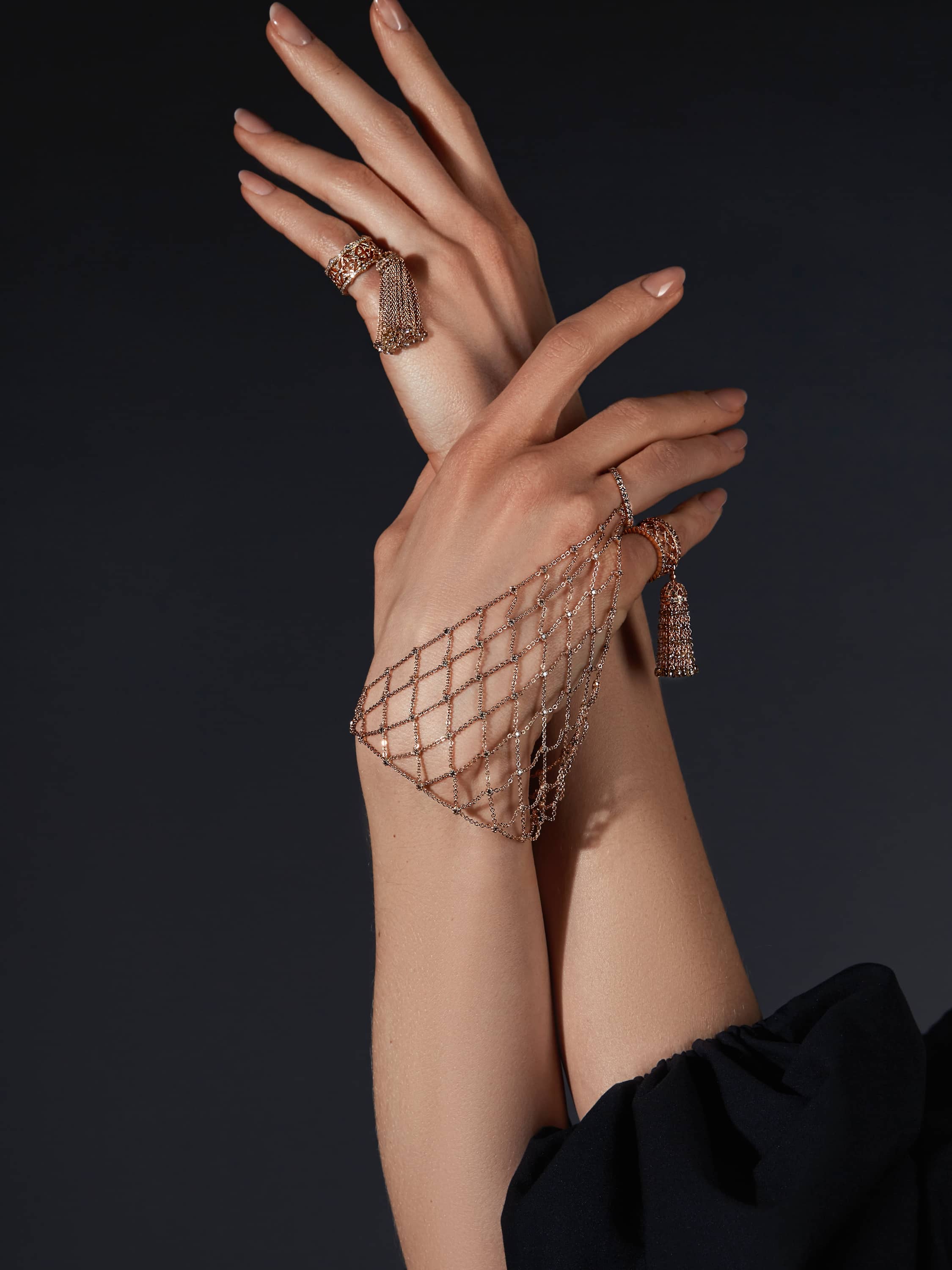 A hand ring made of 18K rose gold with 37 briolette-cut brown diamonds totaling 3.63 ct, and 253 round brown diamonds totaling 1.07 ct