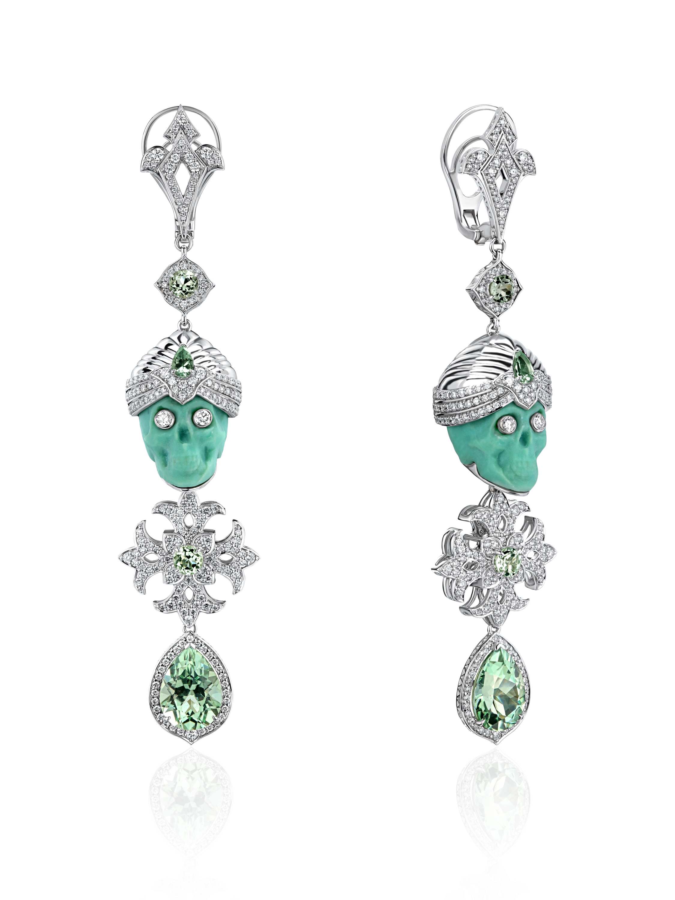 White gold skull earrings with carved turquoise, tourmalines and diamonds