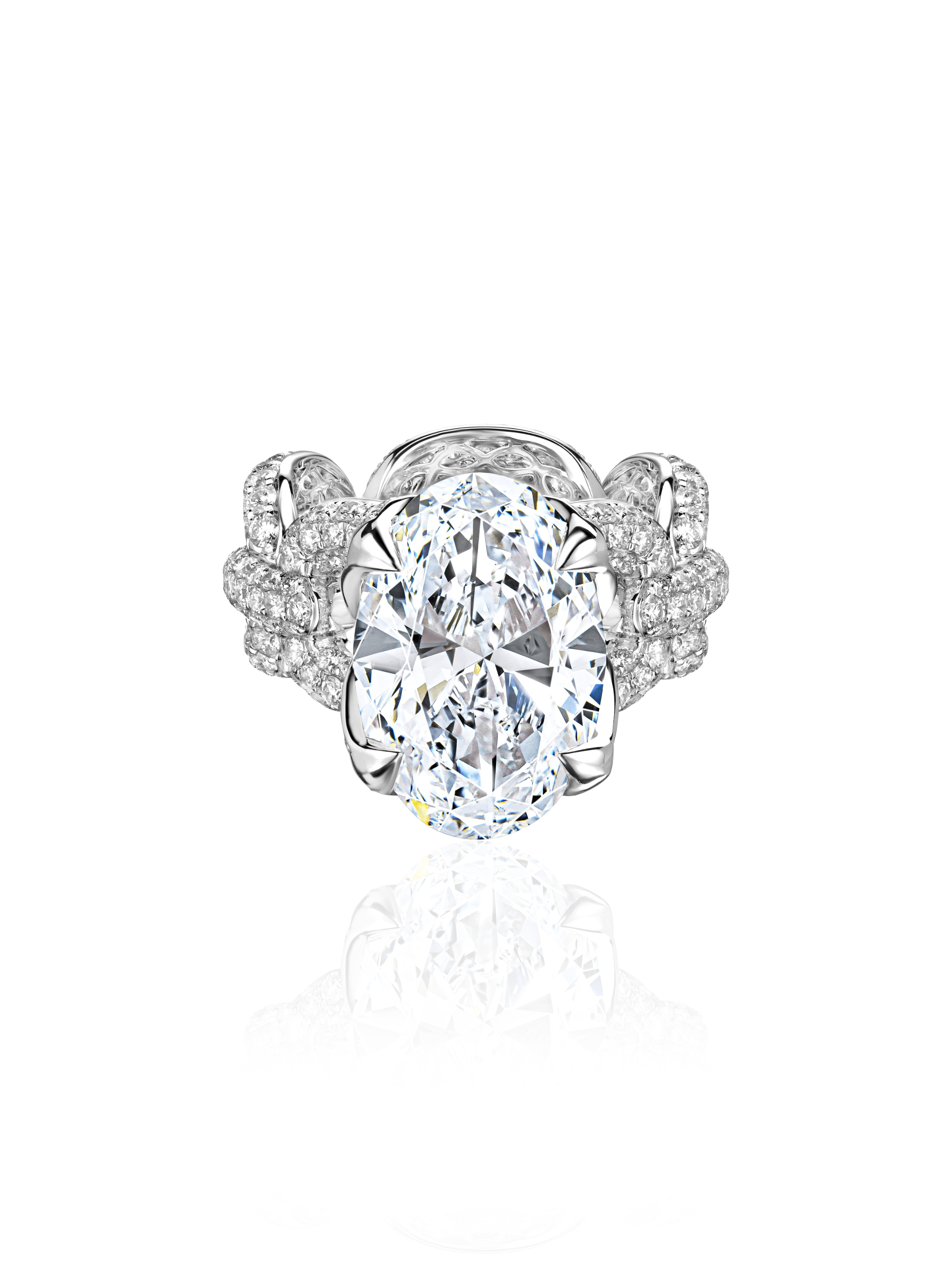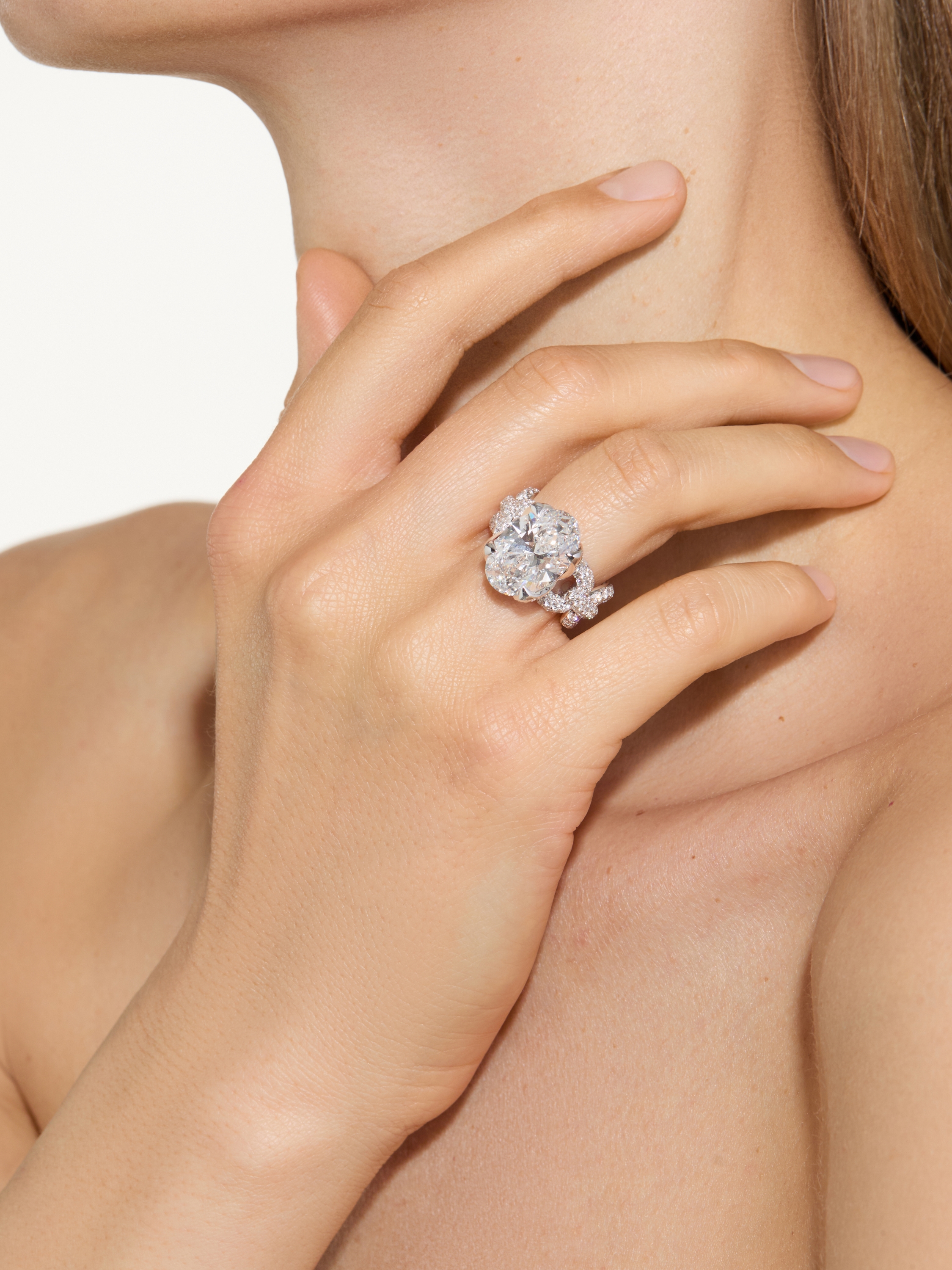 White gold ring with an 8.01 ct E/VS1 oval lab-grown diamond and 306 round lab-grown diamonds totaling 3.20 ct H/SI.