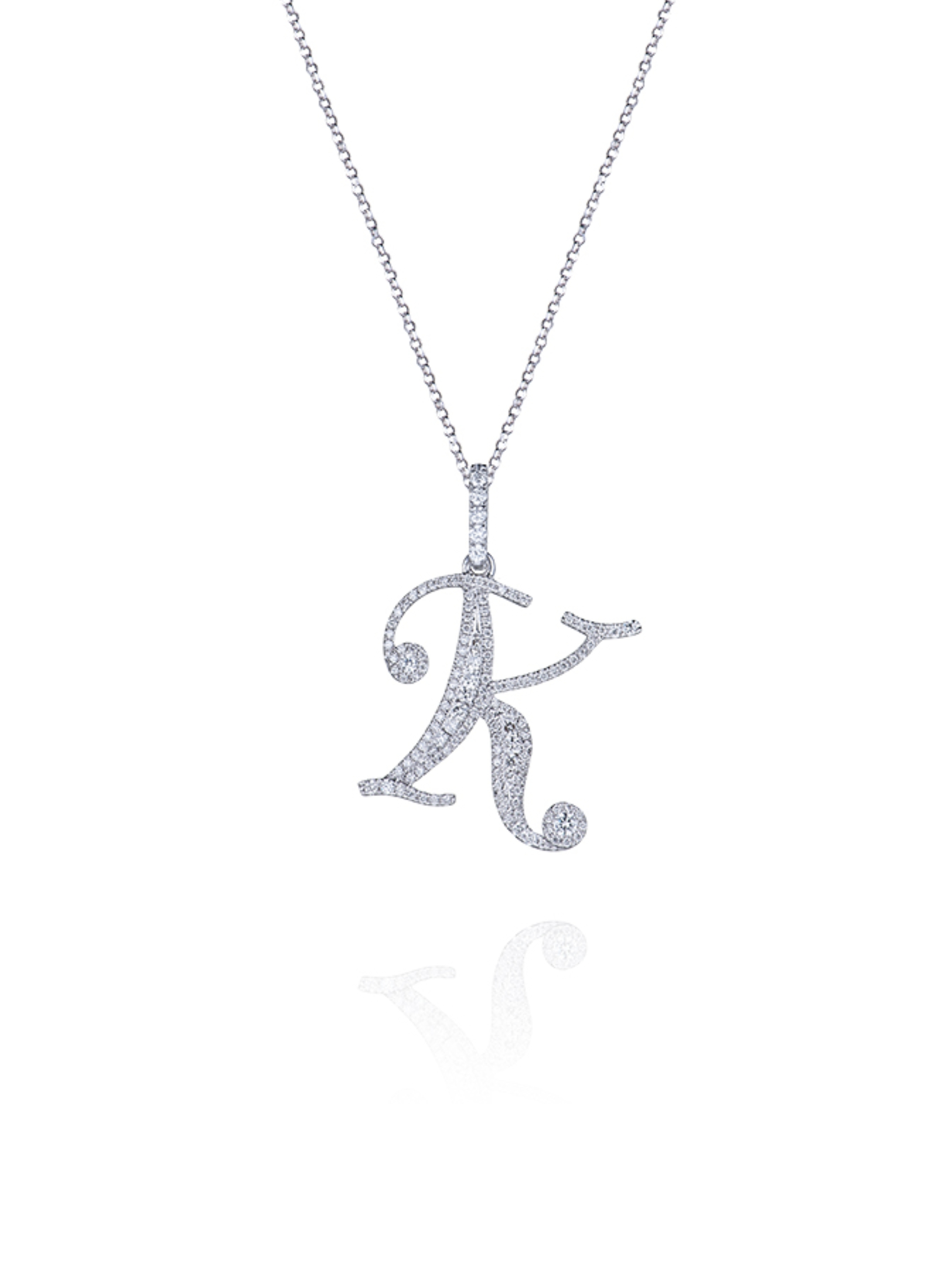 White gold necklace with a K-shaped pendant with 138 round diamonds totaling 0.47 ct.