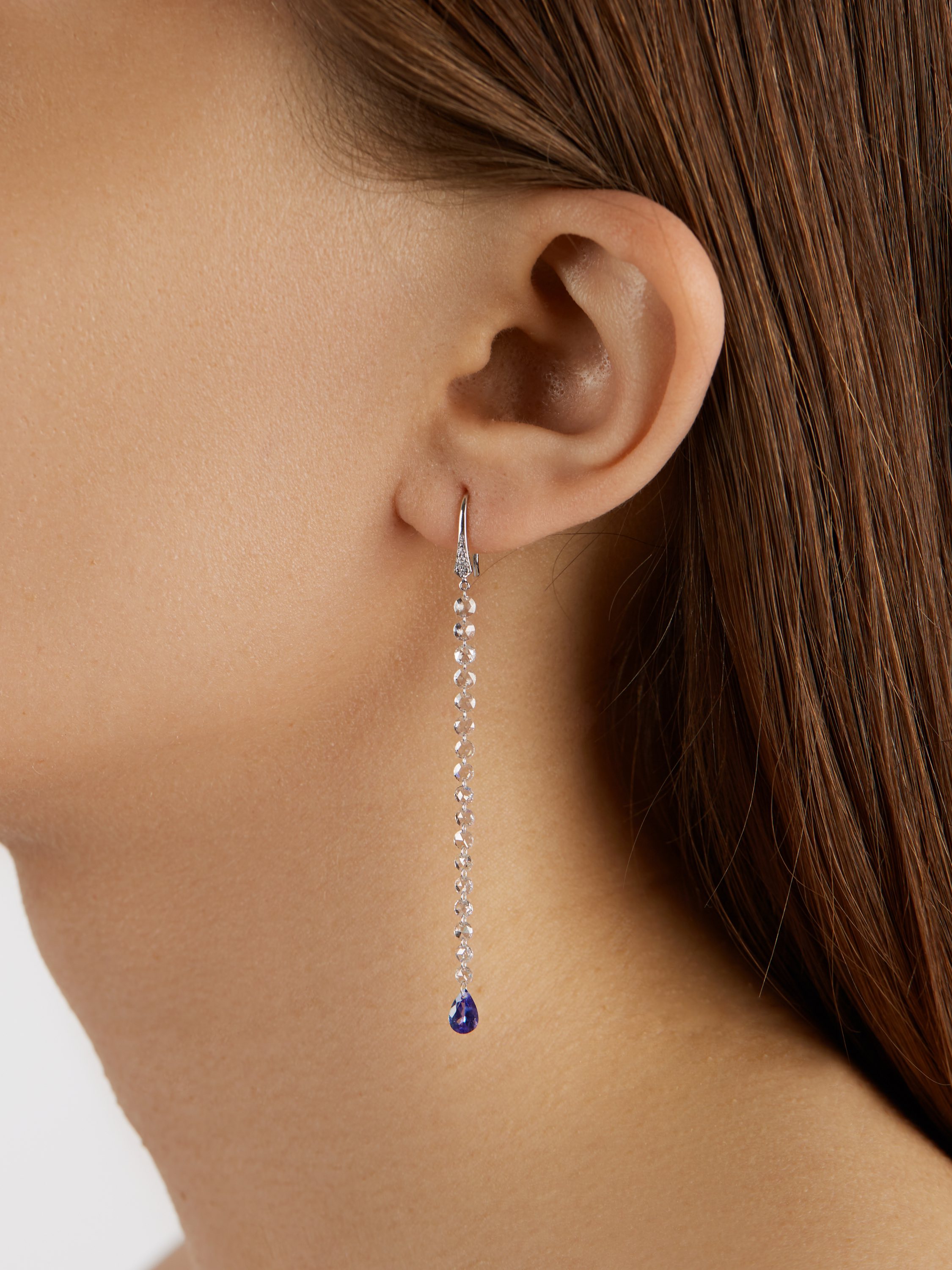 Earrings made of 750 white gold with 2 pear-cut tanzanites weighing 0.66 ct, 10 round diamonds weighing 0.04 ct, and 34 rose-cut diamonds weighing 1.35 ct. Item length: 7 cm.