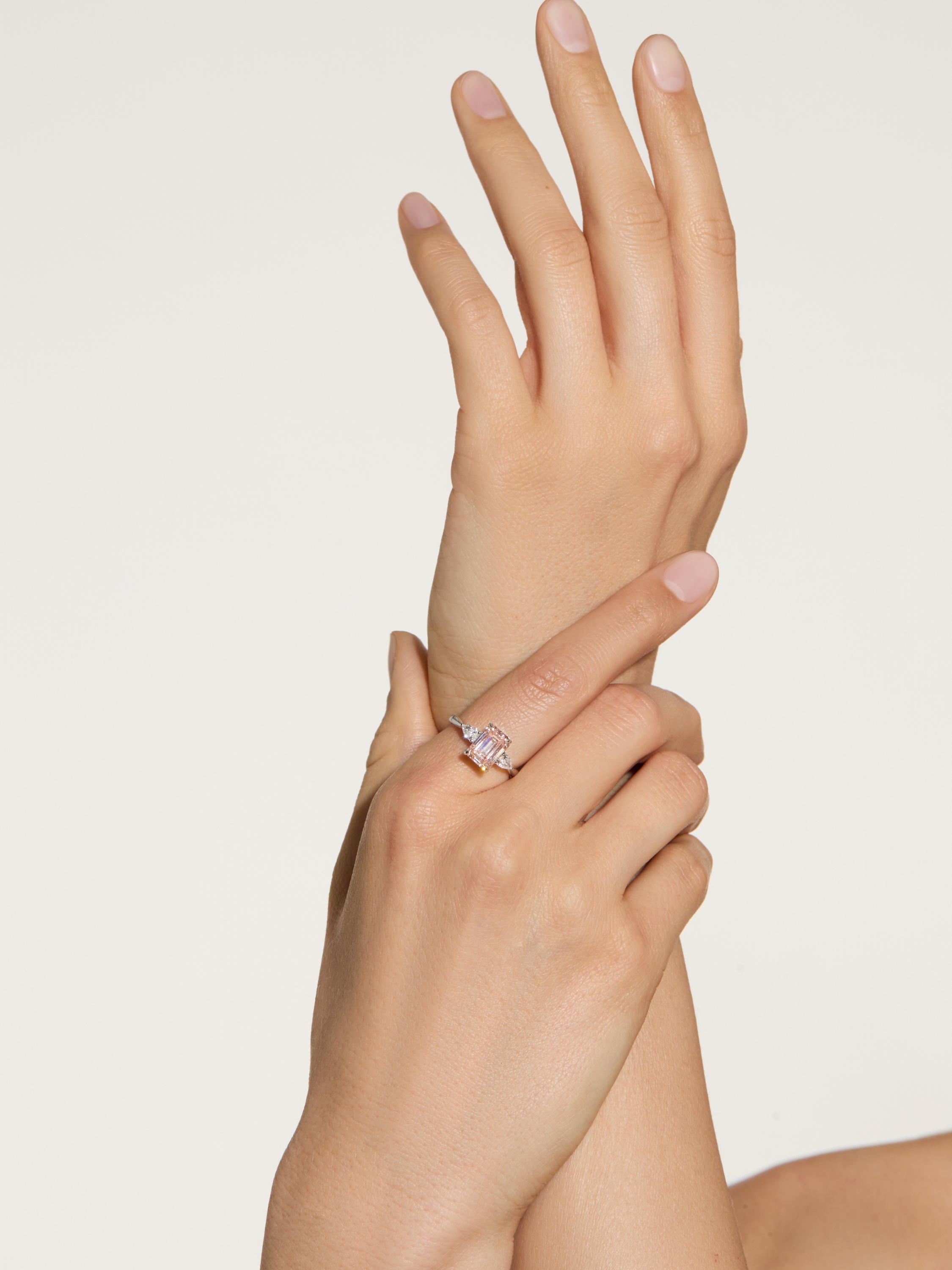 White gold ring with pink LG diamond in octagon cut 3.03 ct FVP/VVS2 and 2 LG diamonds in pear cut 0.41 ct H/SI.