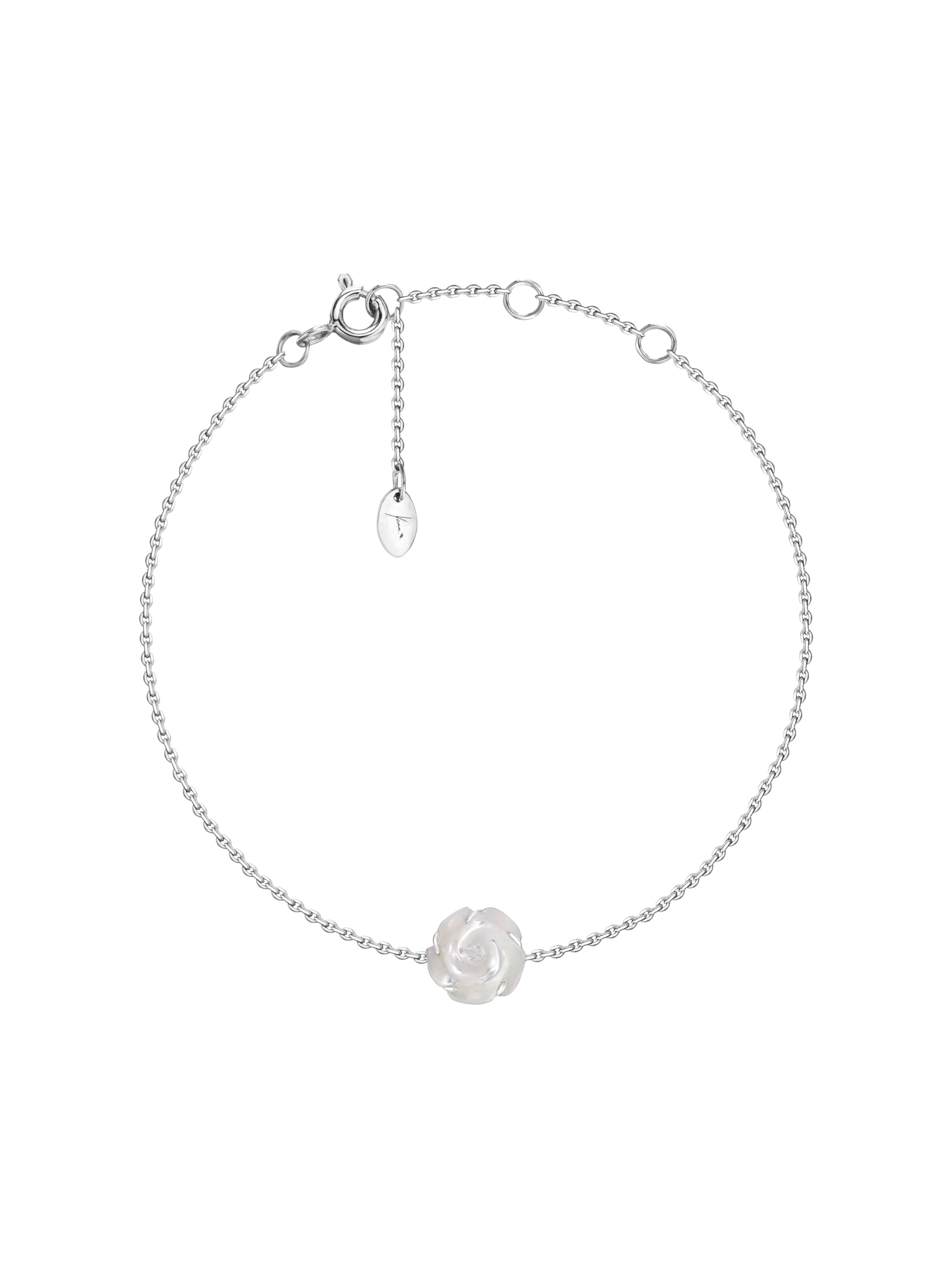 Bracelet made of white gold with a rose of white carved mother-of-pearl
