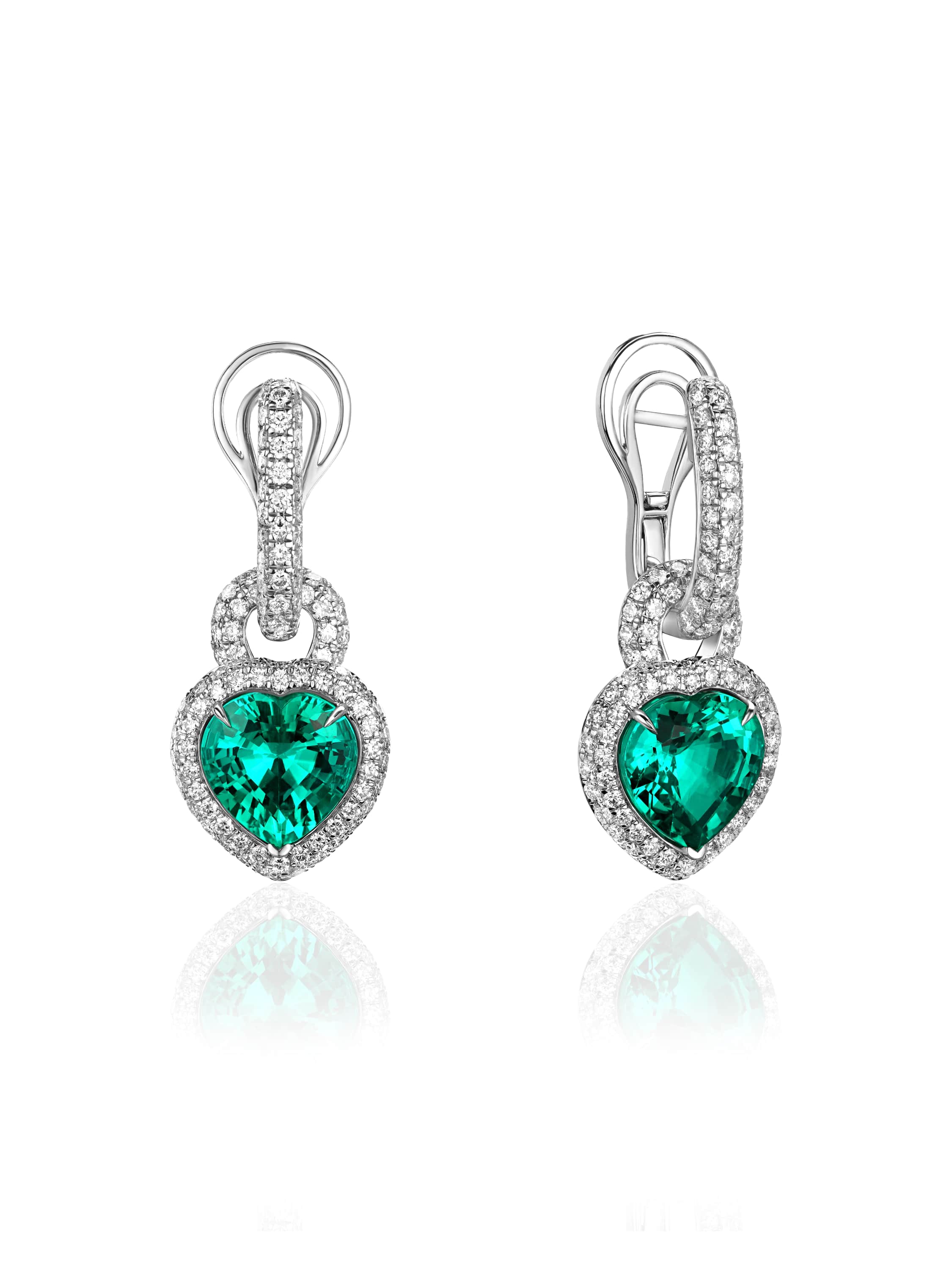 Long white gold earrings with 2 recrystallized heart-cut emeralds weighing 8.80 ct and 204 round LG diamonds weighing 2.40 ct. Item length: 3.5 cm.