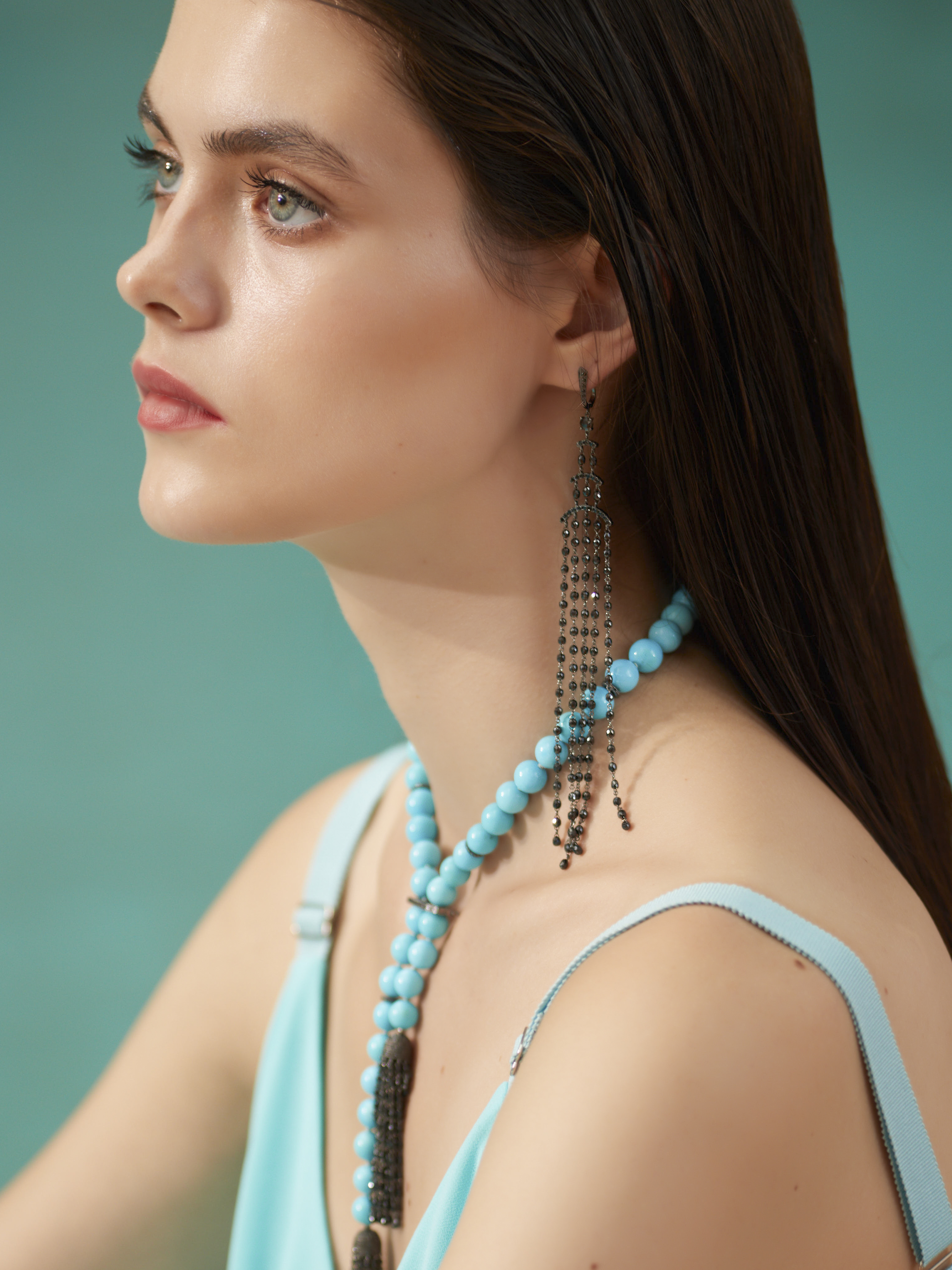 Long earrings in blackened gold, set with 198 black briolette-cut diamonds with a total weight of 30.91 ct, 104 round black diamonds with a total weight of 1.41 ct, and 2 rose-cut black diamonds with a total weight of 0.40 ct.