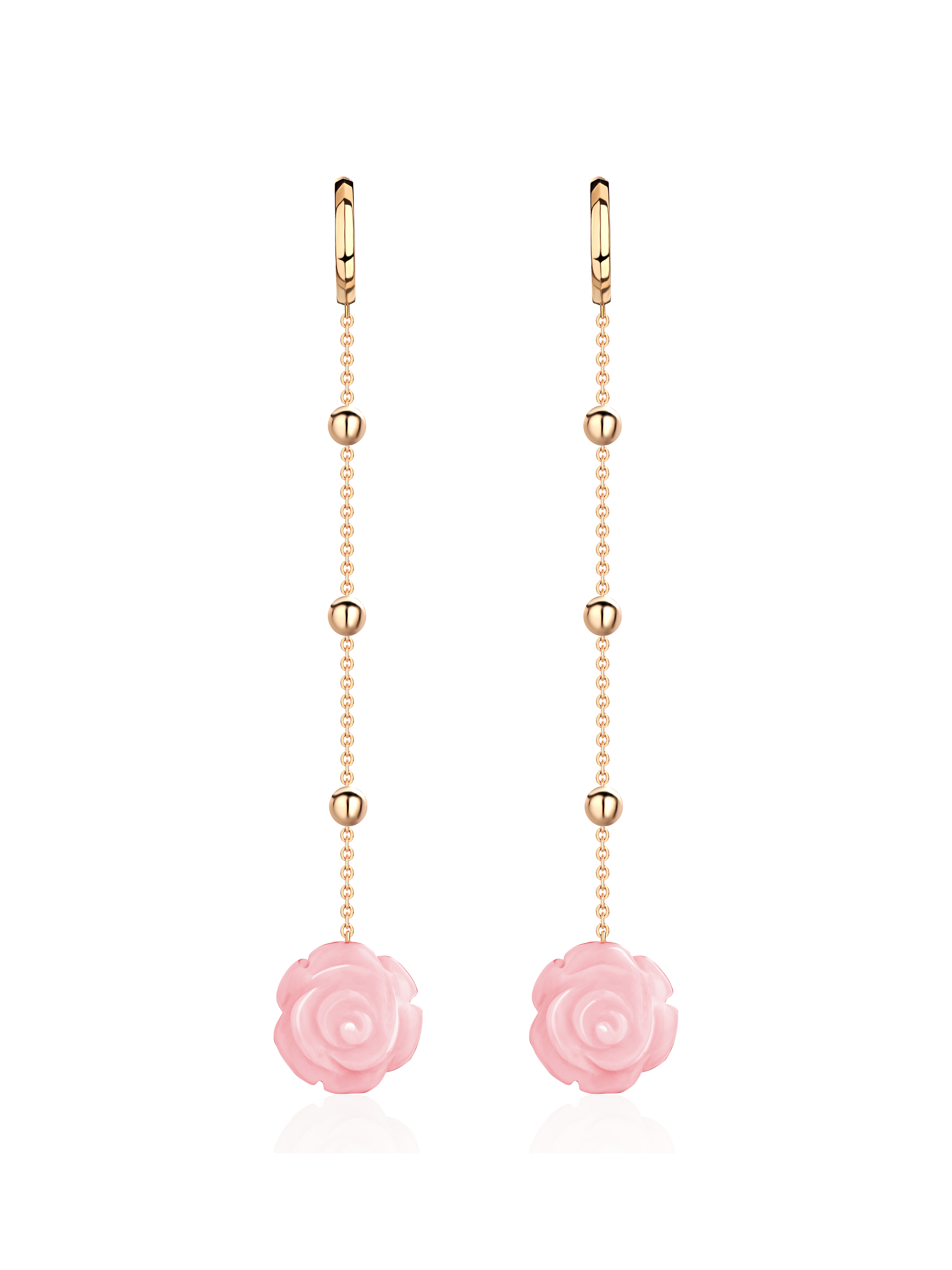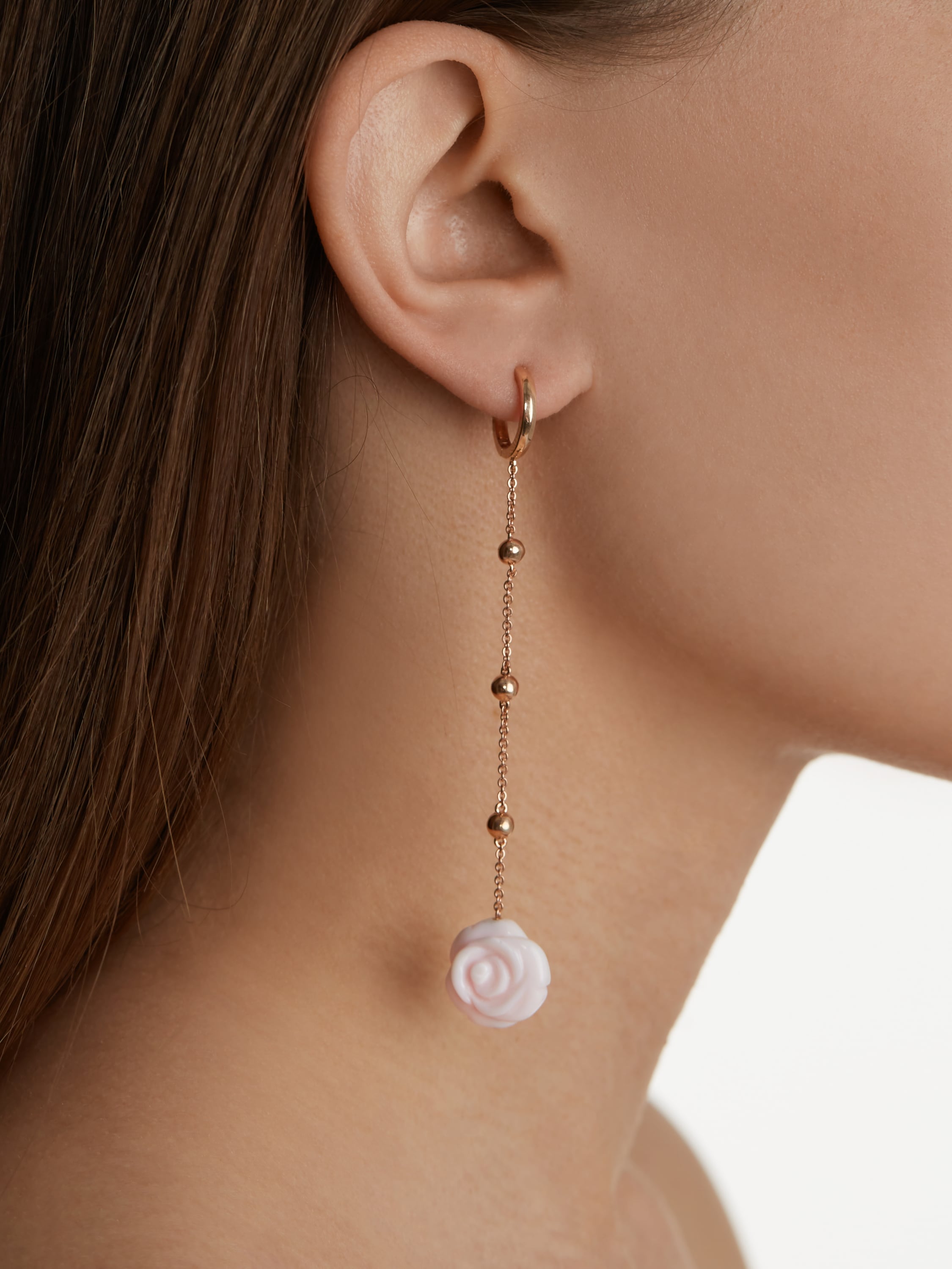 Long earrings made of rose gold with carved shell roses with a total weight of 2.96 g. Item length: 9 cm.