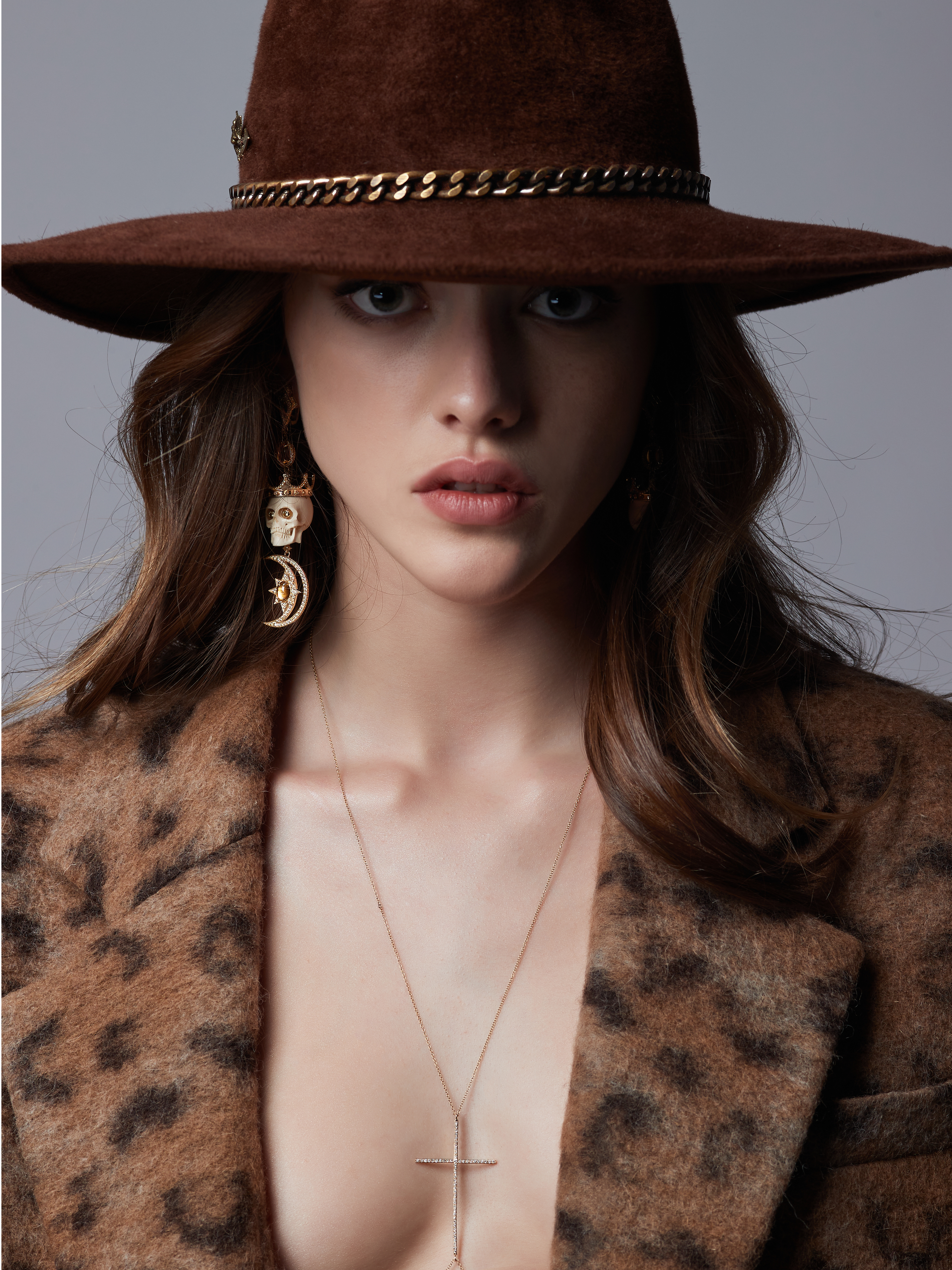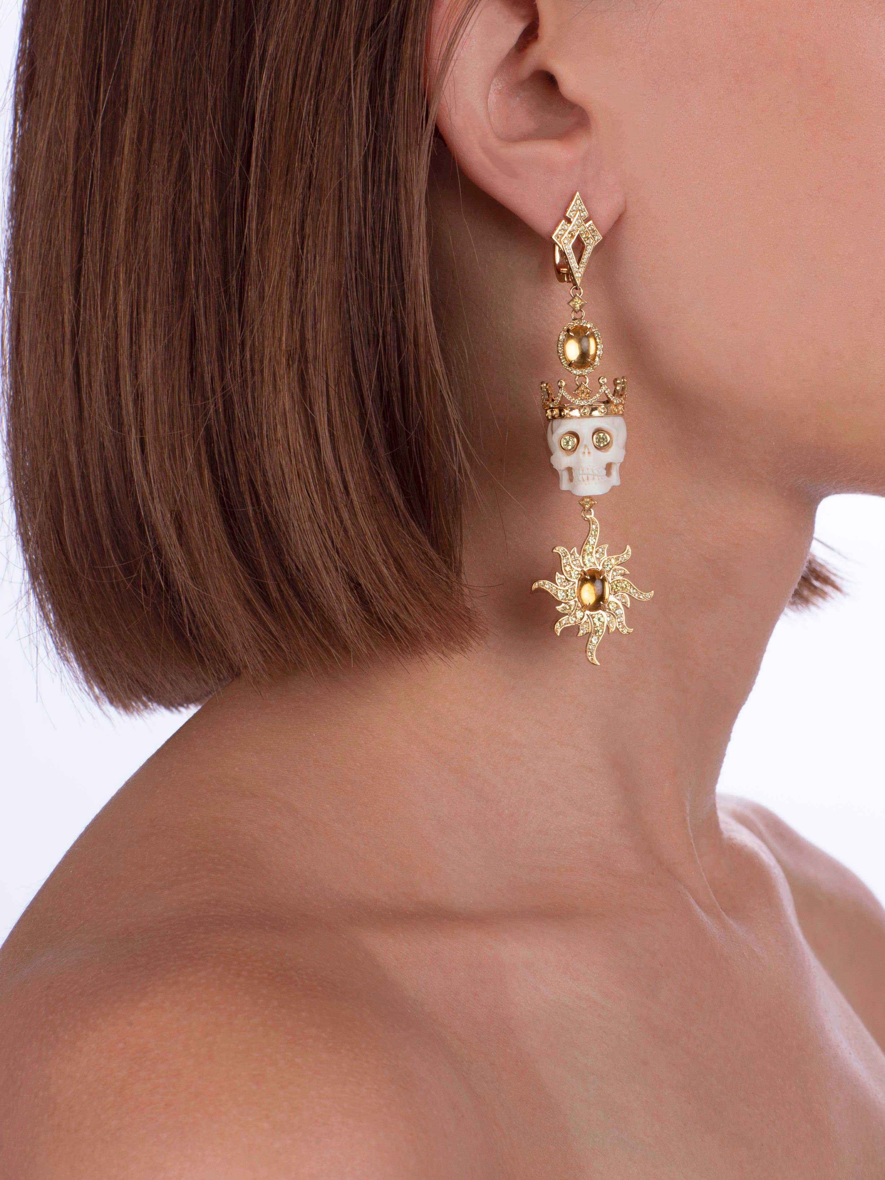 Earrings made of gold with 4 cabochon-cut citrines with a total weight of 3.50 ct, 425 yellow sapphires with a total weight of 4.00 ct, and 2 mammoth tusk skulls with a total weight of 11.48 g. Item length 9 cm.