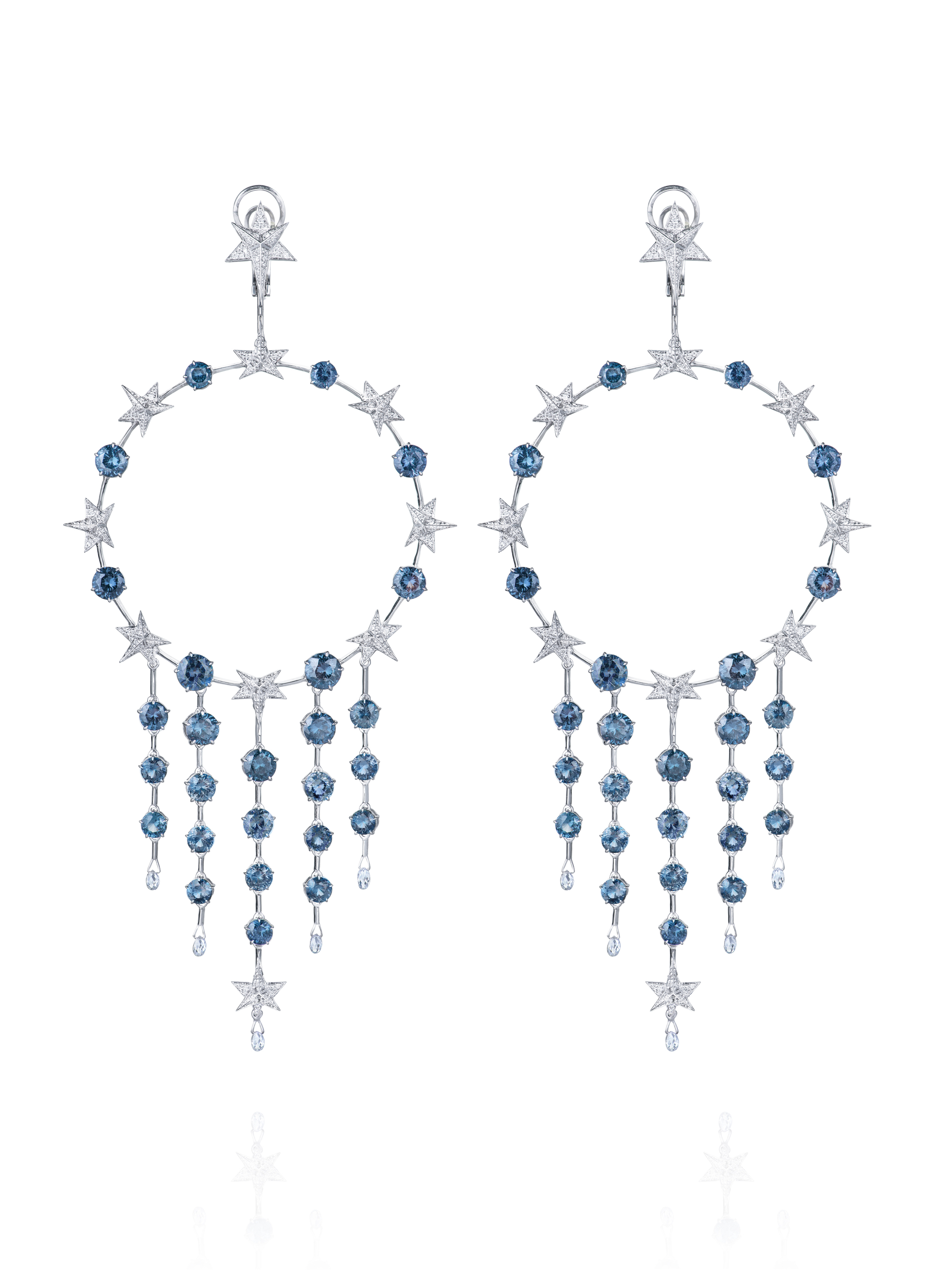 Hoops made of white gold, set with 10 briolette-cut diamonds with a total weight of 0.965 ct, 330 round-cut diamonds with a total weight of 0.937 ct, and 52 round-cut spinels with a total weight of 21.36 ct. Length of the piece: 13 cm.