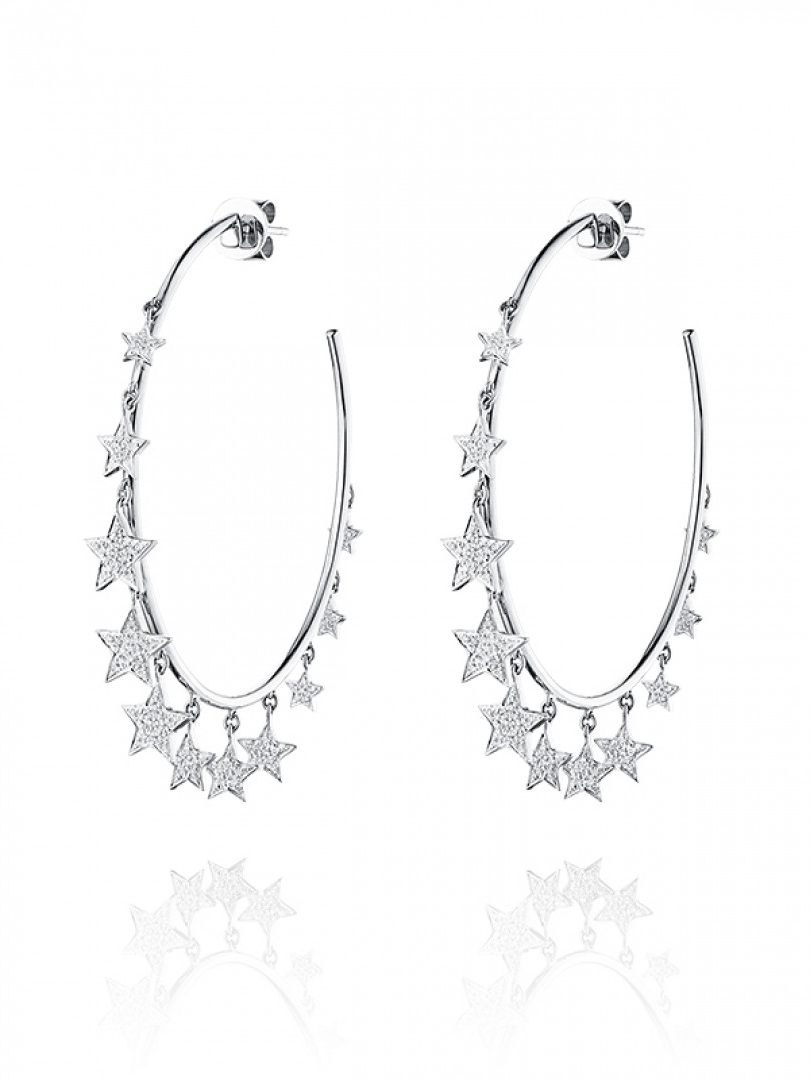 White gold hoops with star-shaped pendants with 192 round-cut diamonds with a total weight of 0.48 ct. Diameter: 5 cm.