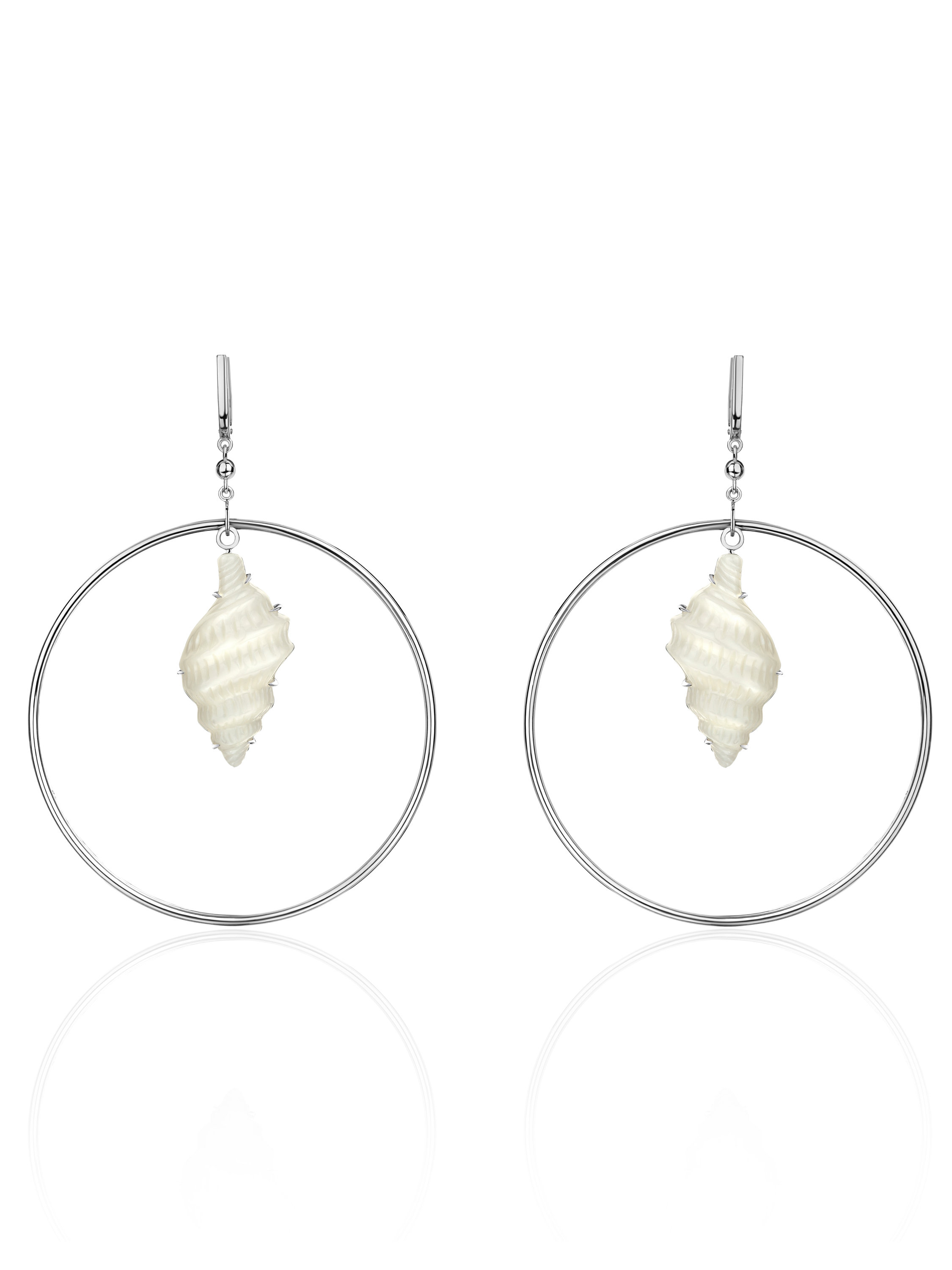 Hoop earrings in white gold with shell-shaped mother-of-pearl pendants with a total weight of 7.44 g. Diameter: 6 cm.