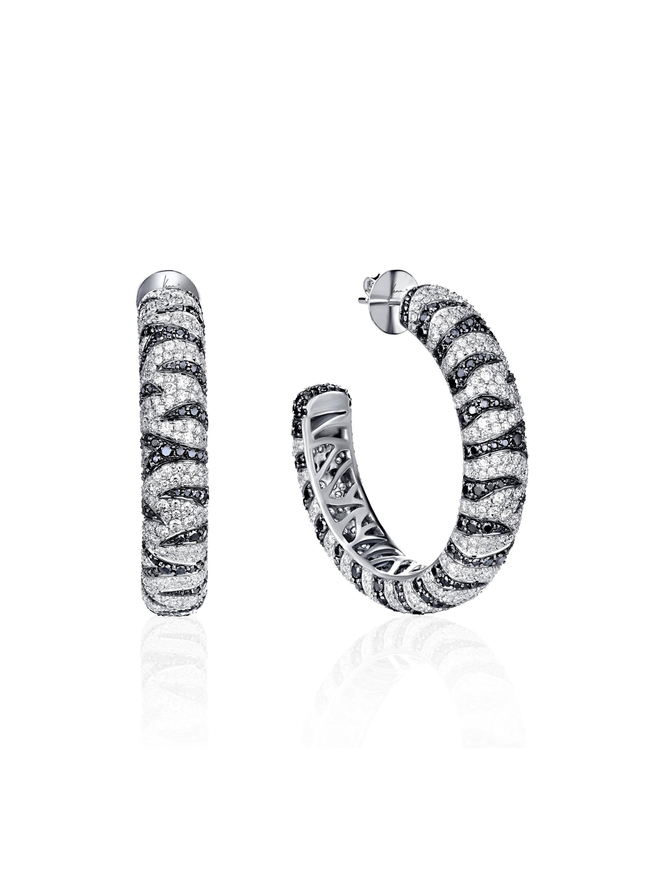 Hoops made of white gold with 436 round-cut black diamonds with a total weight of 3.48 ct and 622 round-cut white diamonds with a total weight of 5.17 ct. Diameter 3 cm.