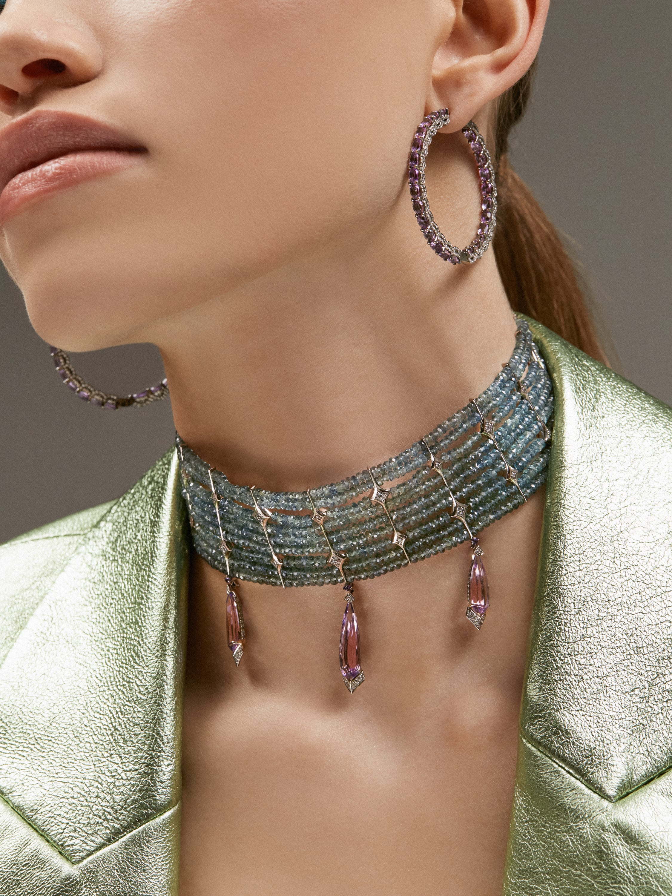 Hoops made of blackened gold with 50 oval amethysts with a total weight of 8.02 ct and 844 round-cut diamonds with a total weight of 2.34 ct. Diameter: 4 cm.