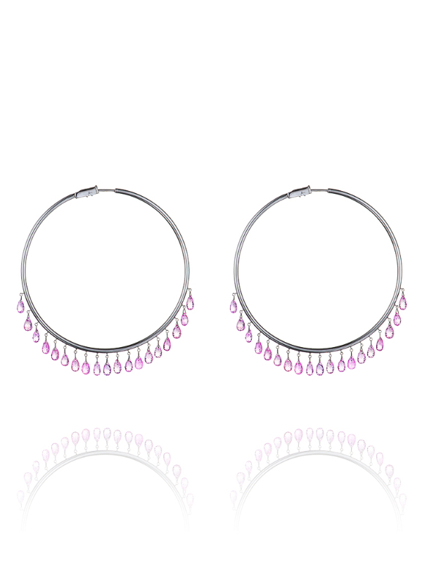 Hoops made of blackened gold with 38 briolette-cut pink sapphires with a total weight of 26.4 ct.