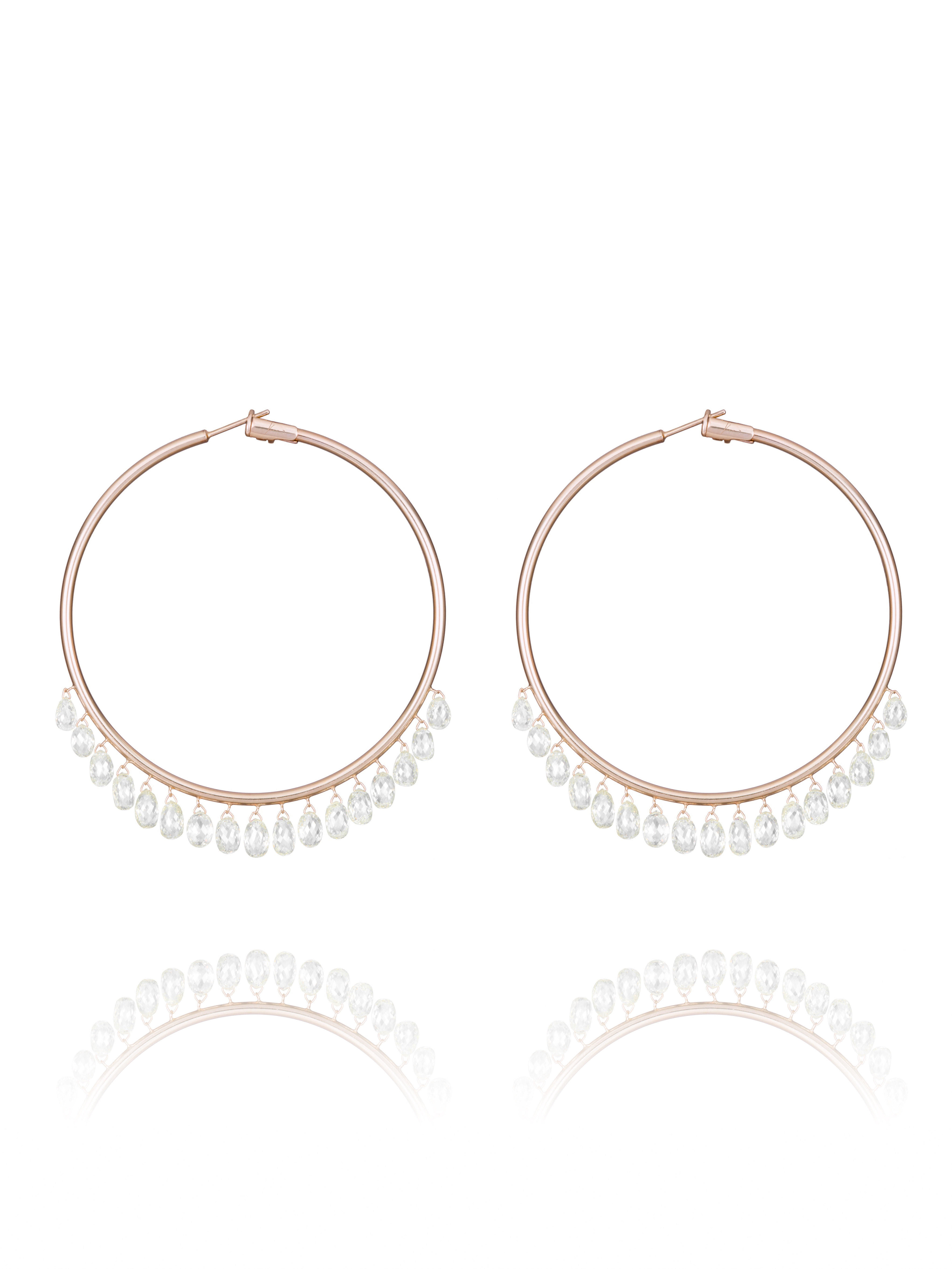 Hoop earrings made of 18K rose gold and complemented by 24 rock crystal briolettes with a total weight of 26.36 ct. Diameter: 5.5 cm.