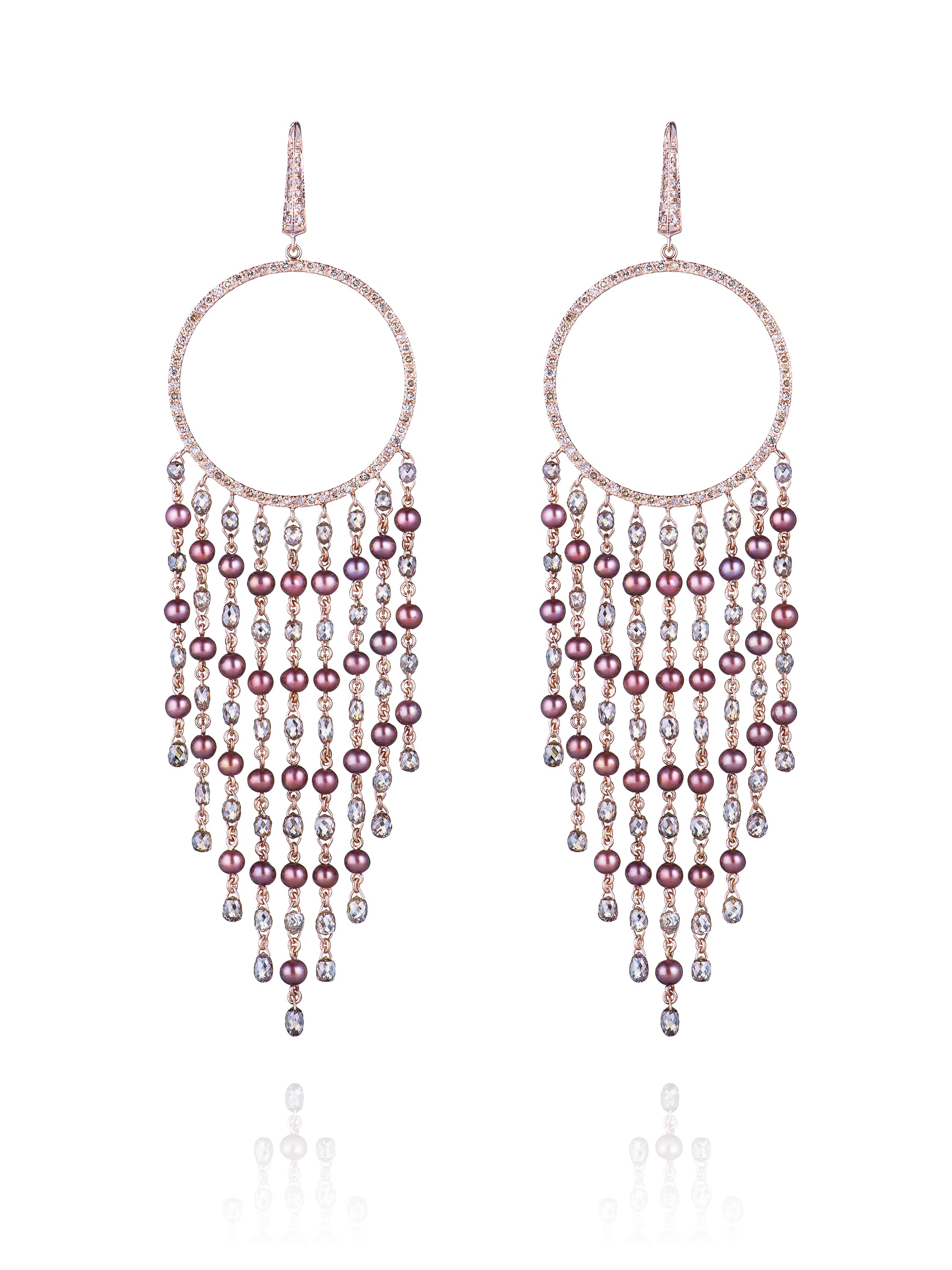 Hoop earrings in rose gold, set with 152 brown round diamonds with a total weight of 1.22 ct, 92 briolette-cut brown diamonds with a total weight of 9.30 ct and 66 brown pearls with a total weight of 2.18 g. Length of the piece: 10 cm.