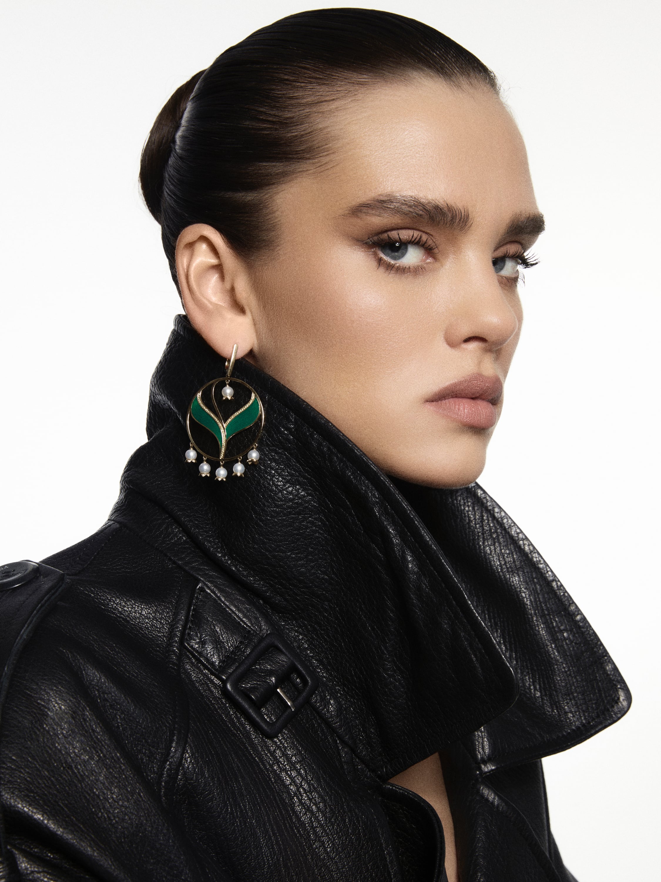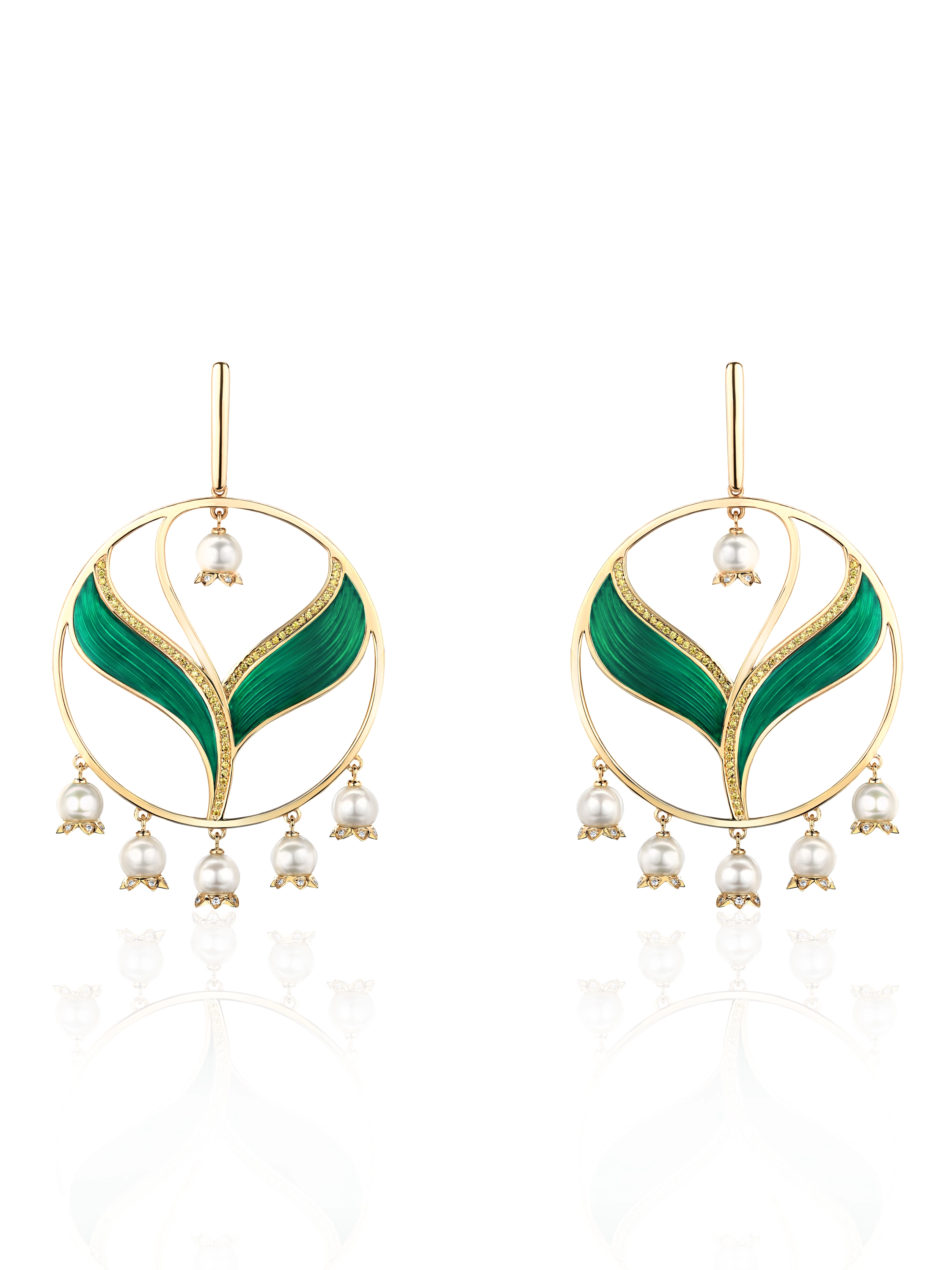 Lily hoop earrings in yellow gold, inlaid with 12 pearls with a total weight of 2.89 g, 116 yellow round-cut diamonds with a total weight of 0.31 ct, 72 round-cut diamonds with a total weight of 0.22 ct, and green enamel. Diameter: 6.5 cm.
