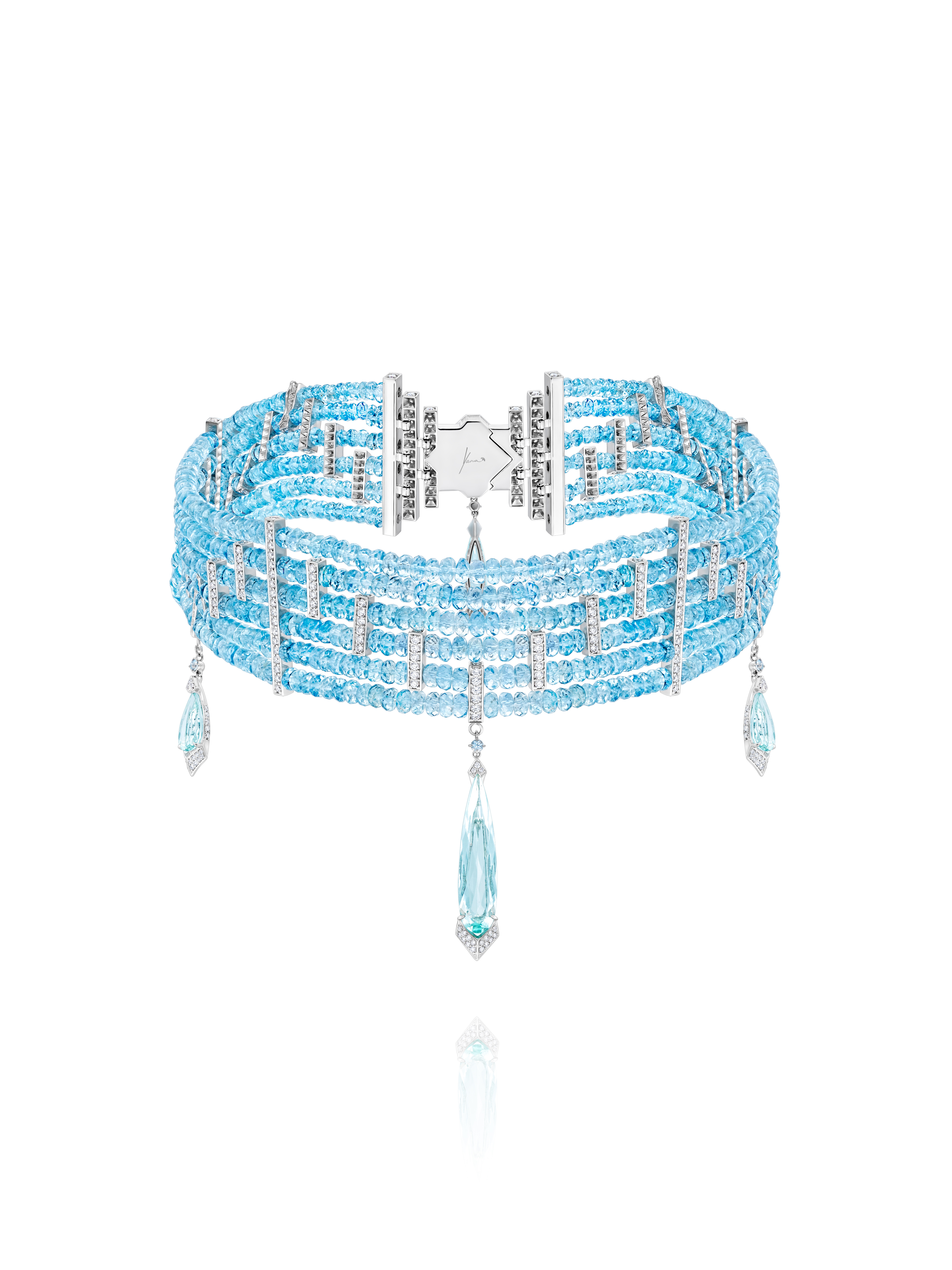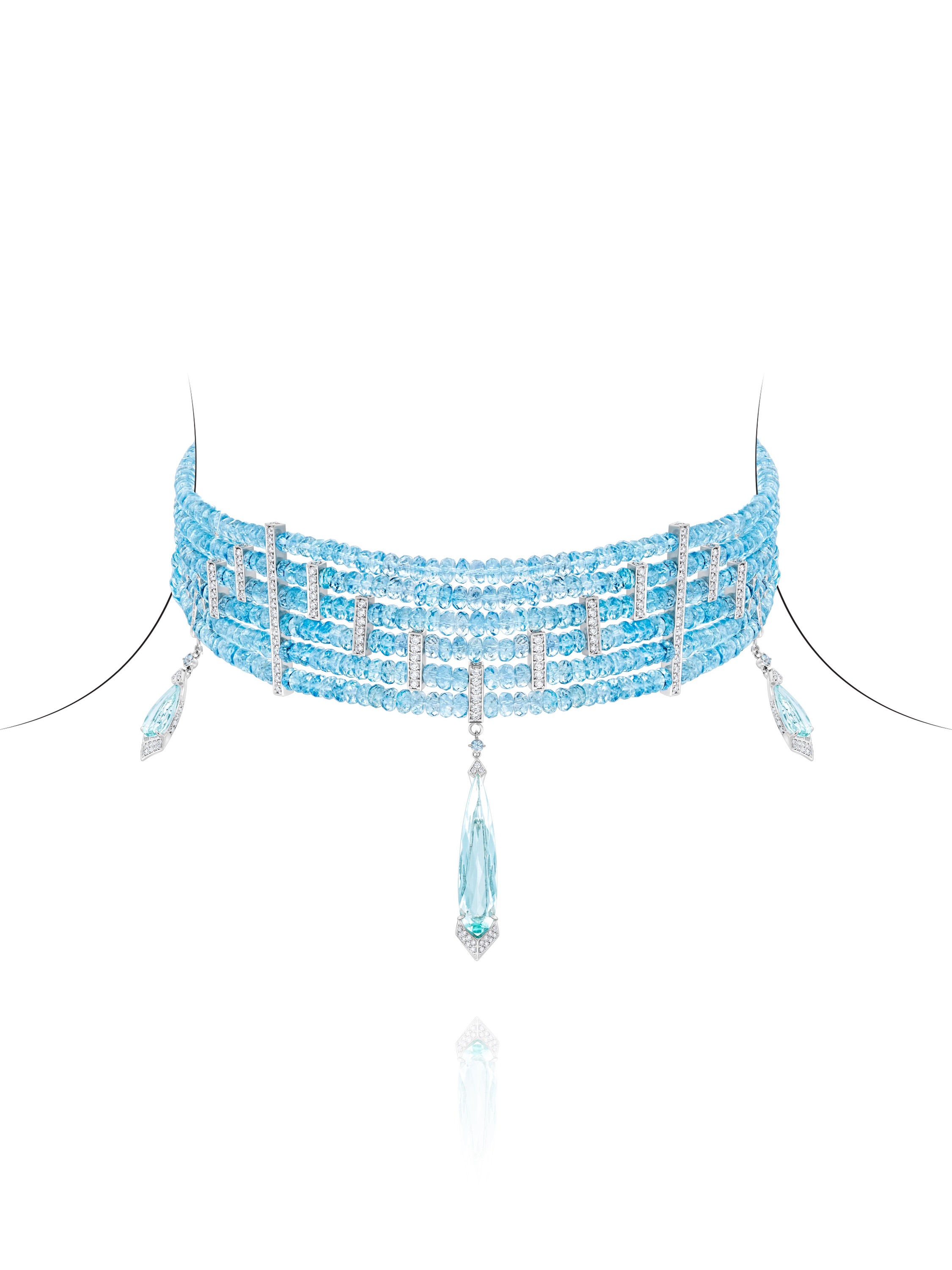 A white gold necklace set with 537 round diamonds with a total weight of 5.49 ct, 4 pear-cut aquamarines, 688 aquamarine beads with a total weight of 147.28 ct, 6 aquamarines with a total weight of 0.16 ct, 1 aquamarine weighing 0.89 ct, and 16 round diamonds with a total weight of 0.27 ct.